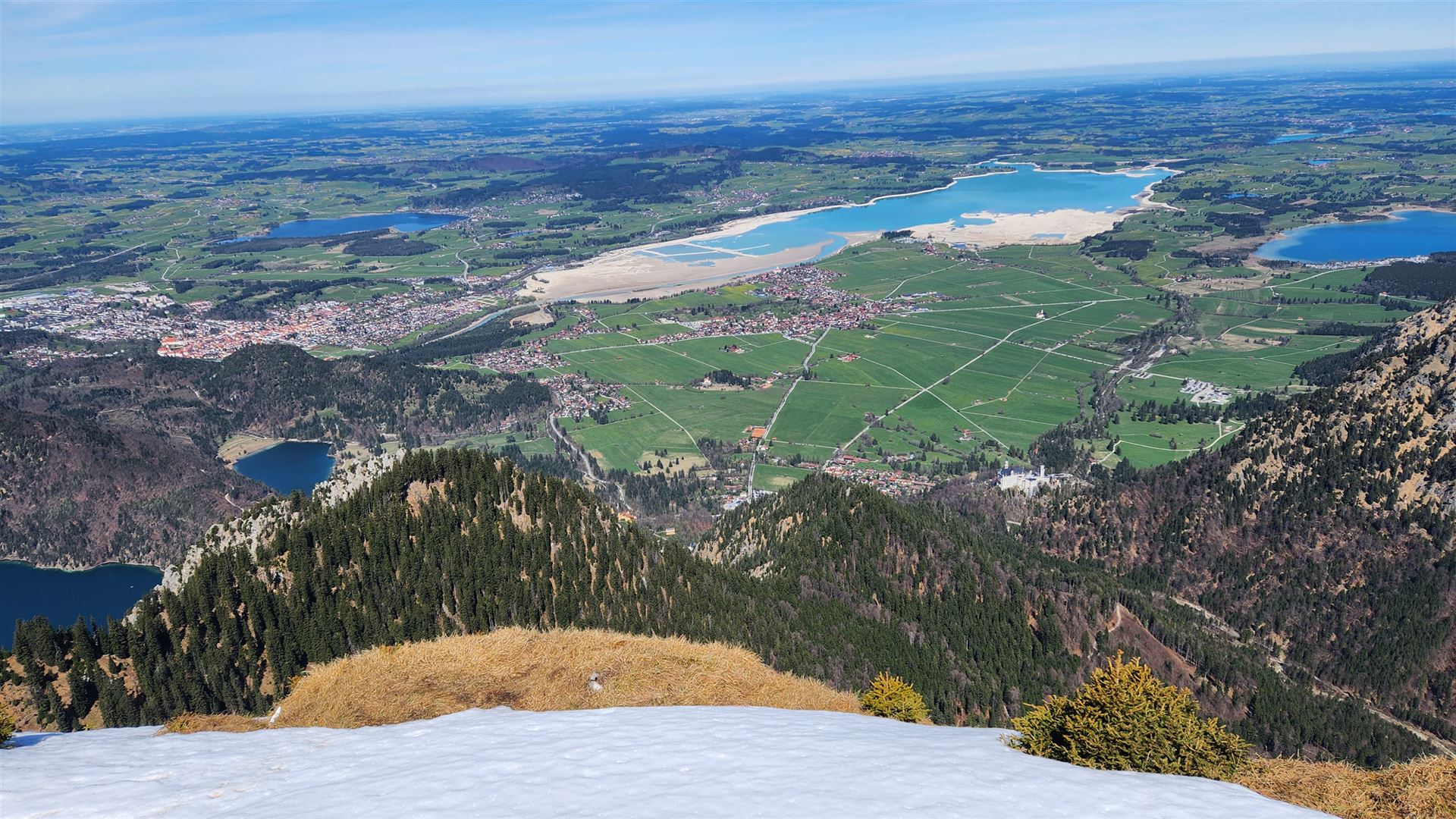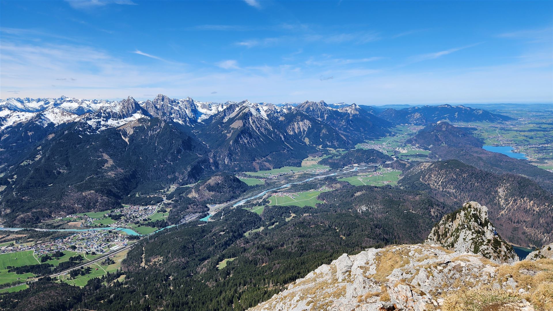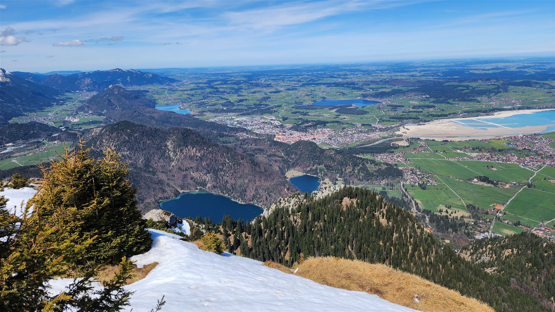 Im Westen liegen die Tannheimer Berge mit Gehrenspitze, Kellenspitze, Rote Flüh und Einstein, der Blick reicht sogar bis zum Säntis in der Ostschweiz. Außerdem zeichnet sich der Vilser Berg ab, wo sich das Juwel Alatsee im Wald versteckt. Rechts daneben in der Ebene liegt der Weißensee.
