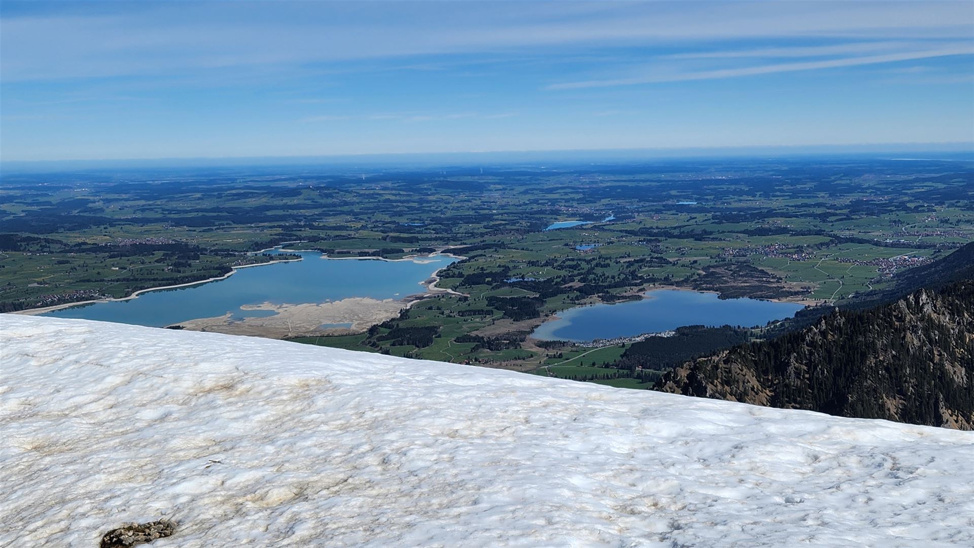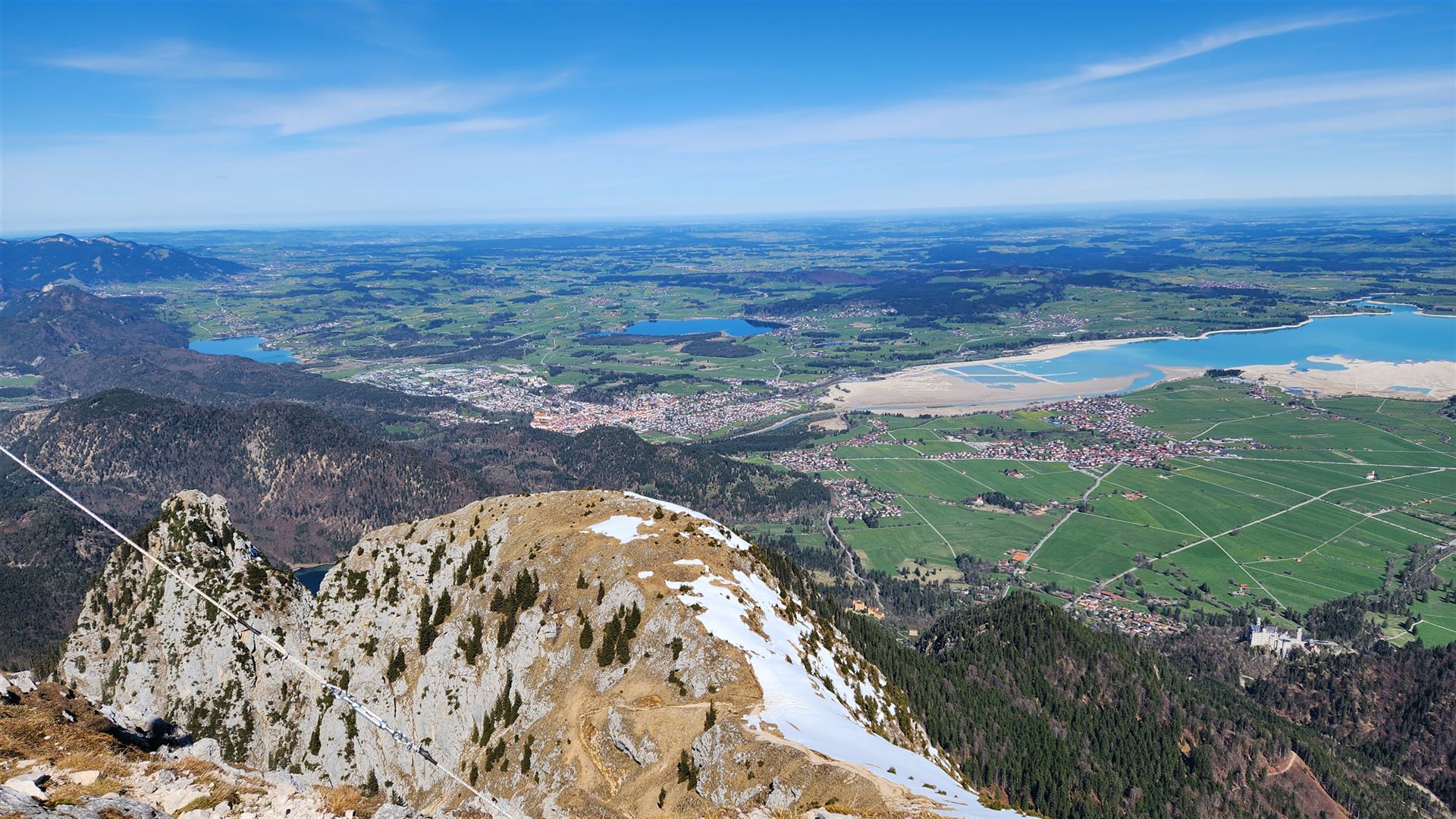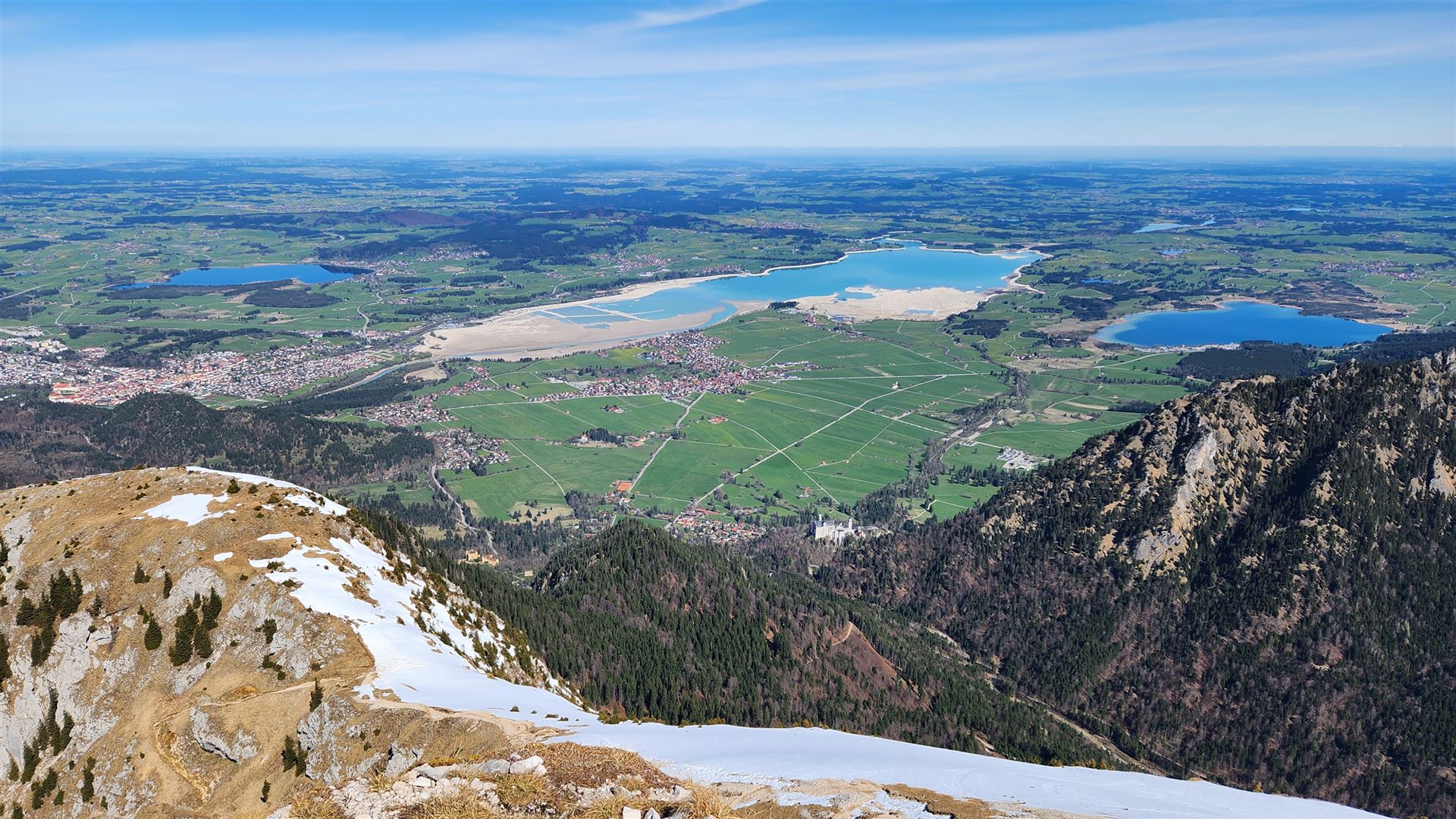 Im Westen liegen die Tannheimer Berge mit Gehrenspitze, Kellenspitze, Rote Flüh und Einstein, der Blick reicht sogar bis zum Säntis in der Ostschweiz. Außerdem zeichnet sich der Vilser Berg ab, wo sich das Juwel Alatsee im Wald versteckt. Rechts daneben in der Ebene liegt der Weißensee.