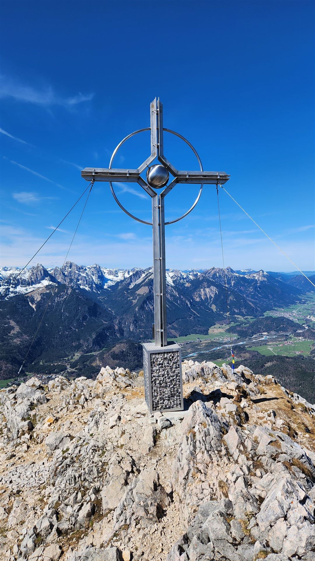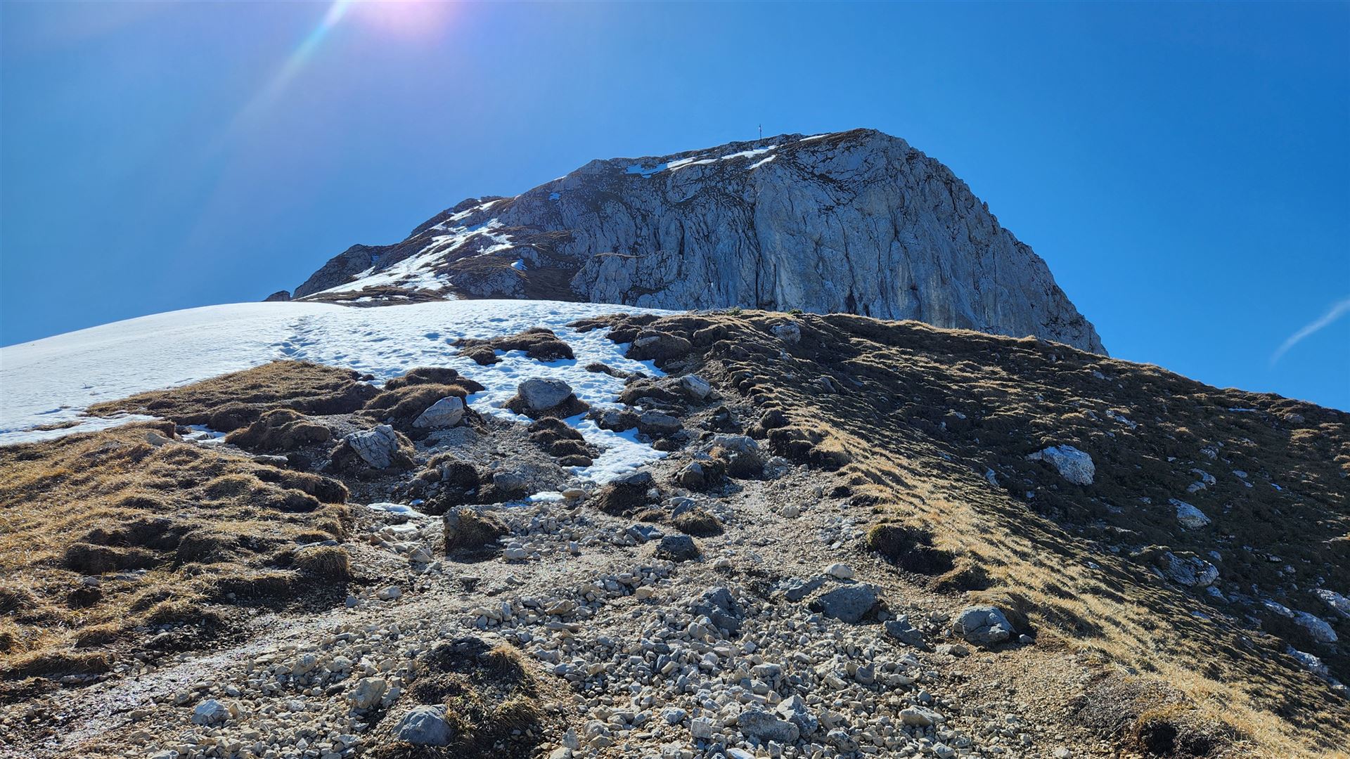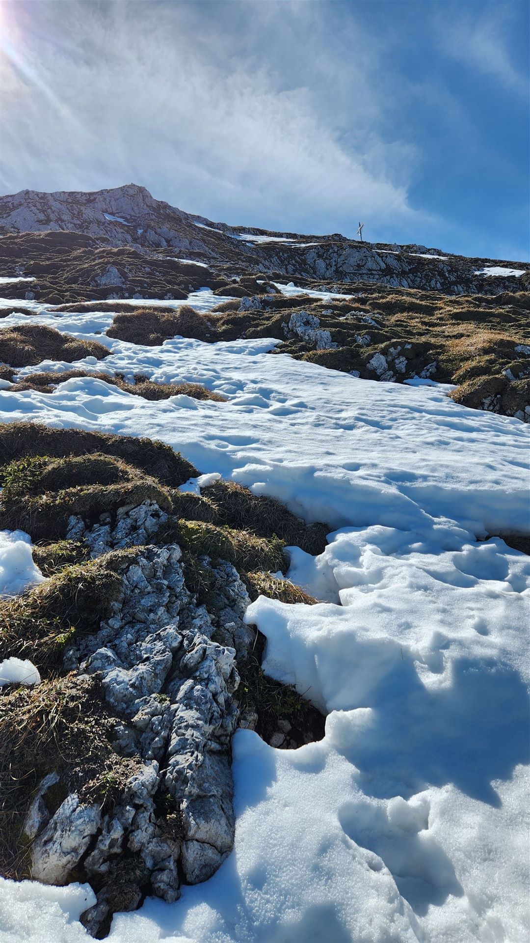 Vom Sattel geht es nach rechts über die Gamswiese Richtung Gipfel. Es lag noch Restschnee am Hang und die Wegfindung war nicht ganz leicht, aber auch nicht gefährlich. Man musste einfach nur etwas aufpassen. Schließlich erreichte ich den Gipfel mit seinem wunderschönen Gipfelkreuz.