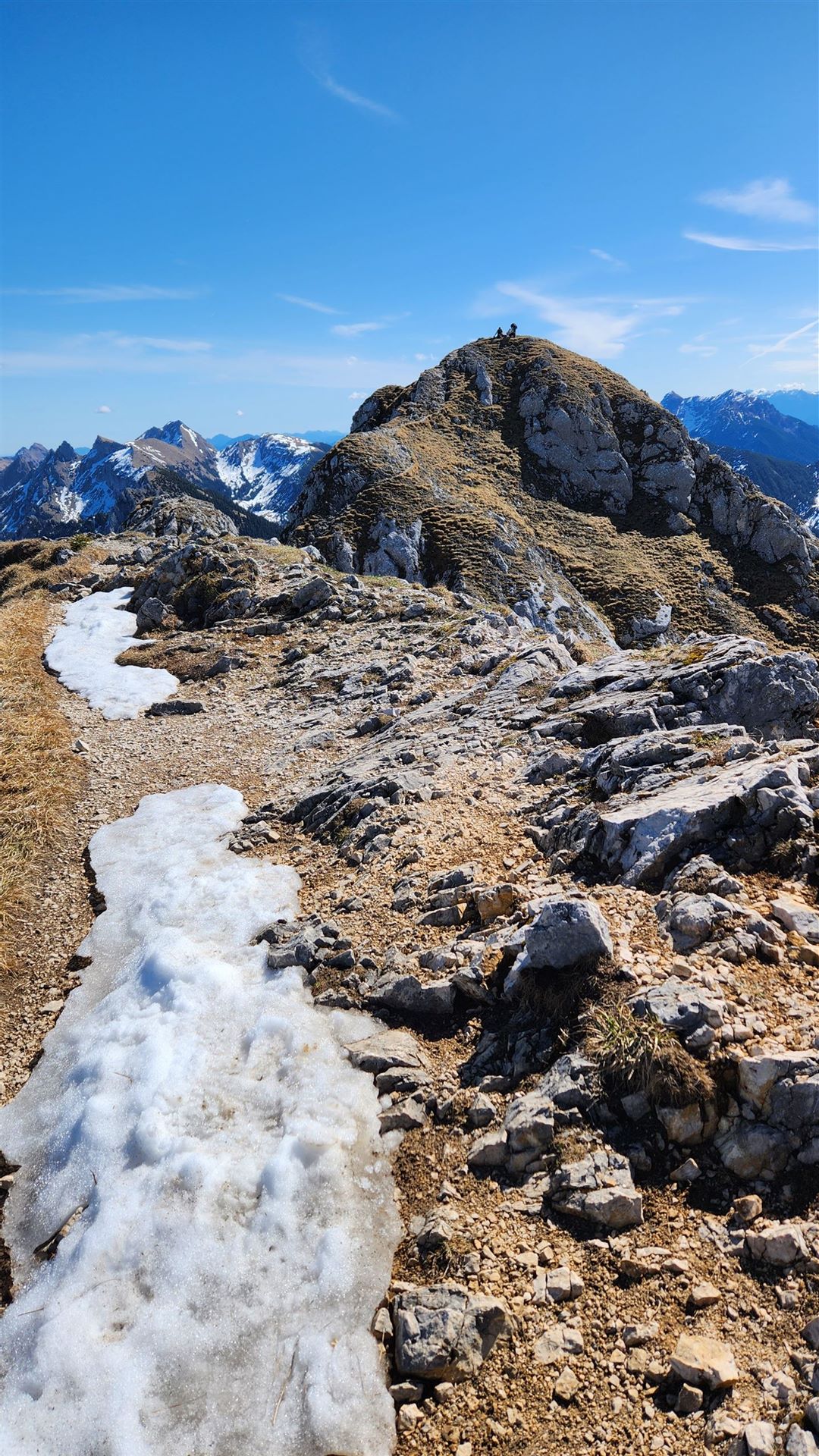 Bis zum Gipfel ist es nochmals eine Stunde. Zunächst erreicht man den Sattel, wo der Steig von Hohenschwangau heraufkommt. Nordseitig lag heute aber noch viel Schnee, so dass der steile Steig später für den Abstieg zu gefährlich gewesen wäre. Es war auch nichts gespurt. Das hatte wohl seinen Grund. Deshalb habe ich auf dem Rückweg von einer Überschreitung abgesehen.