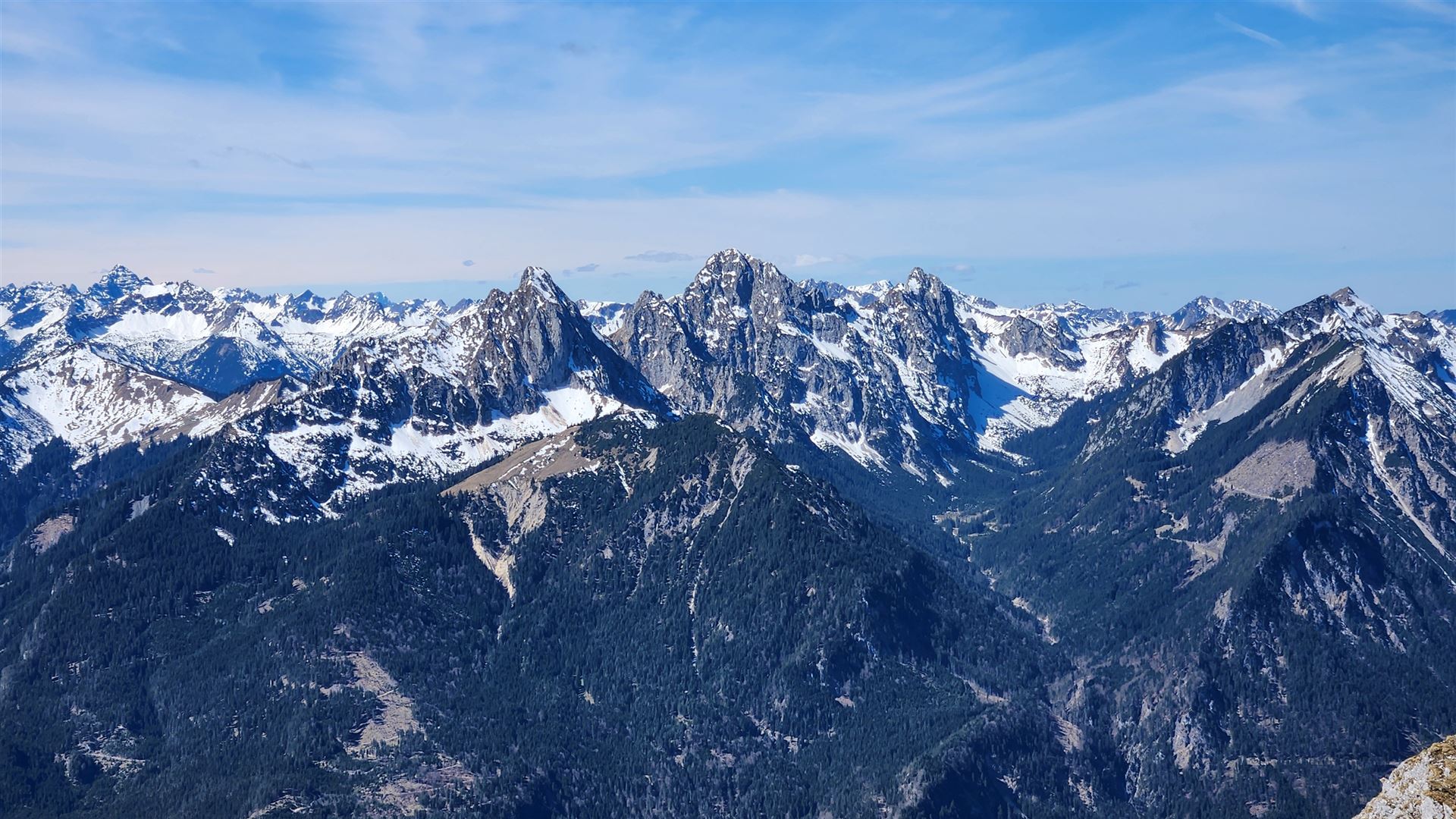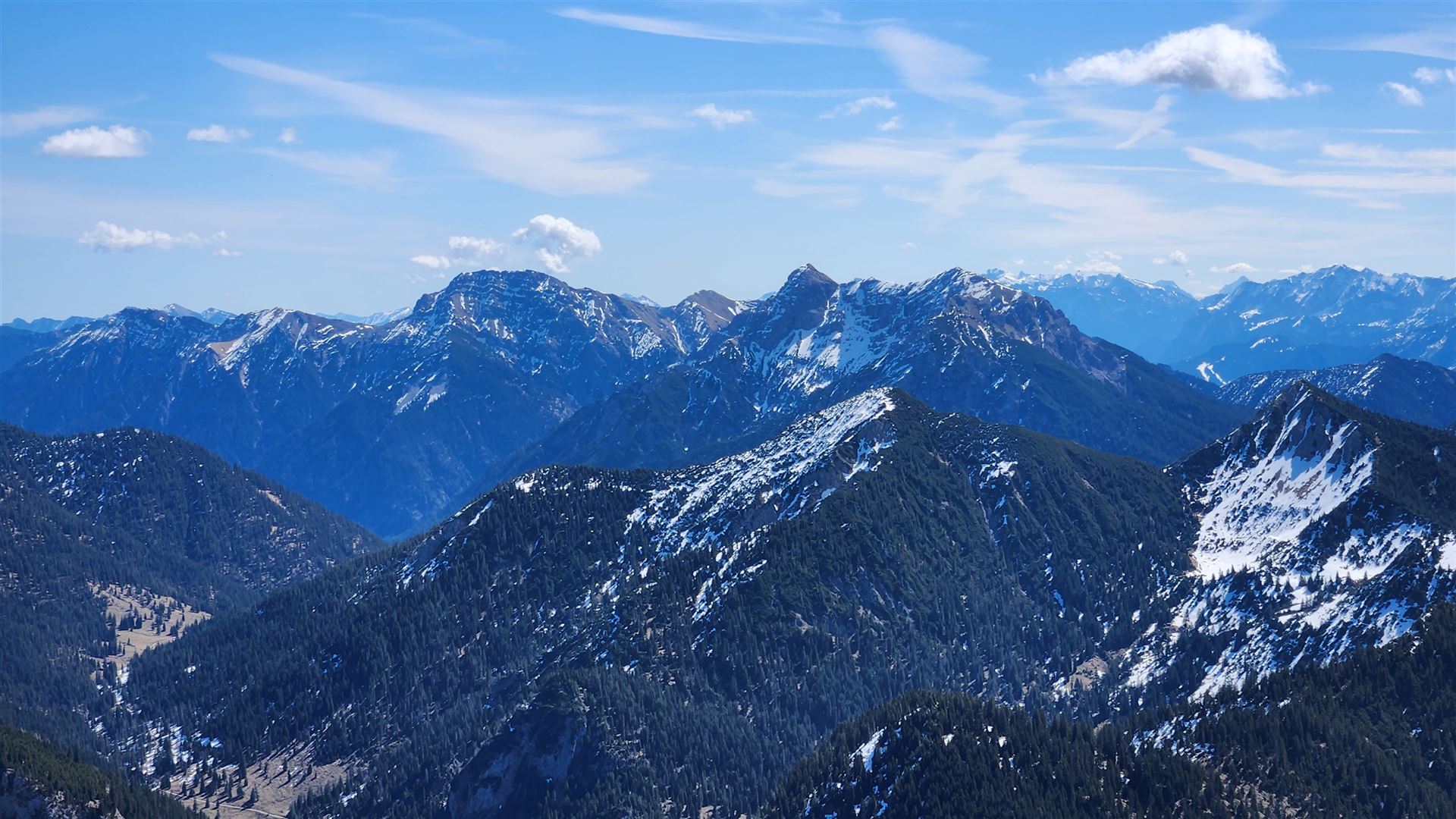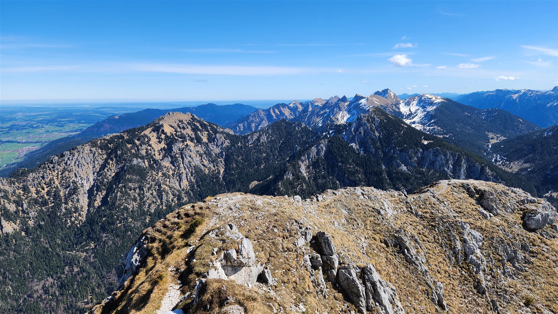 Das Gipfelkreuz steht allerdings nicht am höchsten Punkt, sondern auf dem Vorgipfel mit 2039 Meter Höhe auf dem Kreuz steht allerdings „2047 m“. Daneben befindet sich ein Grenzstein Bayern-Österreich mit der Jahreszahl 1956. Vom Gipfelkreuz gelangt man unschwer hinüber zum höchsten Punkt auf 2047 m, den allerdings nur ein Steinhaufen ziert. Nach der österreichischen Messung sollen es 2048 Meter sein. Wie dem auch sei, die Aussicht ist fantastisch.
