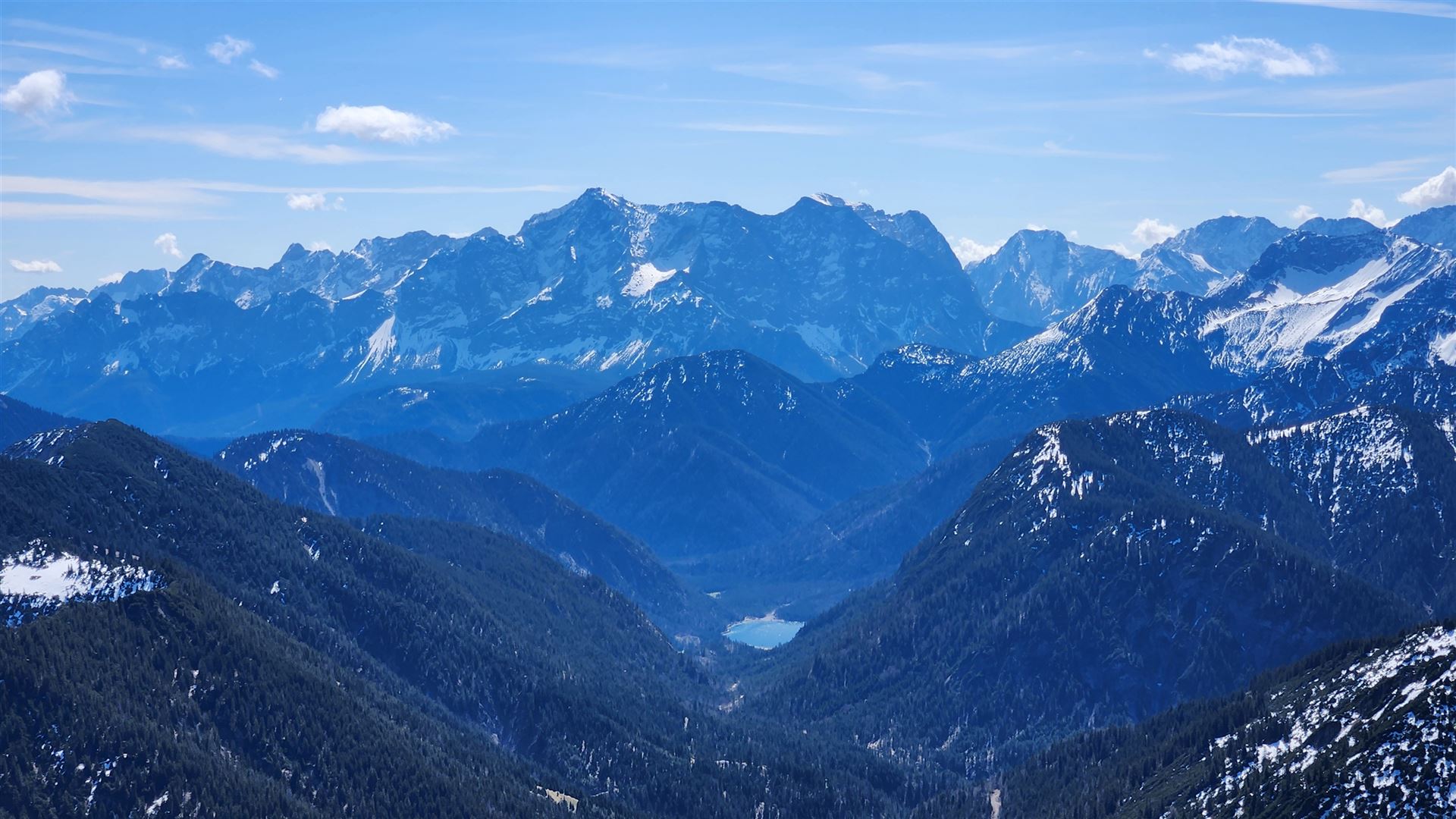 Im Osten breiten sich die Ammergauer Alpen aus, vom Tegelberg über den Geiselstein, die Große Klammspitze, die Hochplatte, die Kreuzspitze und die Geierköpfe. Im Estergebirge ist der Krottenkopf als höchster Gipfel auszumachen sowie die Benediktenwand. Vor der Zugspitze ist der nördliche Ausläufer des Plansees zu sehen, außerdem der Daniel.