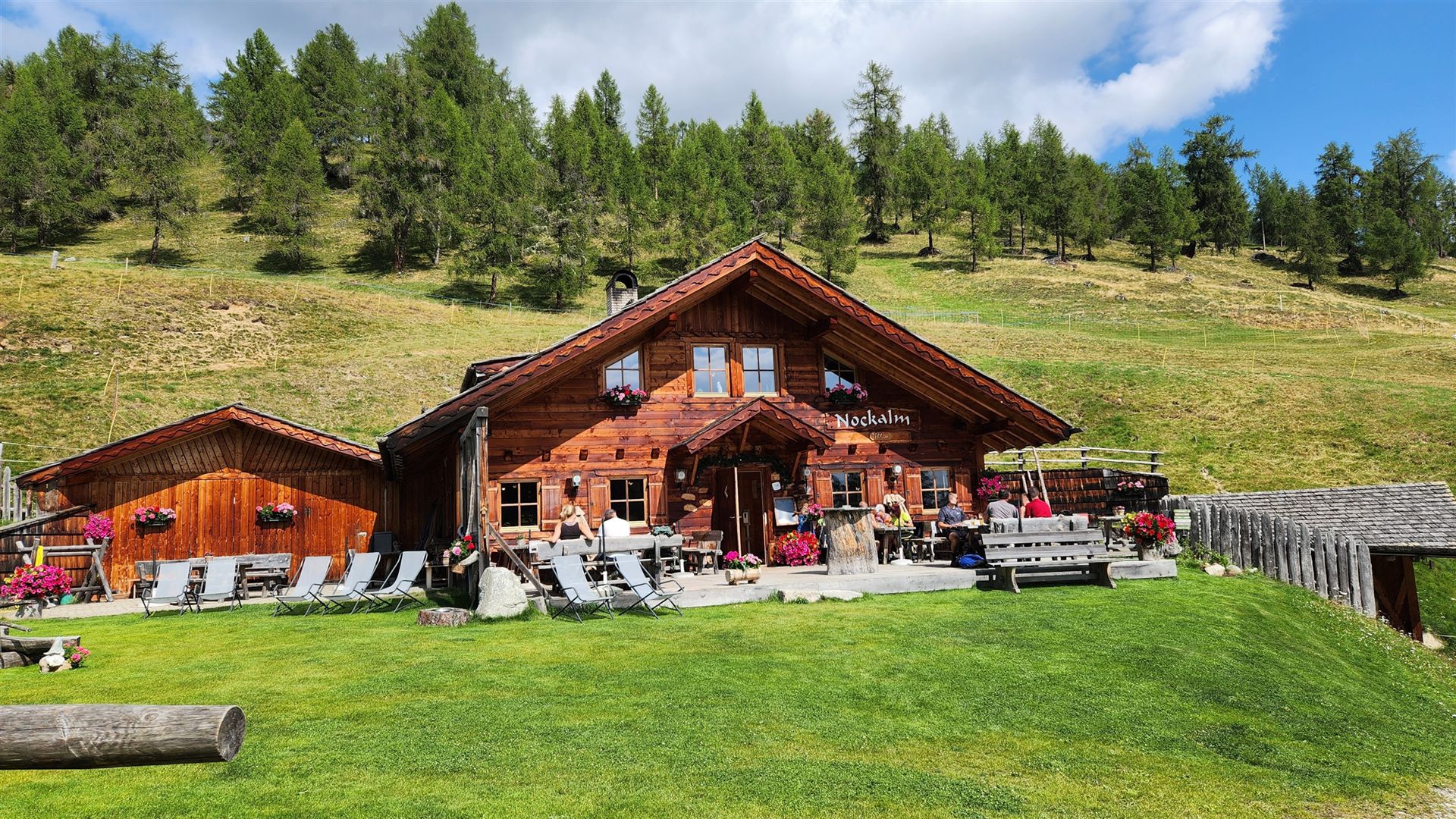 Der Steig beginnt gleich hinter der Talstation, ein wahrlich schöner Steig durch den Wald. Von der idyllischen Nockalmhütte auf 1766 m zieht der Weg hinauf zum Valler Jöchl, das ich seinerzeit von der anderen Seite erreichte. Von dort sind es nur noch 10 Minuten zur Bergstation. Da ich es ziemlich sportlich angehen ließ, traf ich nach 90 Minuten ein, bei normalem Tempo benötigt man 2 Stunden. An der Bergstation verbrachte die Familie ihre Zeit inzwischen auf dem Spielplatz mit kleinem Kletterturm.