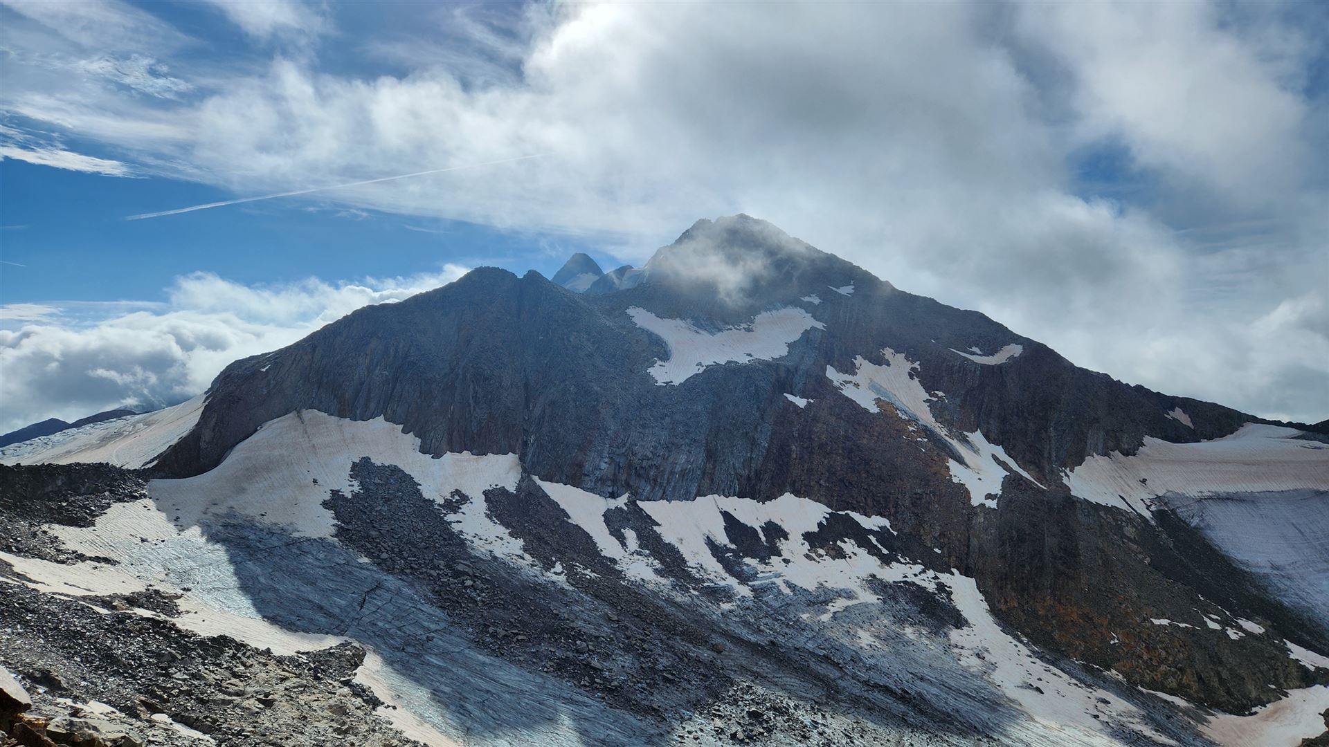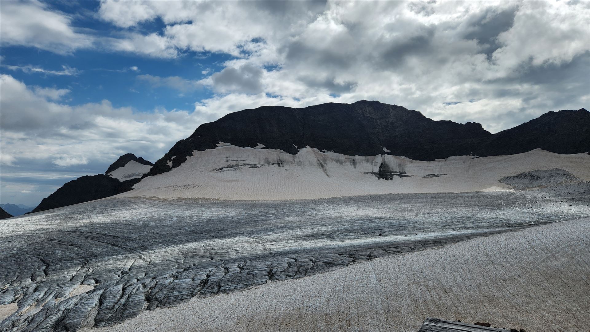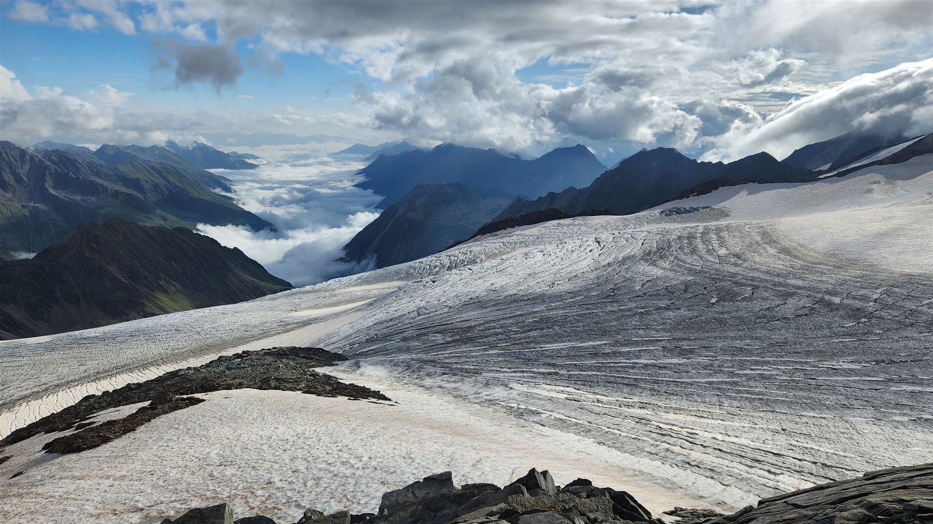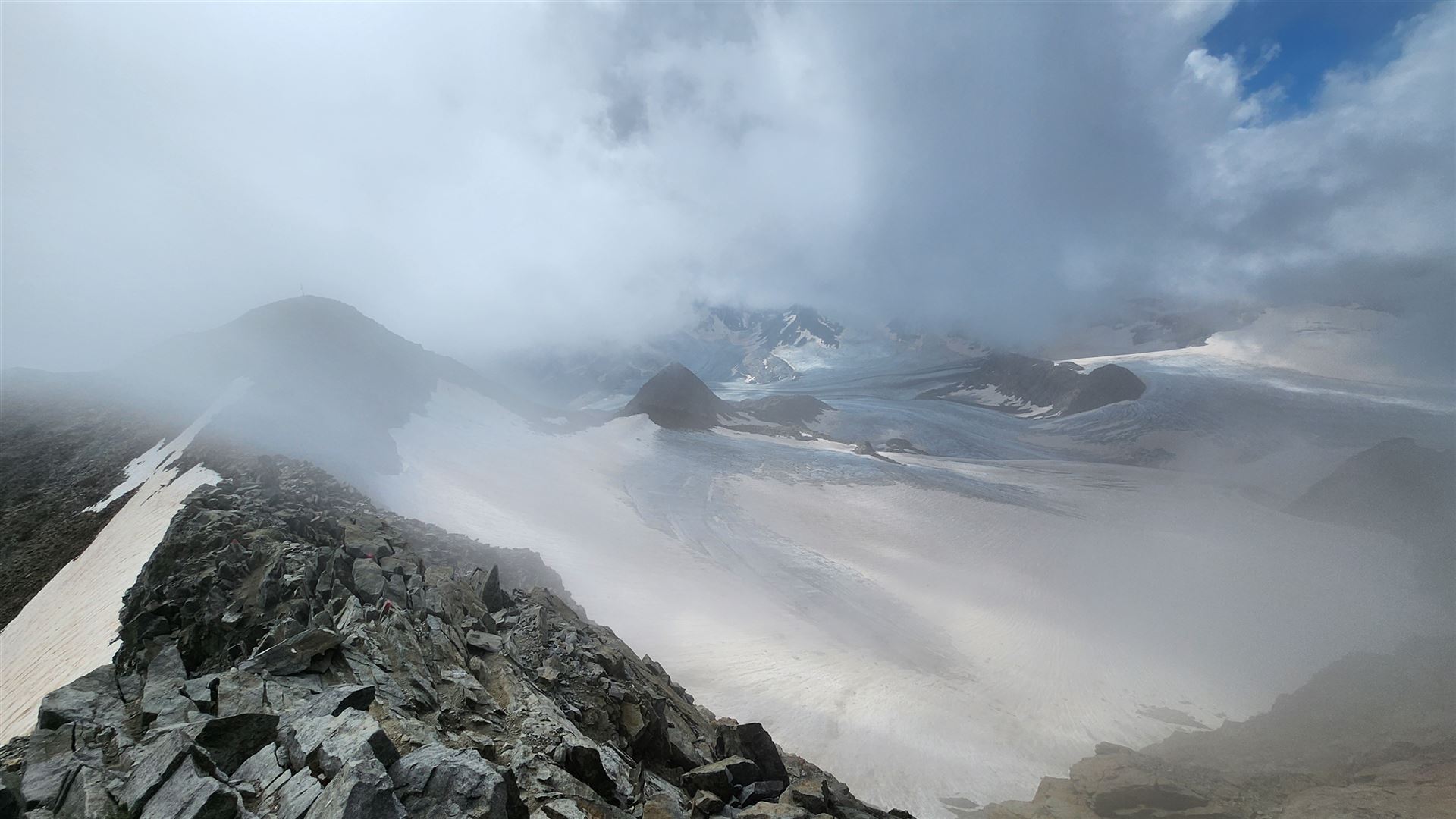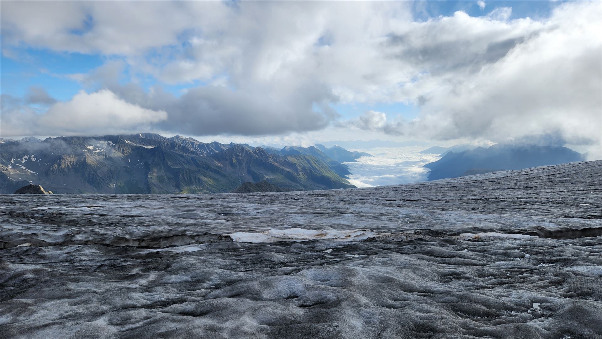 Leider waren die Sicht und vor allem die Fernsicht ziemlich eingeschränkt. Nach wochenlangem Sommerwetter war ausgerechnet an diesem Wochenende schlechteres Wetter angesagt. Aber zwischendurch riss die Wolkendecke immer wieder auf und ermöglichte schöne Ausblicke auf die umliegenden Berge und Gletscher.