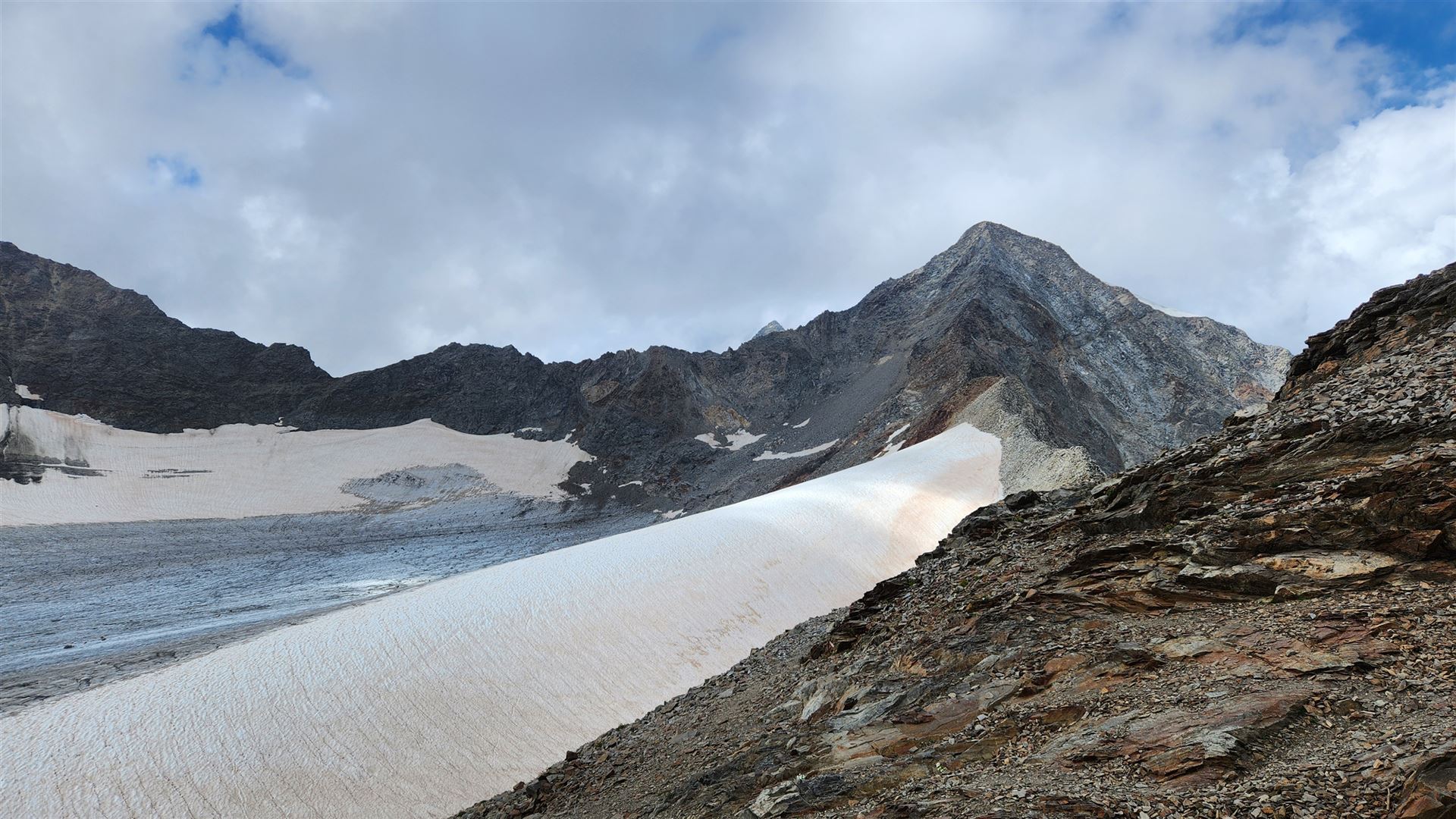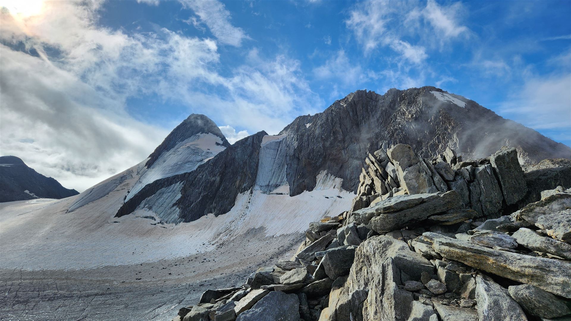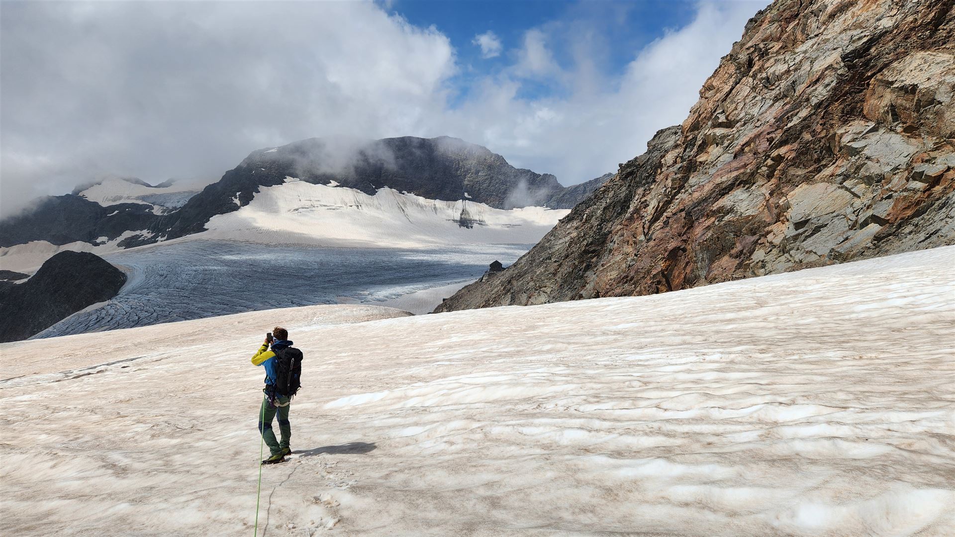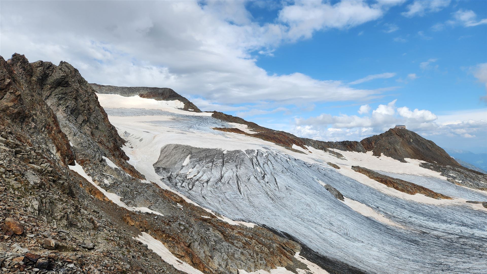 Leider waren die Sicht und vor allem die Fernsicht ziemlich eingeschränkt. Nach wochenlangem Sommerwetter war ausgerechnet an diesem Wochenende schlechteres Wetter angesagt. Aber zwischendurch riss die Wolkendecke immer wieder auf und ermöglichte schöne Ausblicke auf die umliegenden Berge und Gletscher.