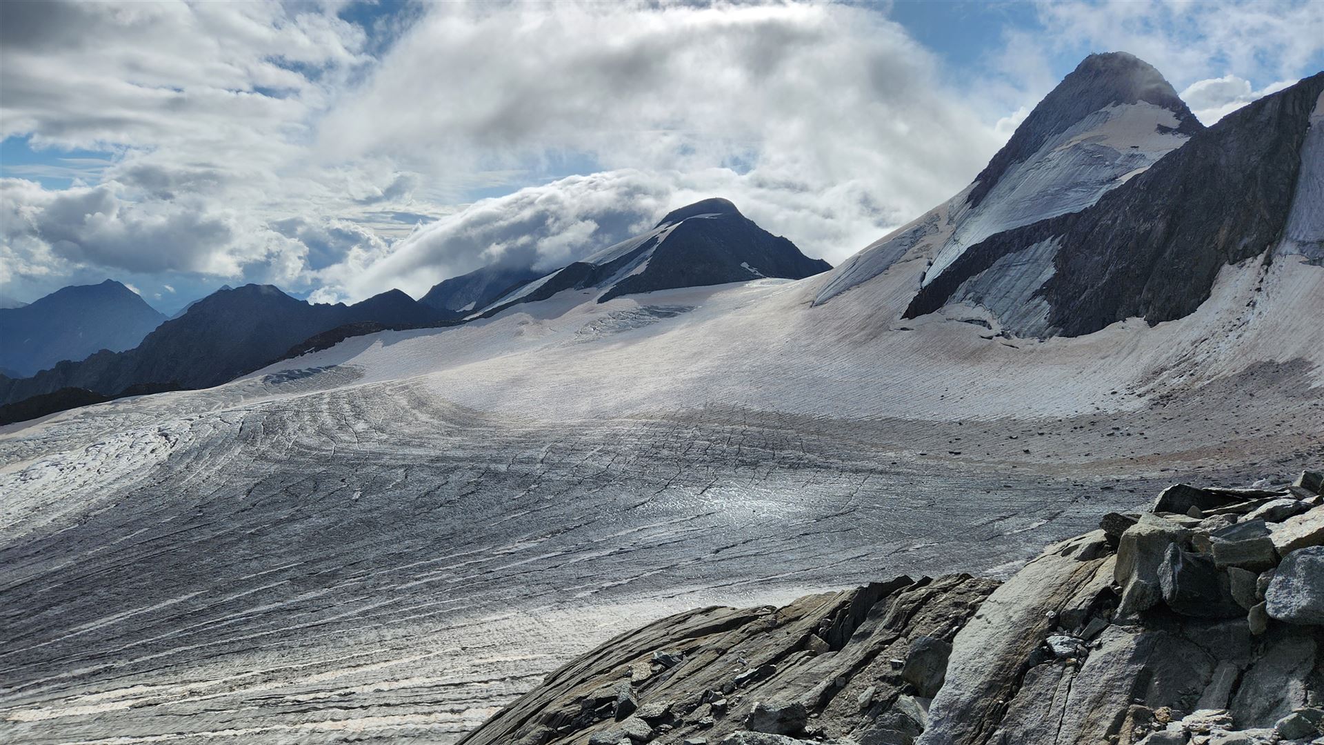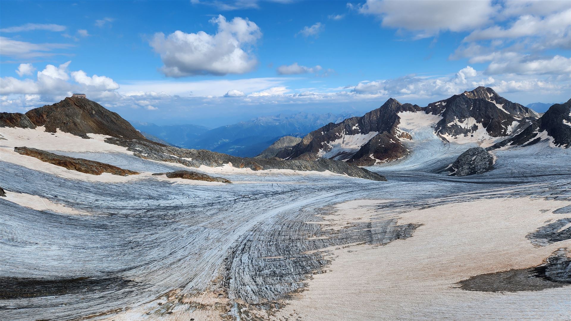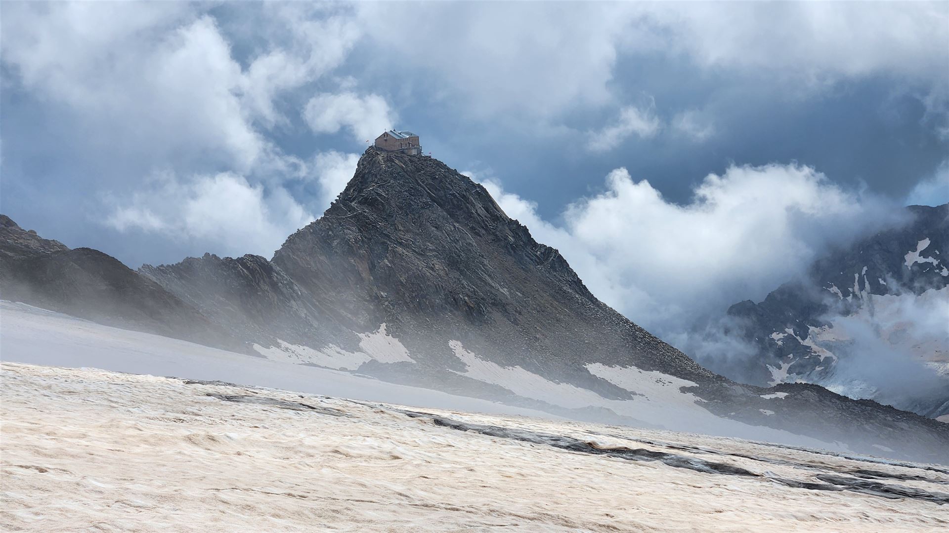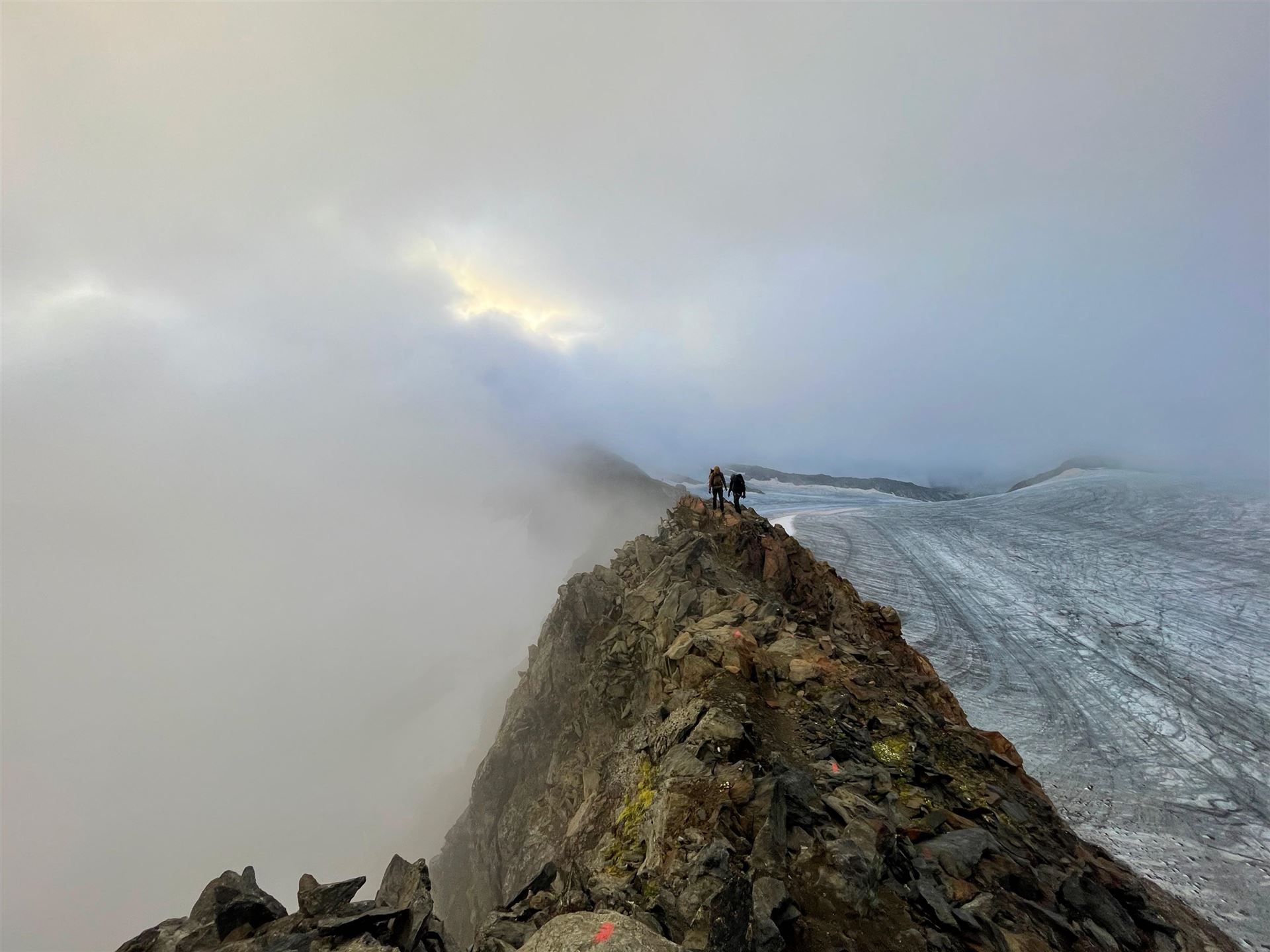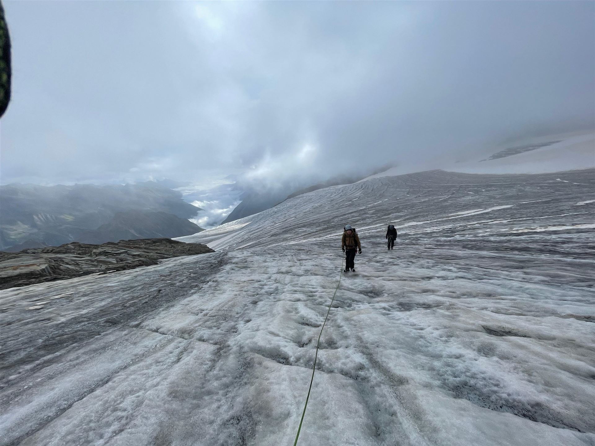 Leider waren die Sicht und vor allem die Fernsicht ziemlich eingeschränkt. Nach wochenlangem Sommerwetter war ausgerechnet an diesem Wochenende schlechteres Wetter angesagt. Aber zwischendurch riss die Wolkendecke immer wieder auf und ermöglichte schöne Ausblicke auf die umliegenden Berge und Gletscher.