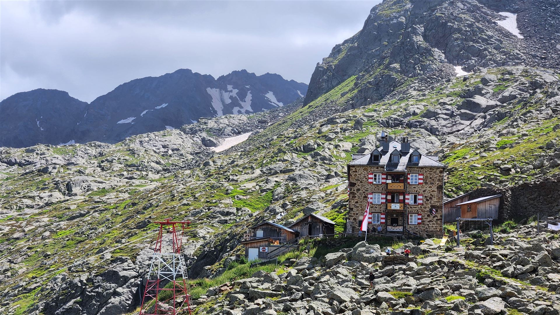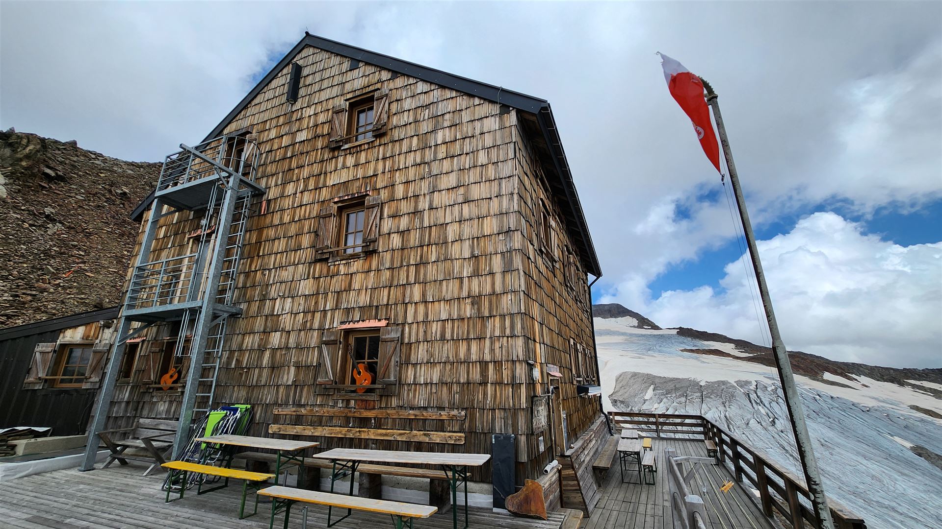 Die Müllerhütte (Rifugio Cima Libera) liegt auf 3145 m umgeben von Gletschern. Es gibt keine Möglichkeit, die Hütte ohne Gletscherüberquerung zu erreichen. Der direkte Grat vom Wilden Freiger ist eine andere Hausnummer und m.E. keine offizielle Route. Die Bewirtschaftung der Müllerhütte ist deshalb eine Herausforderung. Aus diesem Grund gibt es auch keine Duschen, geschweige denn warme Duschen. Zum Waschen rinnt das kalte Wasser nur langsam aus dem Wasserhahn. In dieser exponierten Lage muss mit den Ressourcen eben sparsam umgegangen werden. Der Blick von der Hütte über die weite Gletscherlandschaft ist dafür umso fantastischer. Gegenüber thront das Becherhaus auf dem gleichnamigen Becher. Im Westen überragt die Sonklarspitze den Gletscher. Der Wilde Freiger ist von der Müllerhütte aus nicht mehr zu sehen, lediglich der Signalgipfel ist nicht verdeckt. Nicht zuletzt ist von der Müllerhütte der Grat zum Wilden Pfaff zu sehen, unser erster Gipfel für den kommenden Tag. Und eigentlich muss es nicht erwähnt werden: Das Essen auf der Hütte war sehr gut. Ich habe manchmal den Eindruck, dass das Essen umso besser wird, je höher man hinauf kommt. Allen Hüttenwirten kann ich nur ein Lob aussprechen. Es wird auf nachhaltige und regionale Küche gesetzt, um die Gäste zu verwöhnen. Manchmal habe ich ein schlechtes Gewissen, denn es ist ein gewaltiger Aufwand für die Pächter.