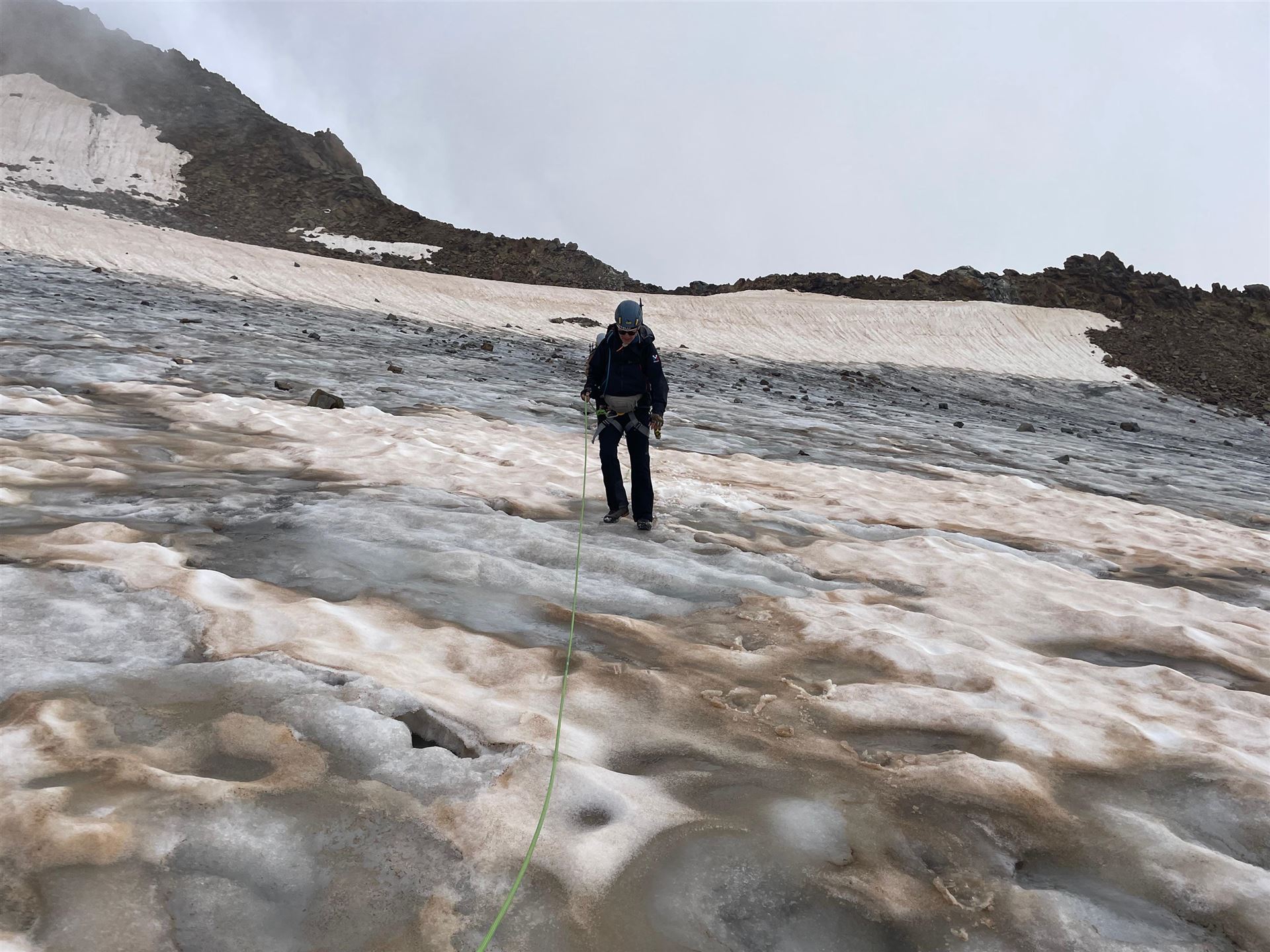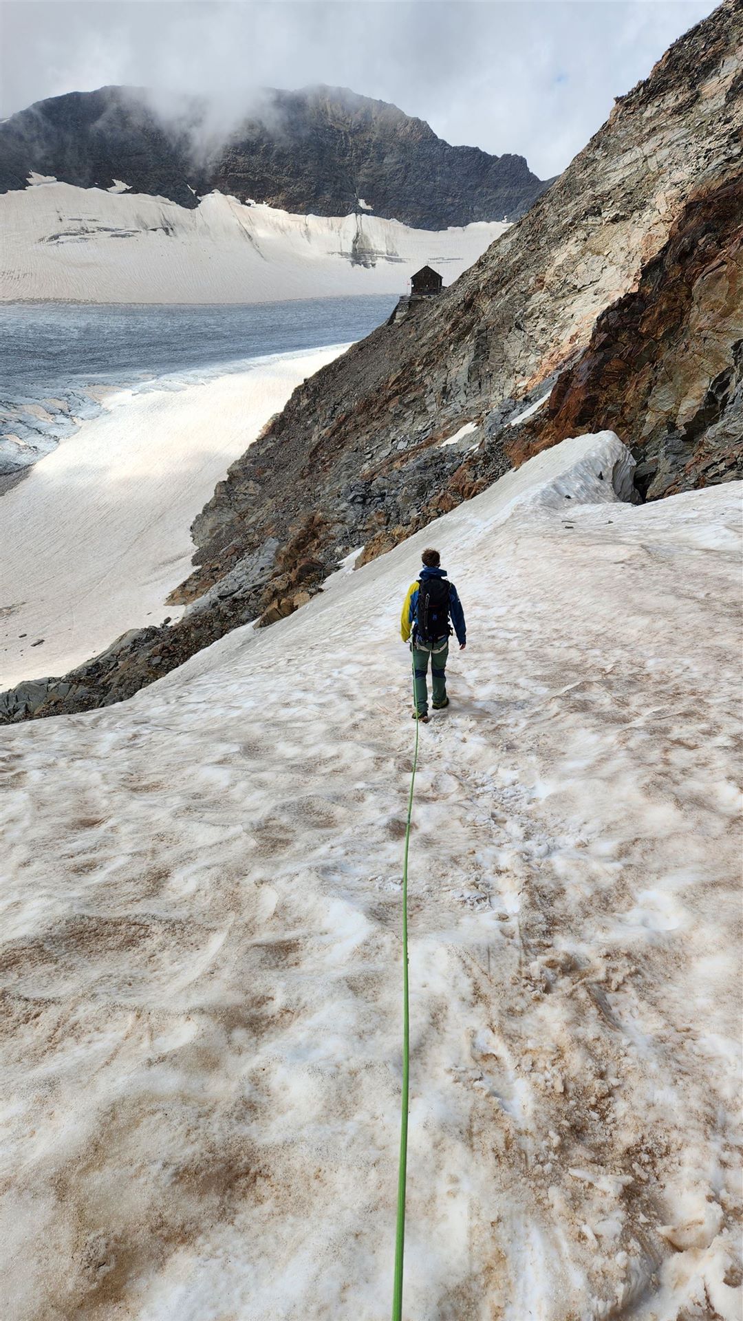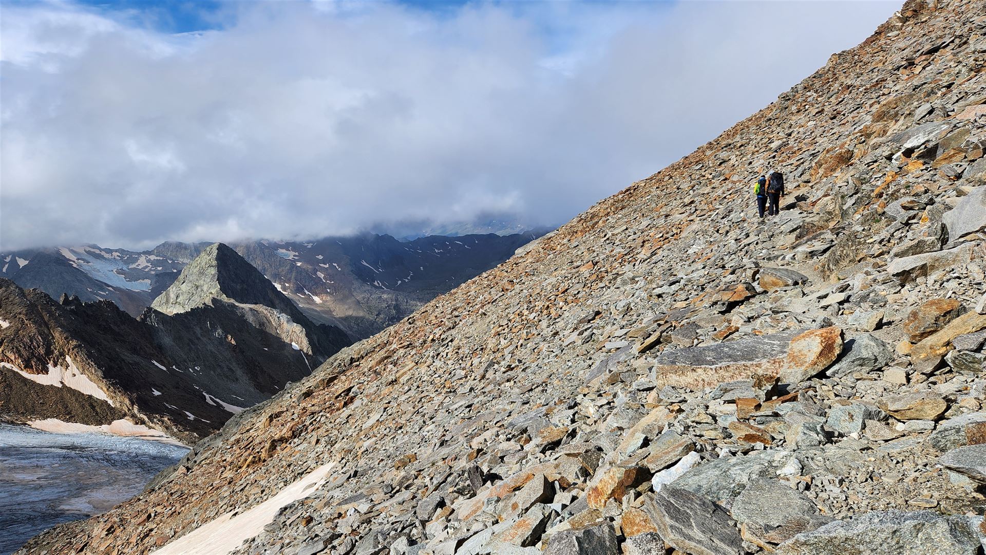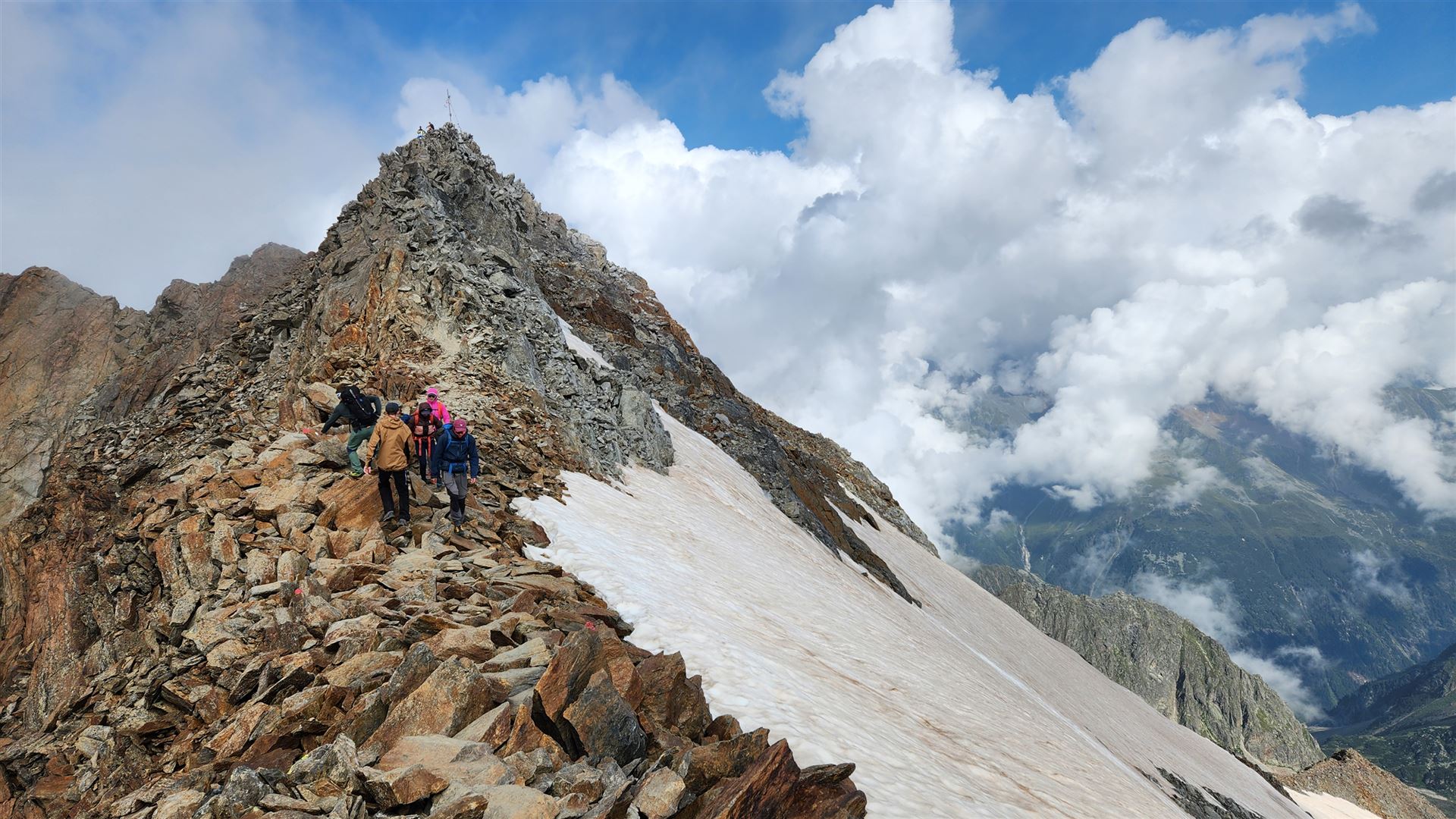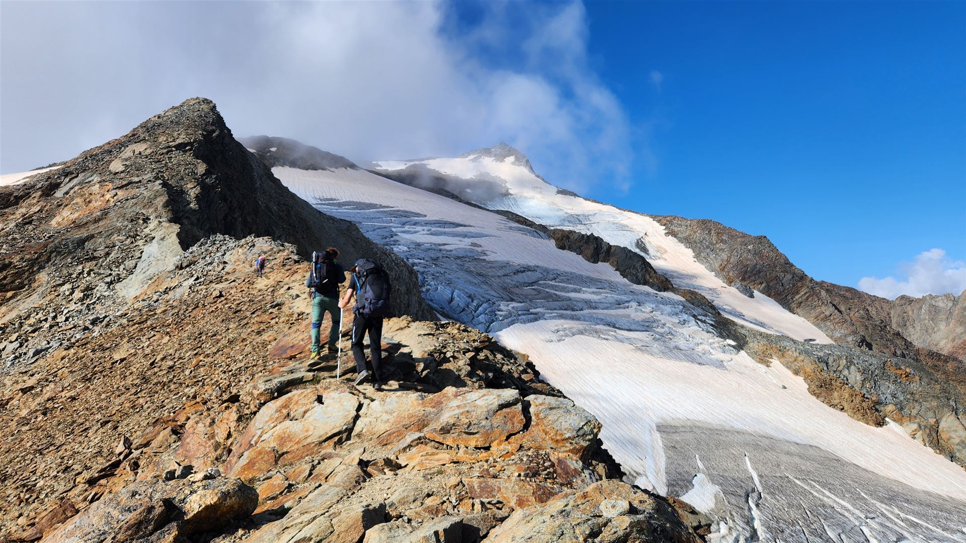 Wir gingen den Grat zurück und über den unauffälligen Signalgipfel (Funkmast auf 3392 m) bergab Richtung Becherhaus, der höchstgelegenen Schutzhütte Südtirols. Auf diesem steilen Grat nahm uns der Bergführer ans Seil.
