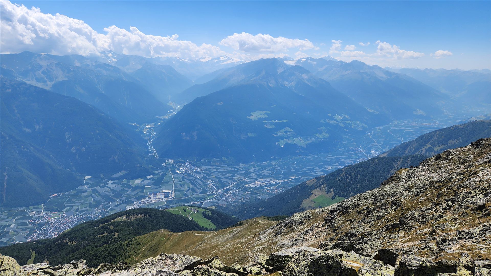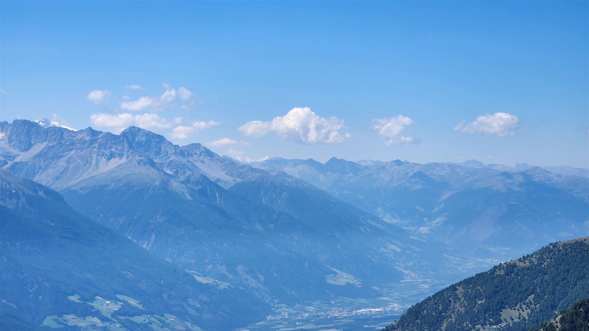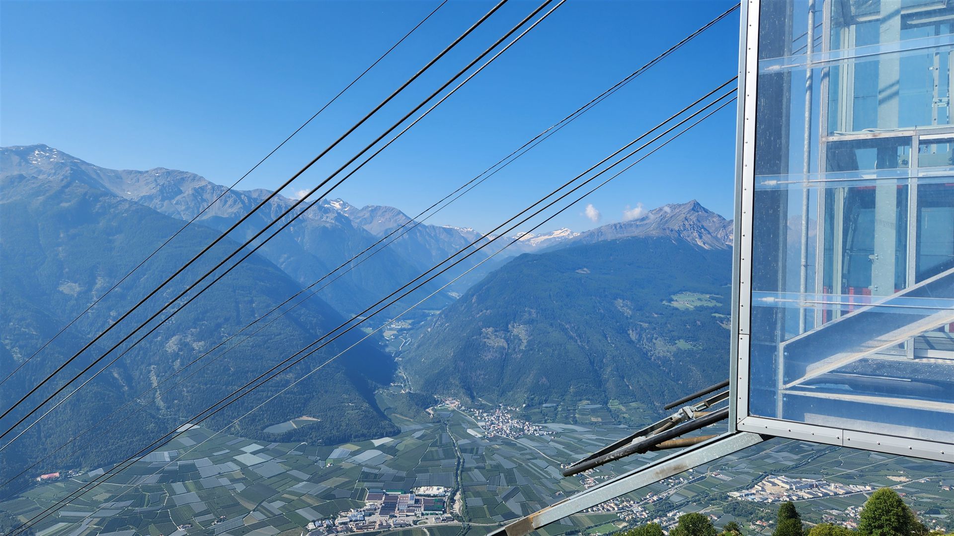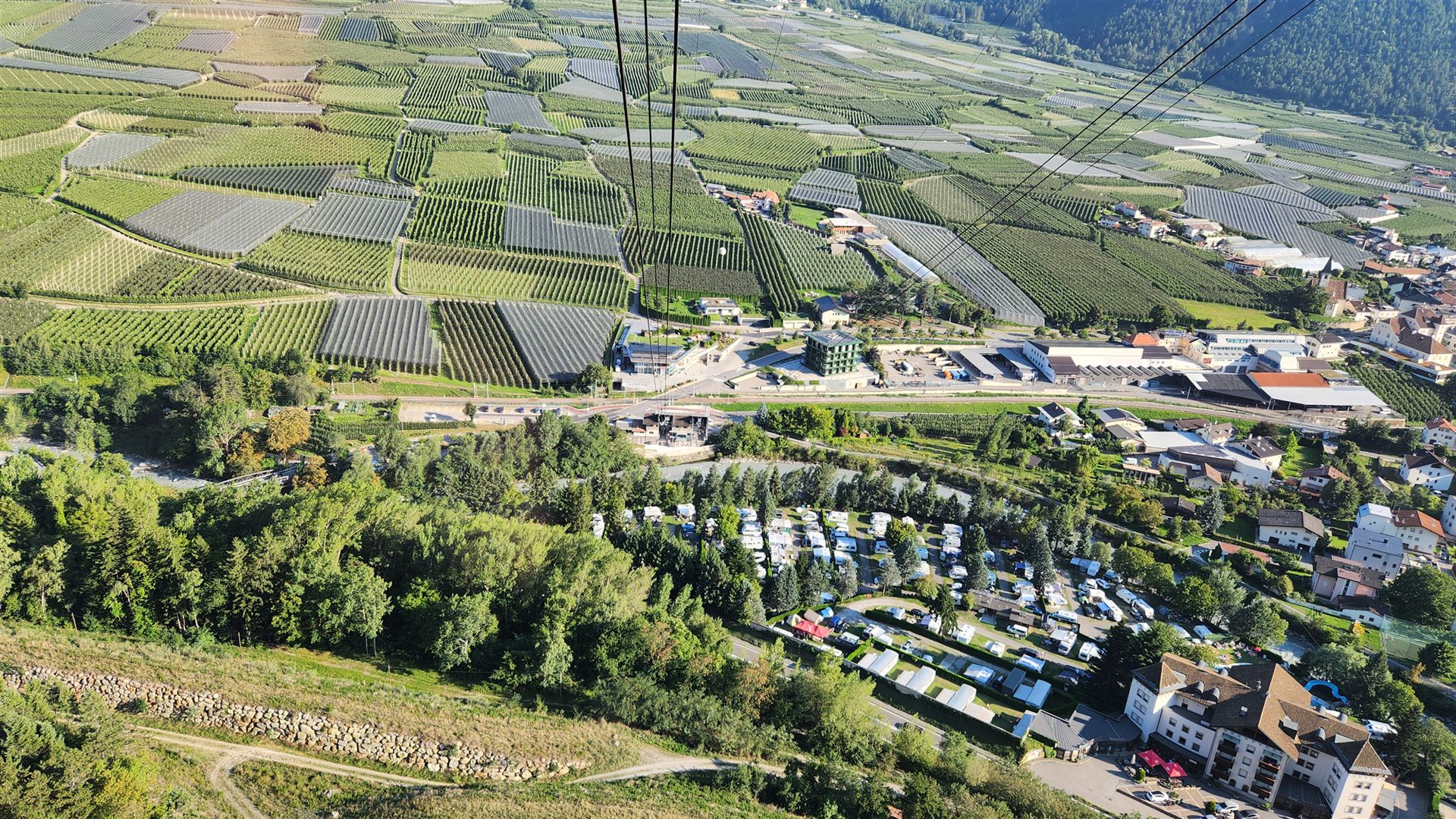 Der Campingplatz an der Etsch in Latsch (639 m) im Vinschgau ist optimaler Ausgangspunkt für eine Tour auf die 2929 Meter hohe Vermoispitze, den Vinschgauer Sonnenberg. Gleich um die Ecke des Campingplatzes befindet sich die Talstation der kleinen Gondelbahn St. Martin. Die Gondel fuhr zufällig sogar über unseren Stellplatz auf dem Campingplatz hinweg.