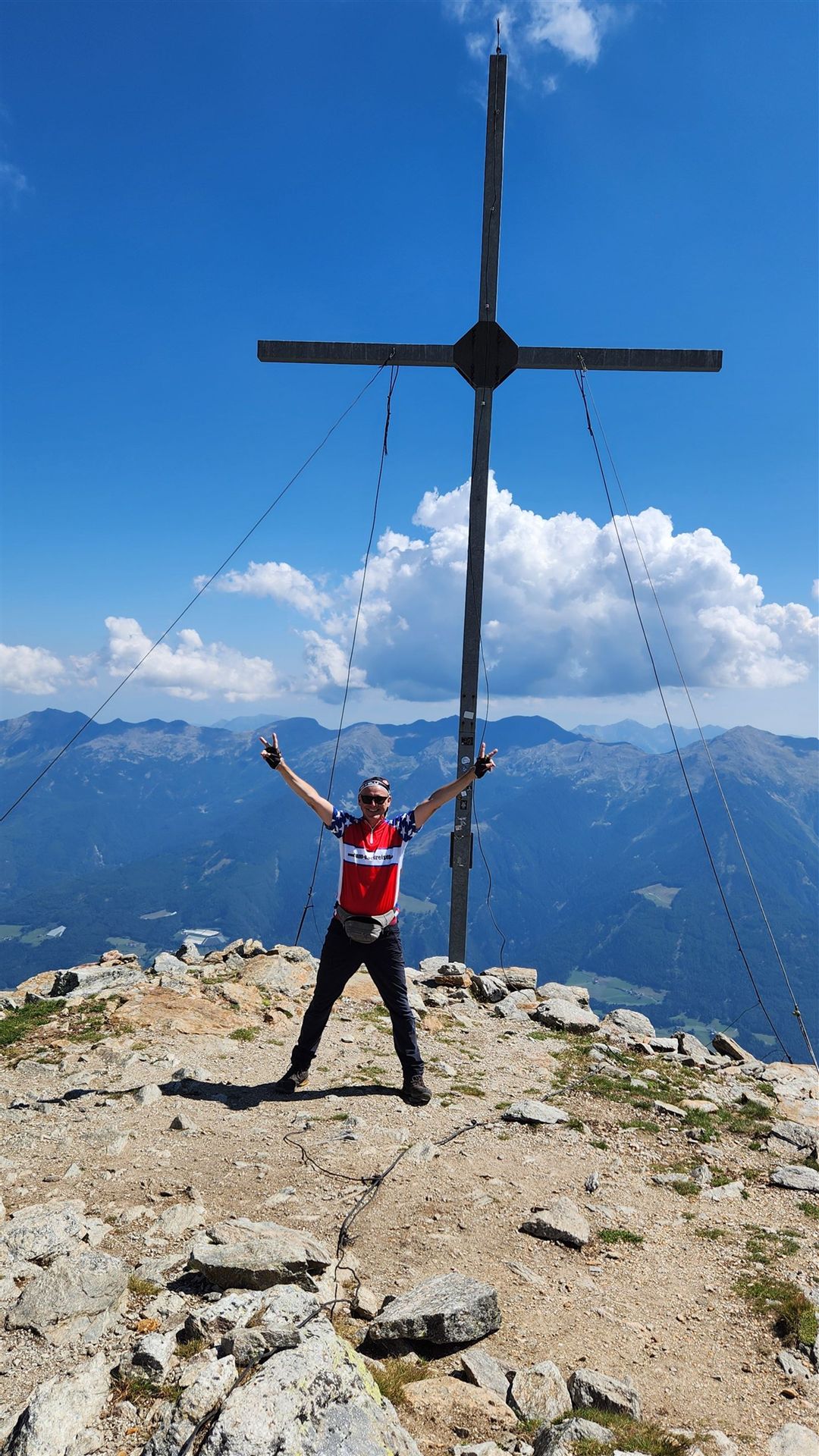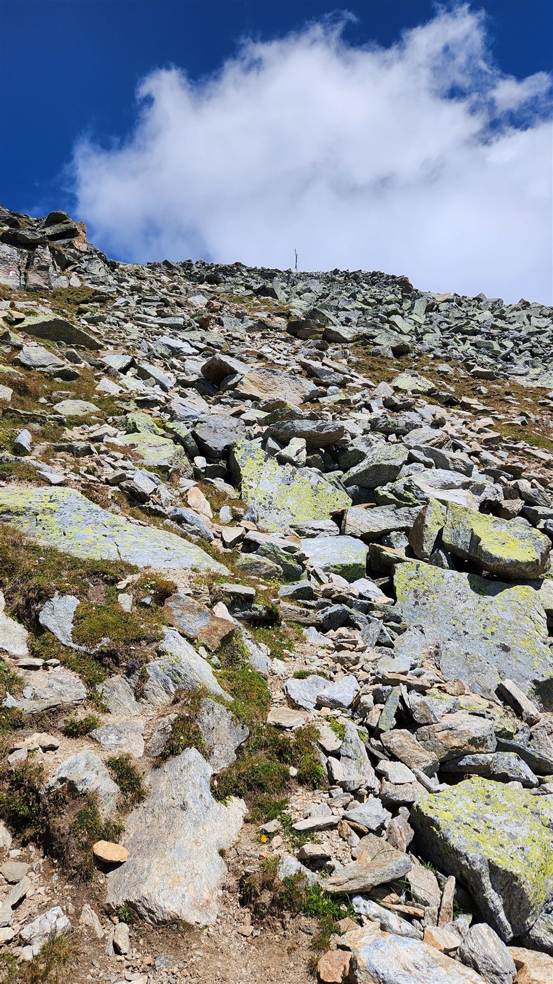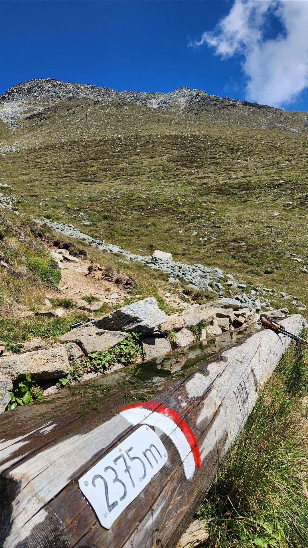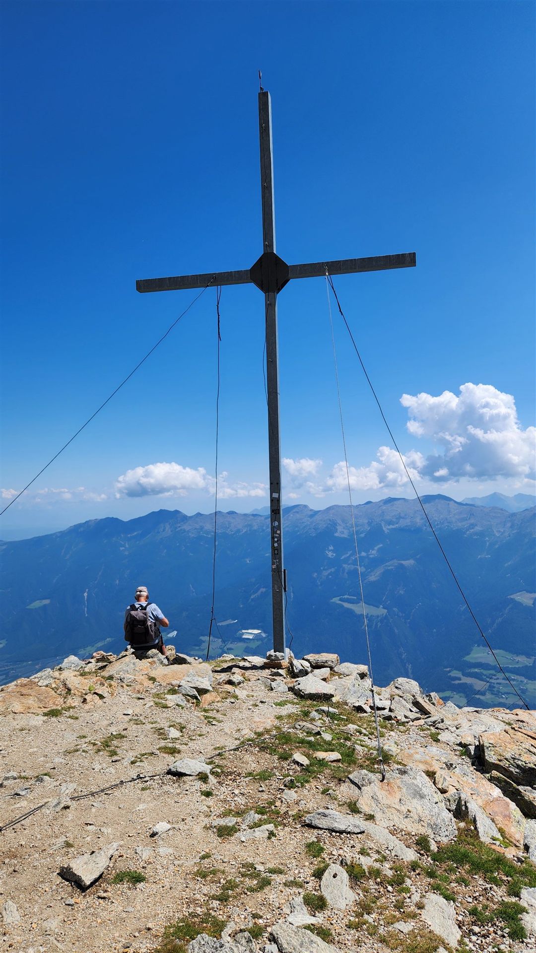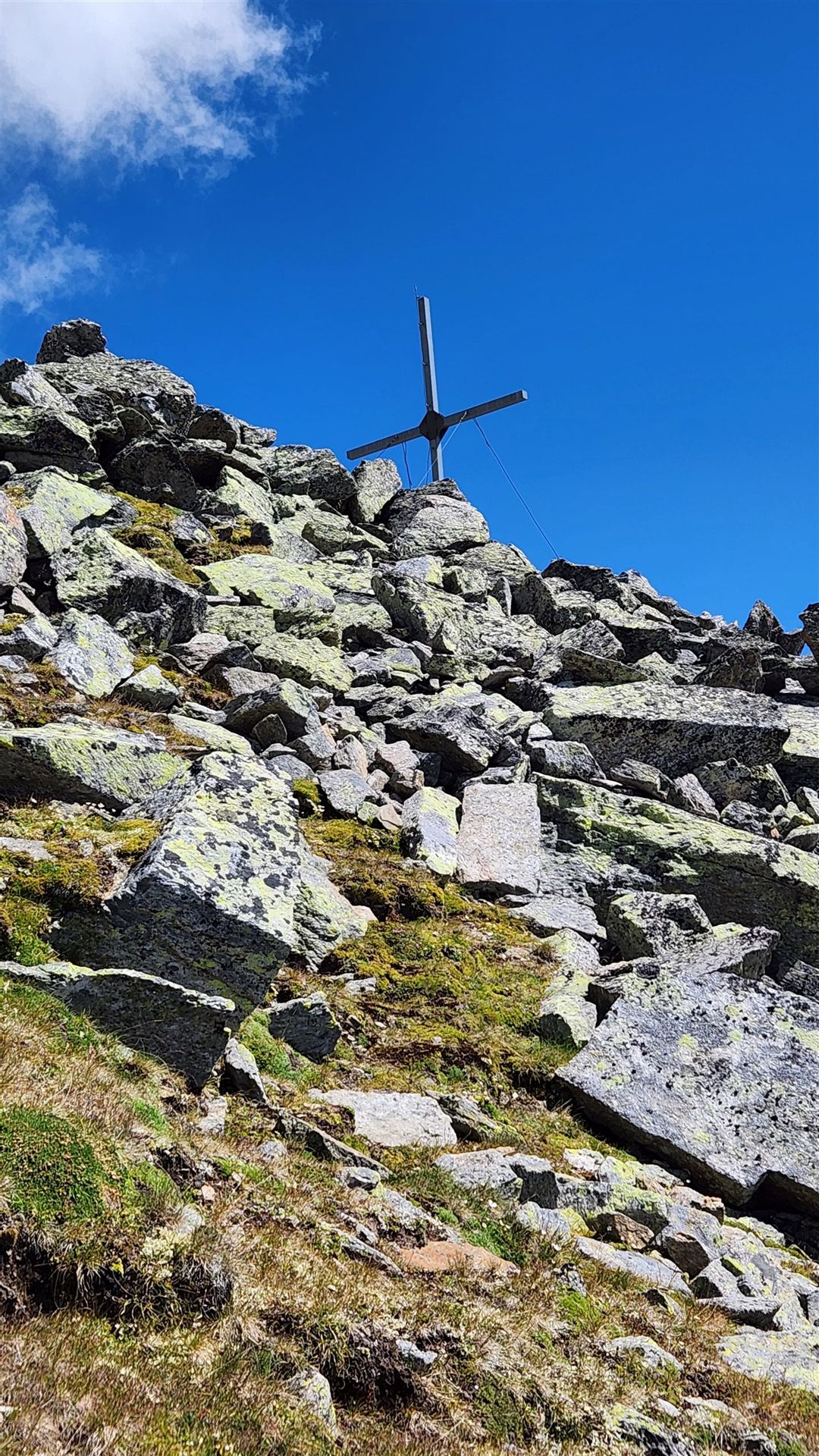 Für den Aufstieg benötigten wir die üblichen 4 Stunden. Zunächst geht es durch lichten Wald. Die Hütten beim St. Martiner Alpl auf ca. 1940 m sind privat. Eine Einkehrmöglichkeit gibt es also nicht. Später verlässt der gut gehbare Steig den Wald und führt weiter oberhalb der Baumgrenze. Die Wasserflasche kann auf 2375 m an einem Brunnen mit Frischwasserzufluss aufgefüllt werden, bevor es über den Ochsenbühel mit 2420 m geht. Zuletzt folgt eine längere, aber einfache Kraxelei über Geröll und Blockgelände. Weil das Gipfelkreuz schon sehr früh zu sehen ist, fast während der gesamten Tour, denkt man immer, dass es ja nicht mehr weit sei. Aber das täuscht! Selten habe ich dieses Phänomen so wahrgenommen.