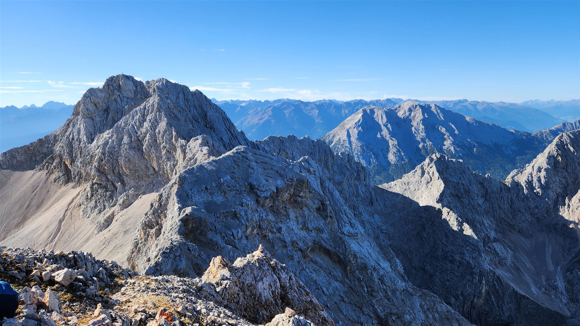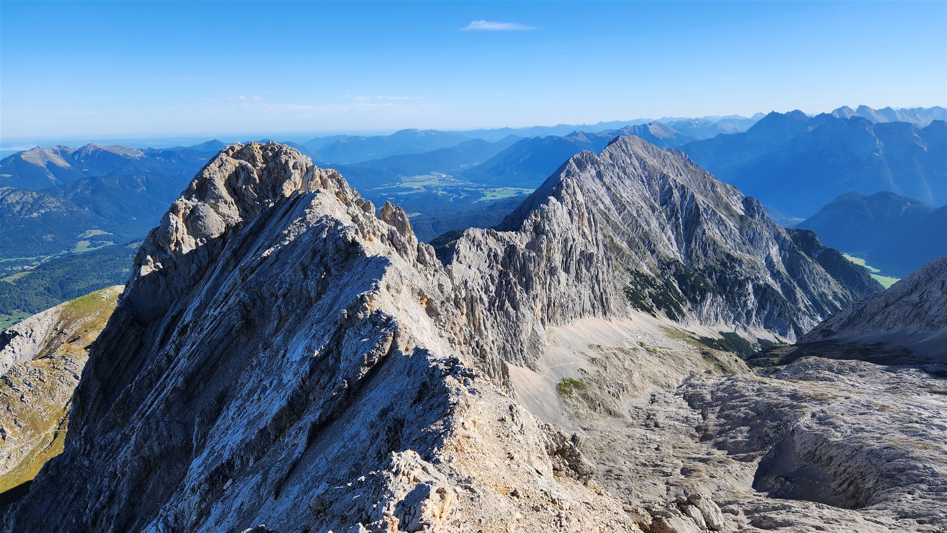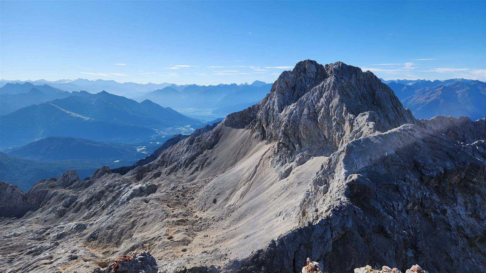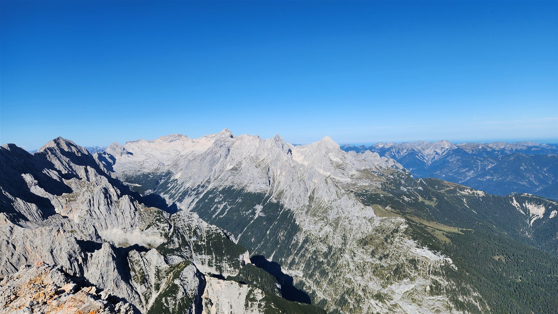 Neben den bereits erwähnten Gipfeln schweift der Blick im weiten Rund hinüber zur Hohen Munde, zum Zugspitzgebiet und den gesamten Ammergauer Alpen, zum Estergebirge, zur Benediktenwand und zum Karwendel, dahinter die Guffertspitze. Die Arnspitzen sind schön zu sehen, außerdem die Seefelder Spitze und die Reither Spitze. Die Wildspitze zeigt ihr weißes Gewand. Ich meine, auch den Großglockner und den Großvenediger erkannt zu haben, außerdem die Wilde Kreuzspitze und die Saile (Axamer Lizum). Unmittelbar gegenüber liegen die Schöttelkarspitze mit Biwakschachtel, Scharnitzspitze, Plattig und Hochwanner. Die Gehrenspitze wird von der Leutascher Dreitorspitze verdeckt.