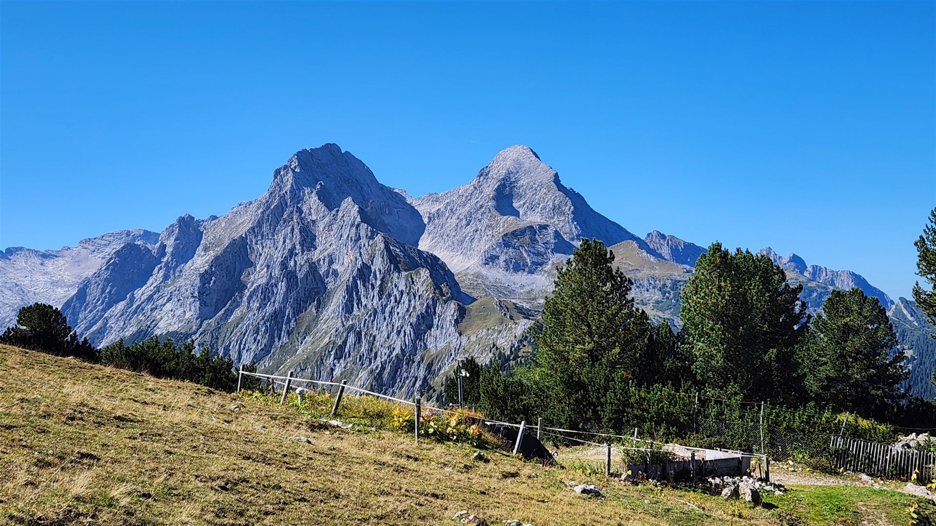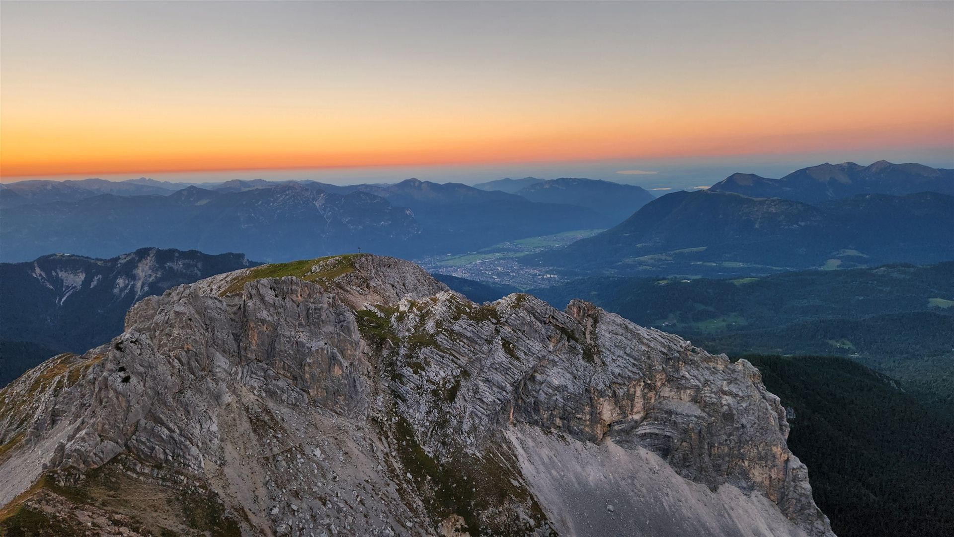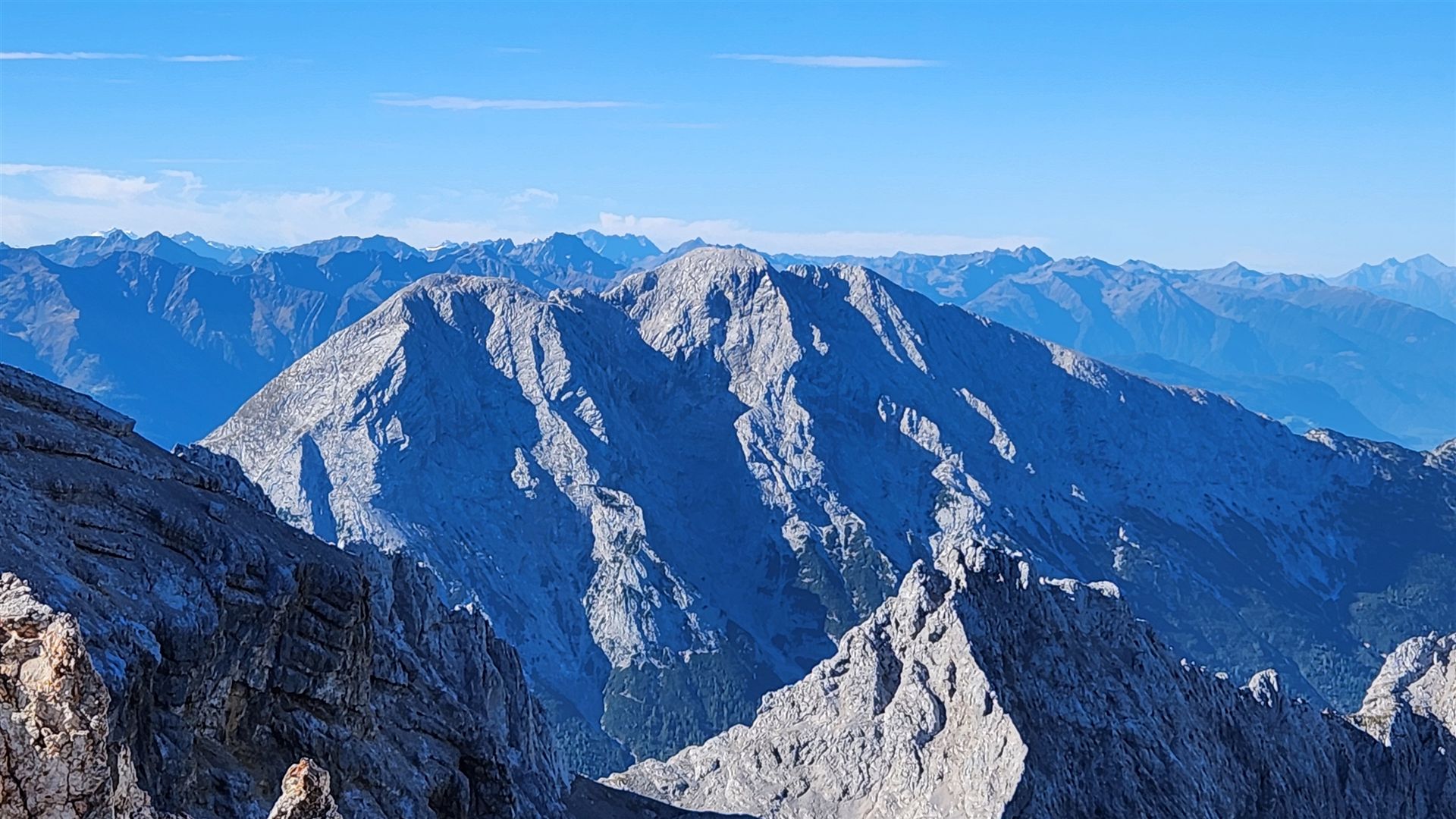 Neben den bereits erwähnten Gipfeln schweift der Blick im weiten Rund hinüber zur Hohen Munde, zum Zugspitzgebiet und den gesamten Ammergauer Alpen, zum Estergebirge, zur Benediktenwand und zum Karwendel, dahinter die Guffertspitze. Die Arnspitzen sind schön zu sehen, außerdem die Seefelder Spitze und die Reither Spitze. Die Wildspitze zeigt ihr weißes Gewand. Ich meine, auch den Großglockner und den Großvenediger erkannt zu haben, außerdem die Wilde Kreuzspitze und die Saile (Axamer Lizum). Unmittelbar gegenüber liegen die Schöttelkarspitze mit Biwakschachtel, Scharnitzspitze, Plattig und Hochwanner. Die Gehrenspitze wird von der Leutascher Dreitorspitze verdeckt.