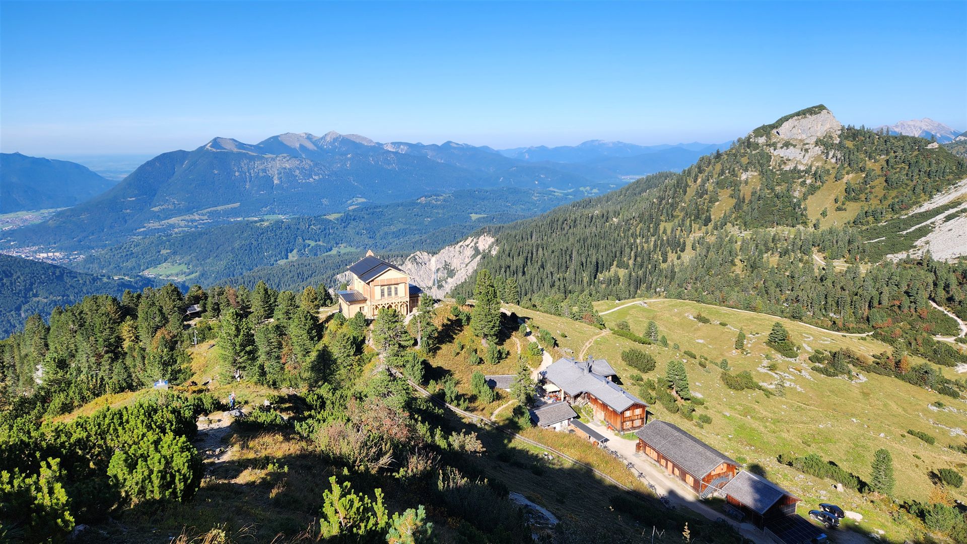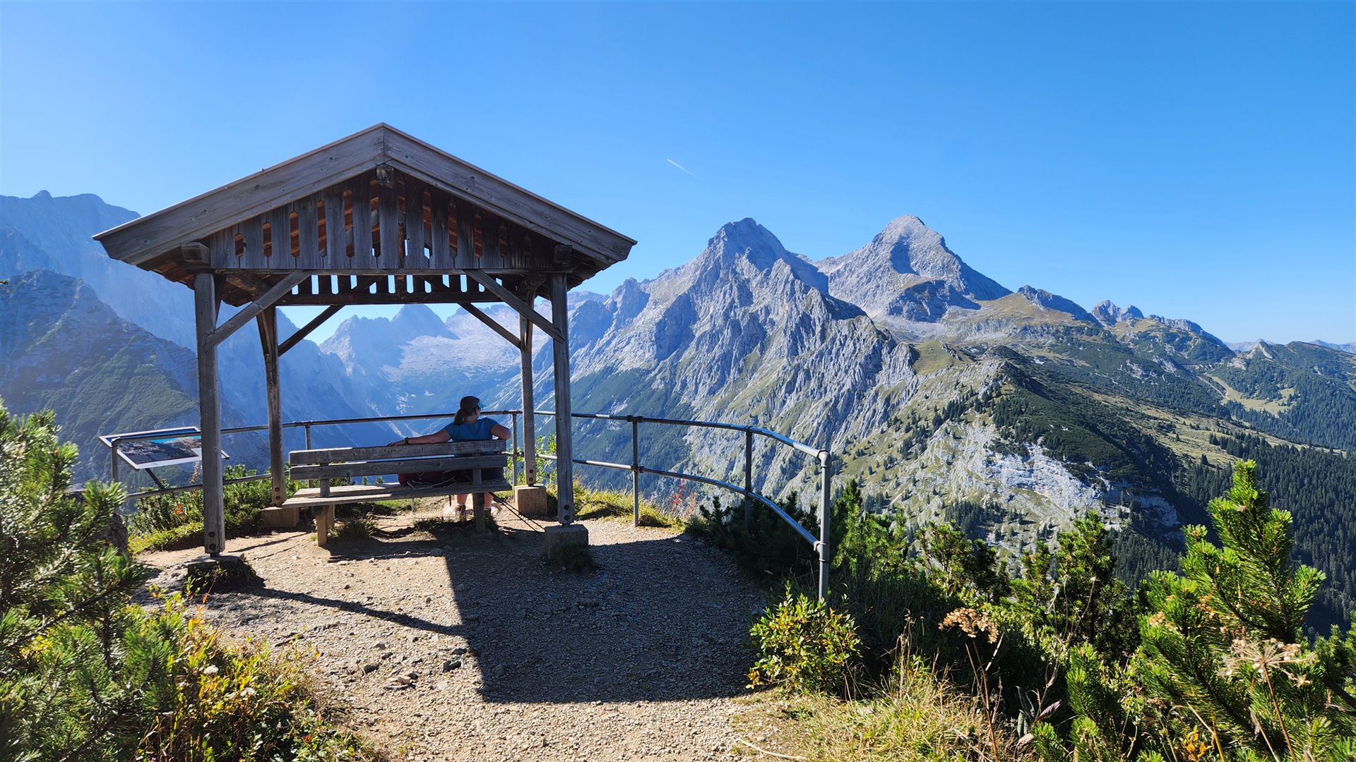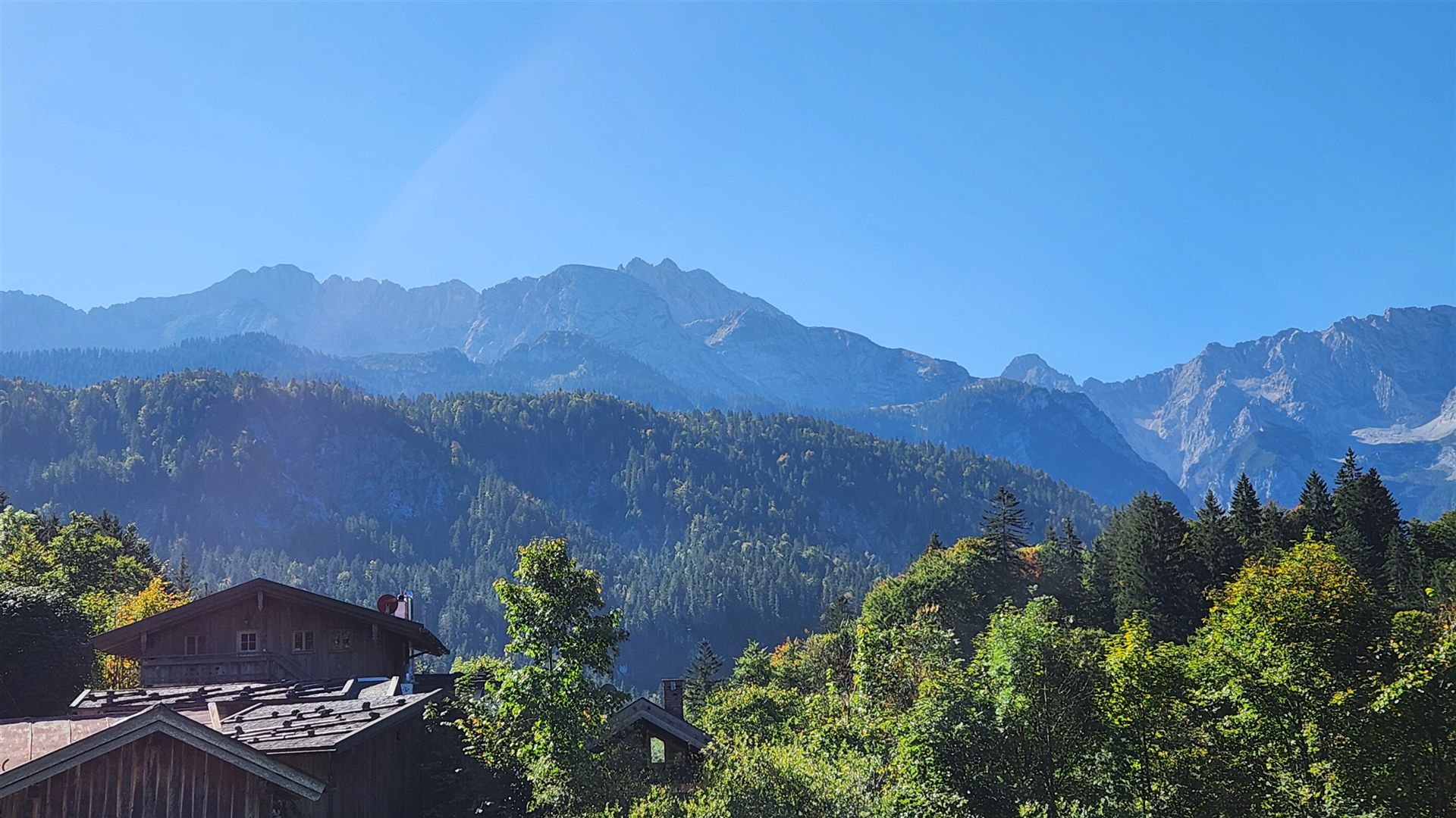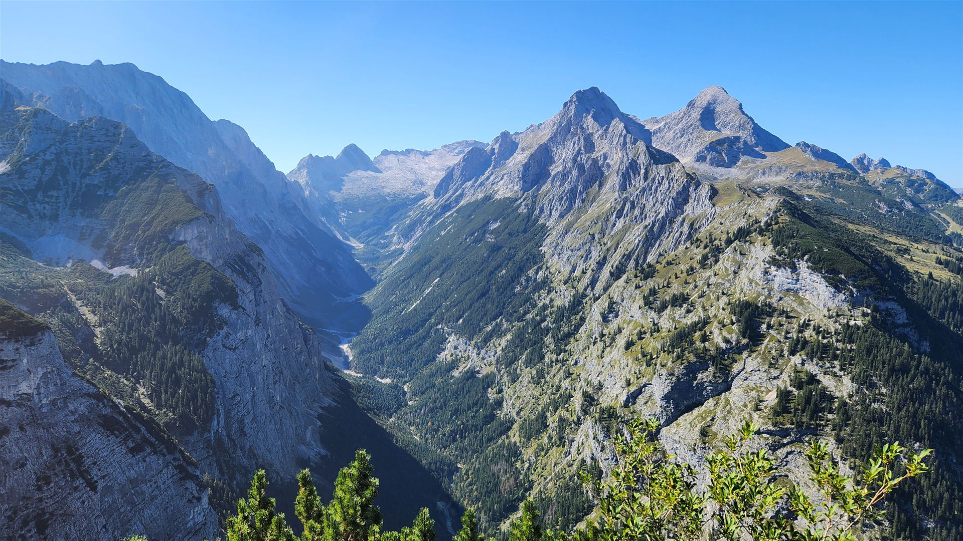 Neben den bereits erwähnten Gipfeln schweift der Blick im weiten Rund hinüber zur Hohen Munde, zum Zugspitzgebiet und den gesamten Ammergauer Alpen, zum Estergebirge, zur Benediktenwand und zum Karwendel, dahinter die Guffertspitze. Die Arnspitzen sind schön zu sehen, außerdem die Seefelder Spitze und die Reither Spitze. Die Wildspitze zeigt ihr weißes Gewand. Ich meine, auch den Großglockner und den Großvenediger erkannt zu haben, außerdem die Wilde Kreuzspitze und die Saile (Axamer Lizum). Unmittelbar gegenüber liegen die Schöttelkarspitze mit Biwakschachtel, Scharnitzspitze, Plattig und Hochwanner. Die Gehrenspitze wird von der Leutascher Dreitorspitze verdeckt.