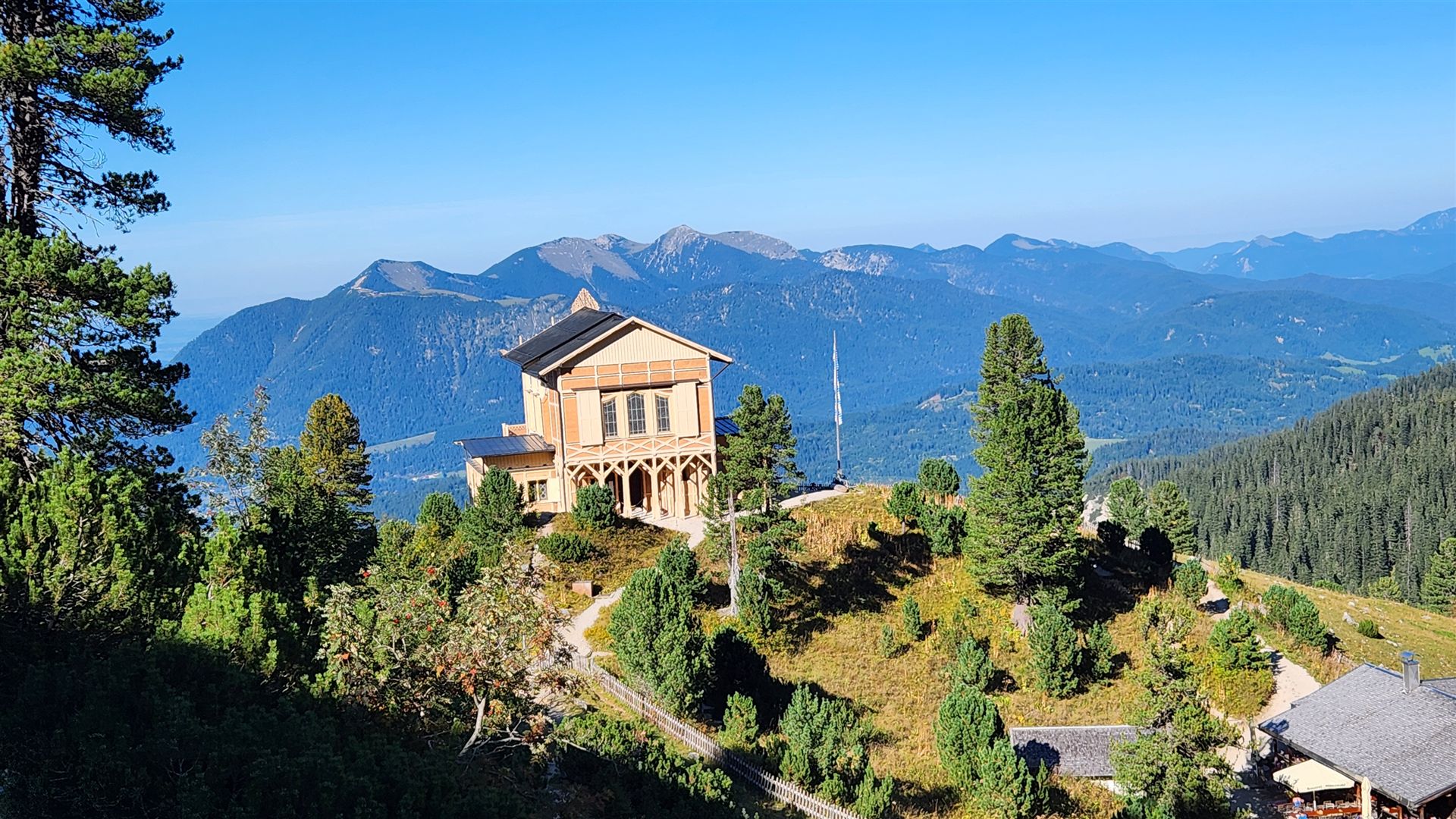 Rund um das Schachenschloss (1866 m) gönnte ich mir ganze zwei Stunden Pause, denn ich wollte erst zum Abendessen an der Meilerhütte sein, die vom Schachenschloss ganz klein zu erkennen ist. Man muss sich nur an der Materialseilbahn orientieren, die vom Schachen zur Meilerhütte führt. Nachdem der letzte Besuch im Schachenschloss schon einige Jahre zurücklag, gönnte ich mir noch einmal die 30-minütige Führung durch das Schloss. Das orientalische Zimmer ist immer einen Besuch wert. Heute waren auch die Lichtverhältnisse für die Buntglasfenster ideal. Fotografieren ist allerdings verboten. Immerhin weiß ich jetzt, was die Leibspeise von König Ludwig II. war, nämlich Hechtenkraut (das ist Hechtfleisch mit Sauerkraut und Bechamelsauce). Außerdem unternahm ich den sehenswerten Abstecher zum Aussichtspavillon (1861 m) mit Blick ins Reintal. Das sind hin und zurück nur 10 Minuten. Unterwegs passiert man auch die Abzweigung ins Oberreintal zur Oberreintalhütte. Am Schachenhaus genoss ich noch einen Eiskaffee. Das war ein wirklich großer Plastikbecher. So muss ein Eiskaffee sein und nicht so mickrig, wie man ihn meistens im Tal bekommt.