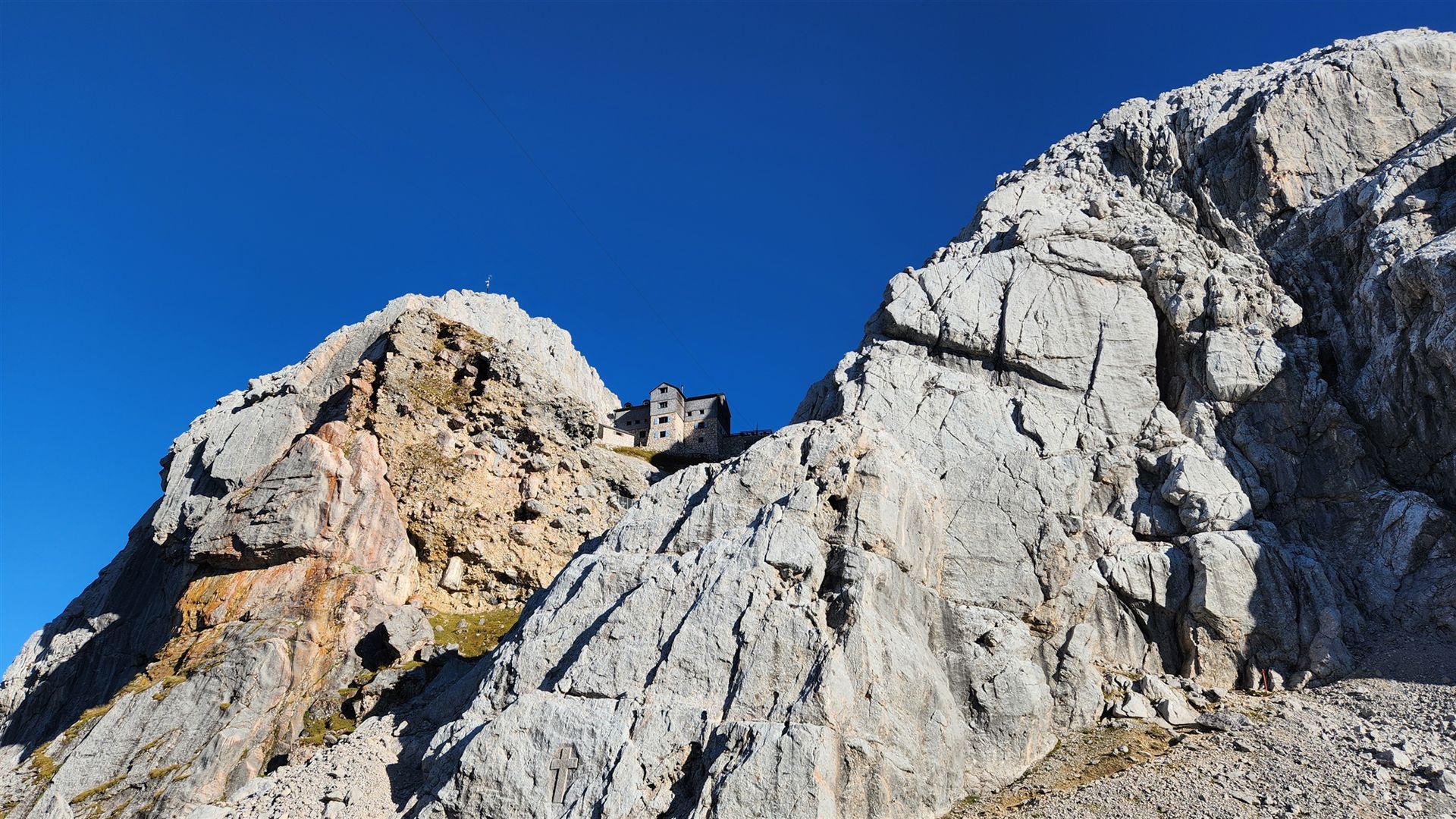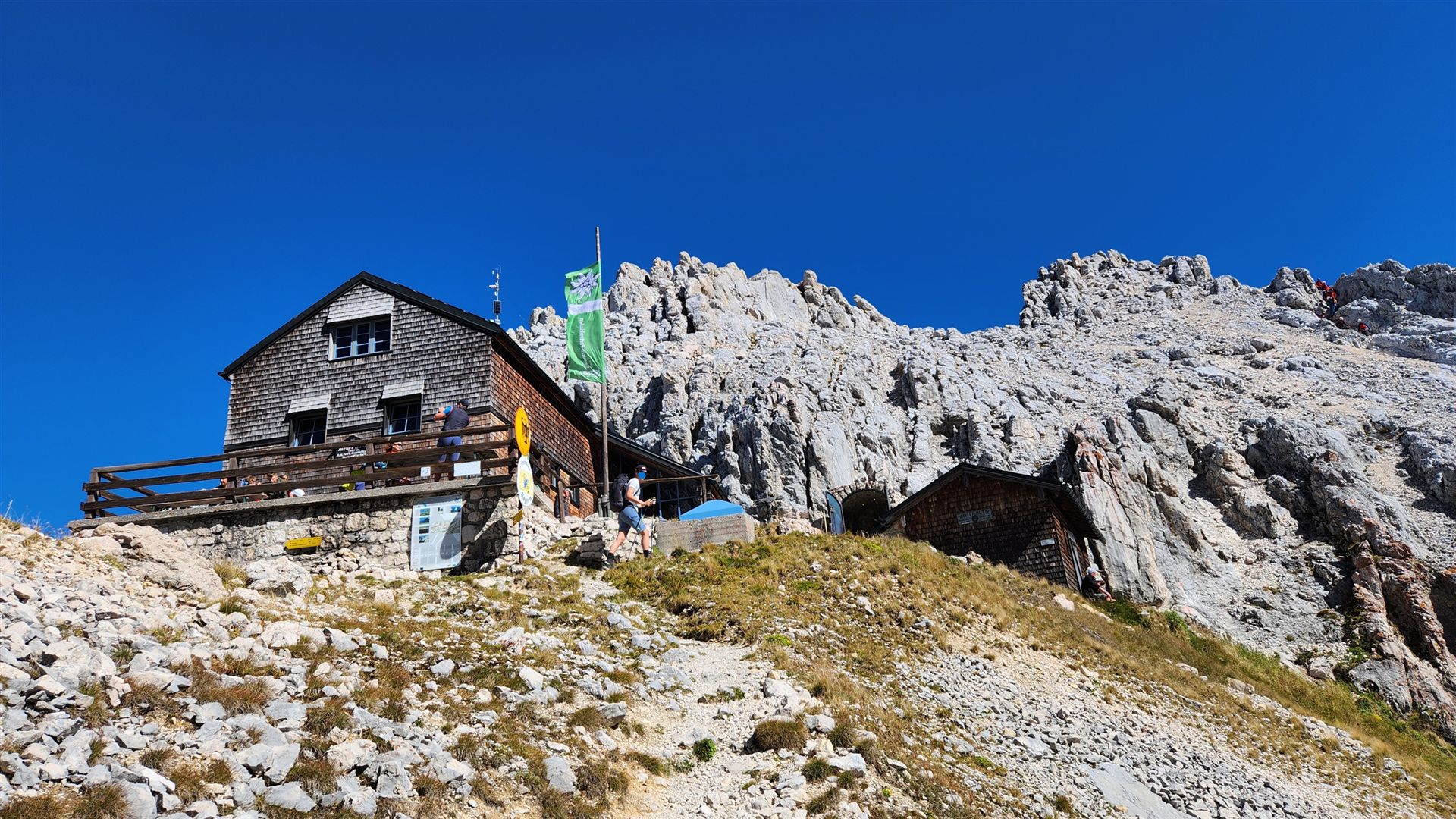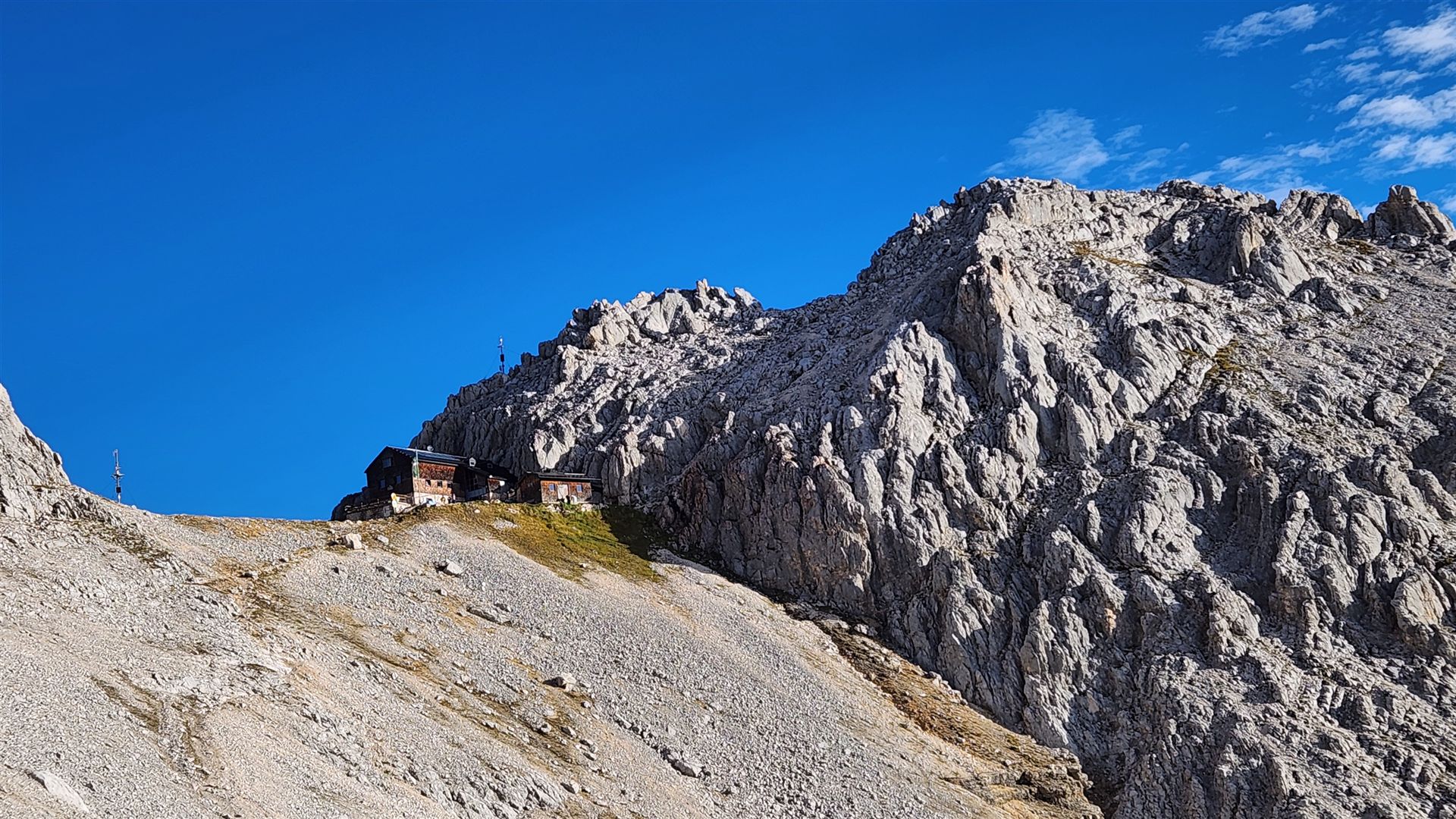 Die Hütte ist ein Erlebnis. Nicht nur, weil sie sich faszinierend in die Felslandschaft am Kamm zwischen Bayern und Tirol einfügt. Es gibt auch nur zwei Toiletten und zum Waschen füllt man sich im Waschhaus um die Ecke einen Eimer mit kaltem Wasser. Das gesamte Wasser ist aufgefangenes Regen- und Schmelzwasser und über Monate gelagert. Frischwasser gibt es nicht. Trinkwasser muss mit der Materialbahn heraufgeschafft werden. Entsprechend kostete der Liter Wasser für die Tour am nächsten Tag auch 4 Euro. Passt scho.
