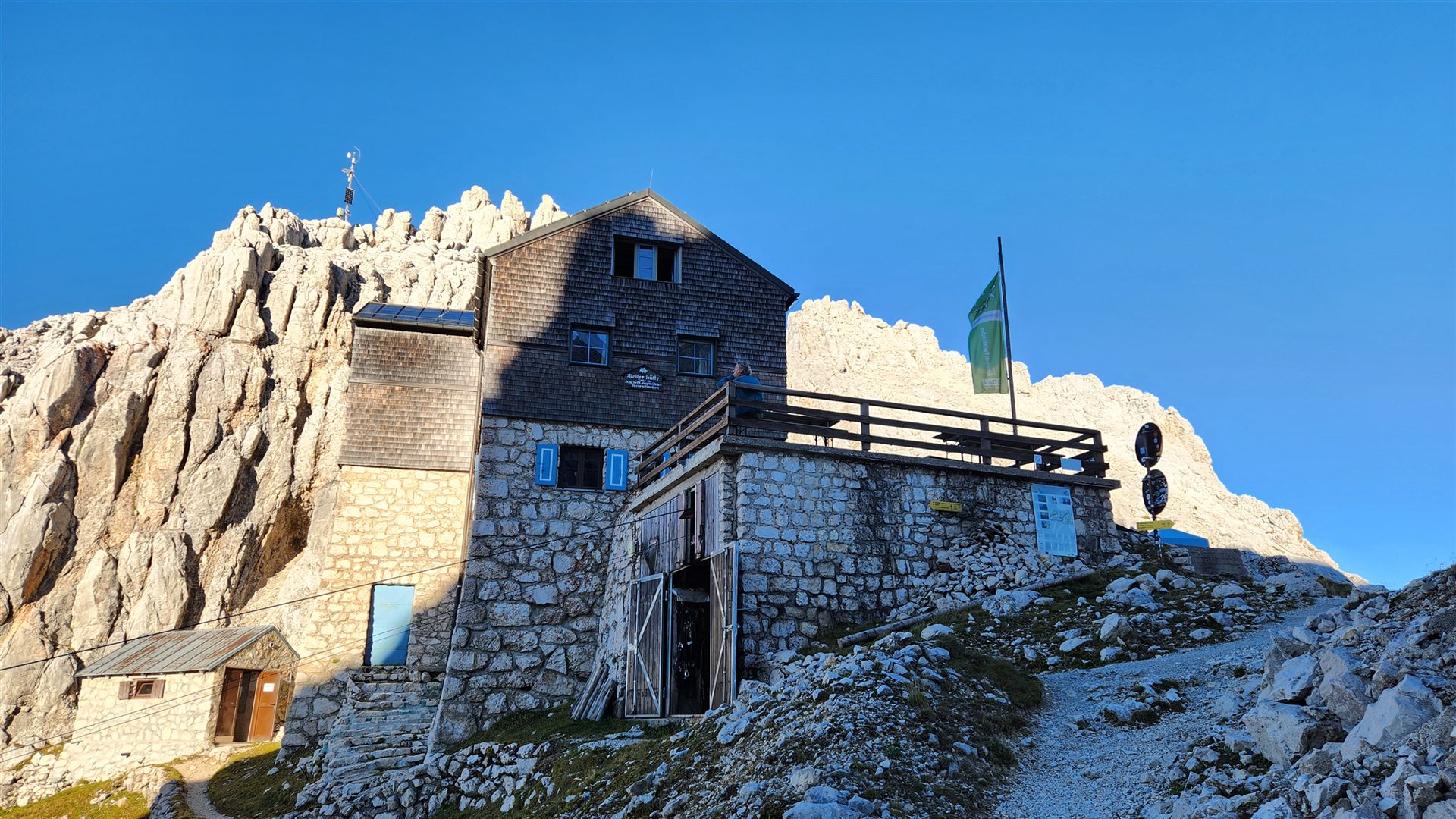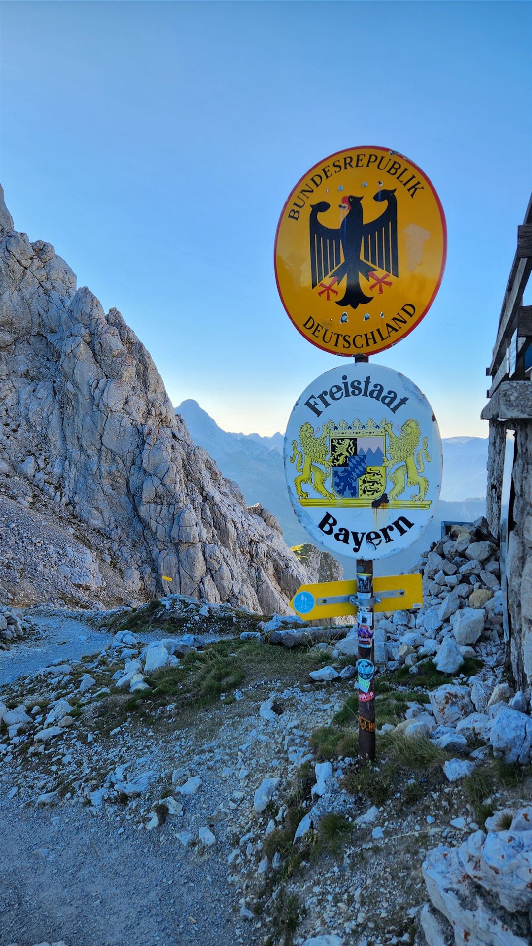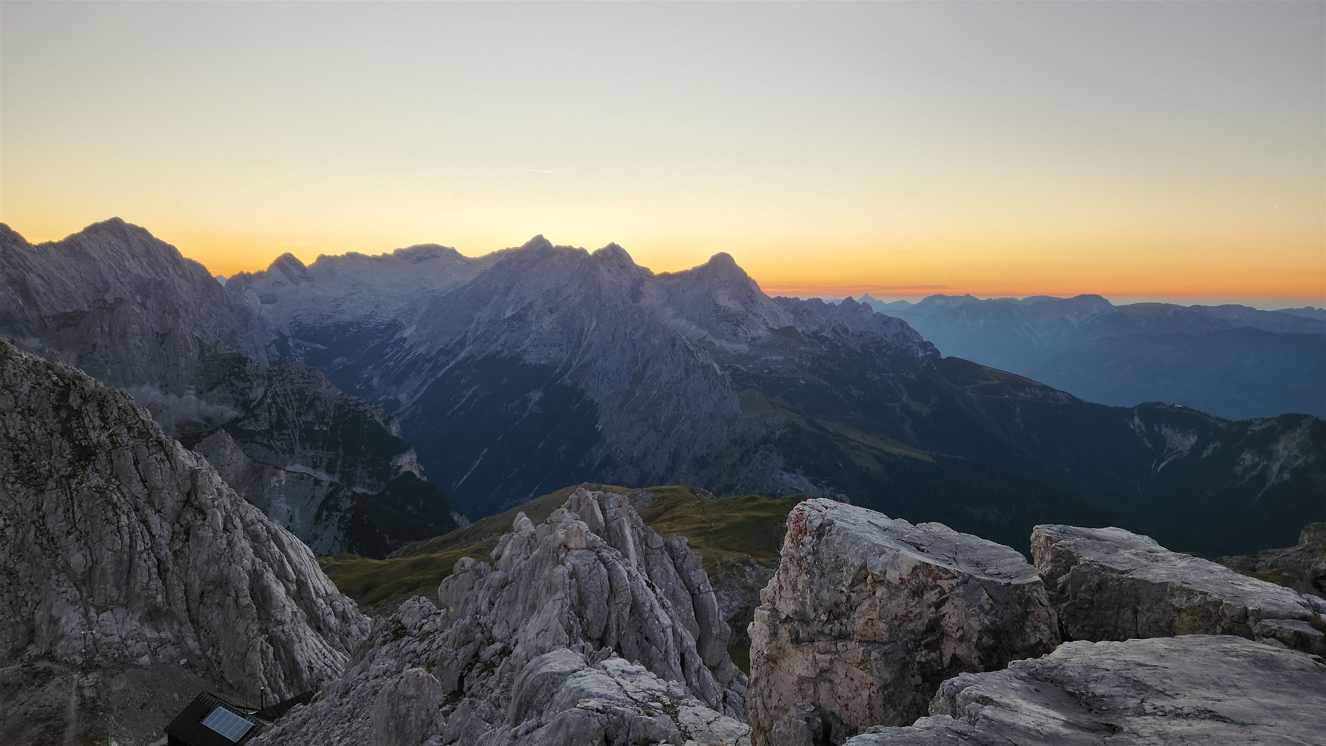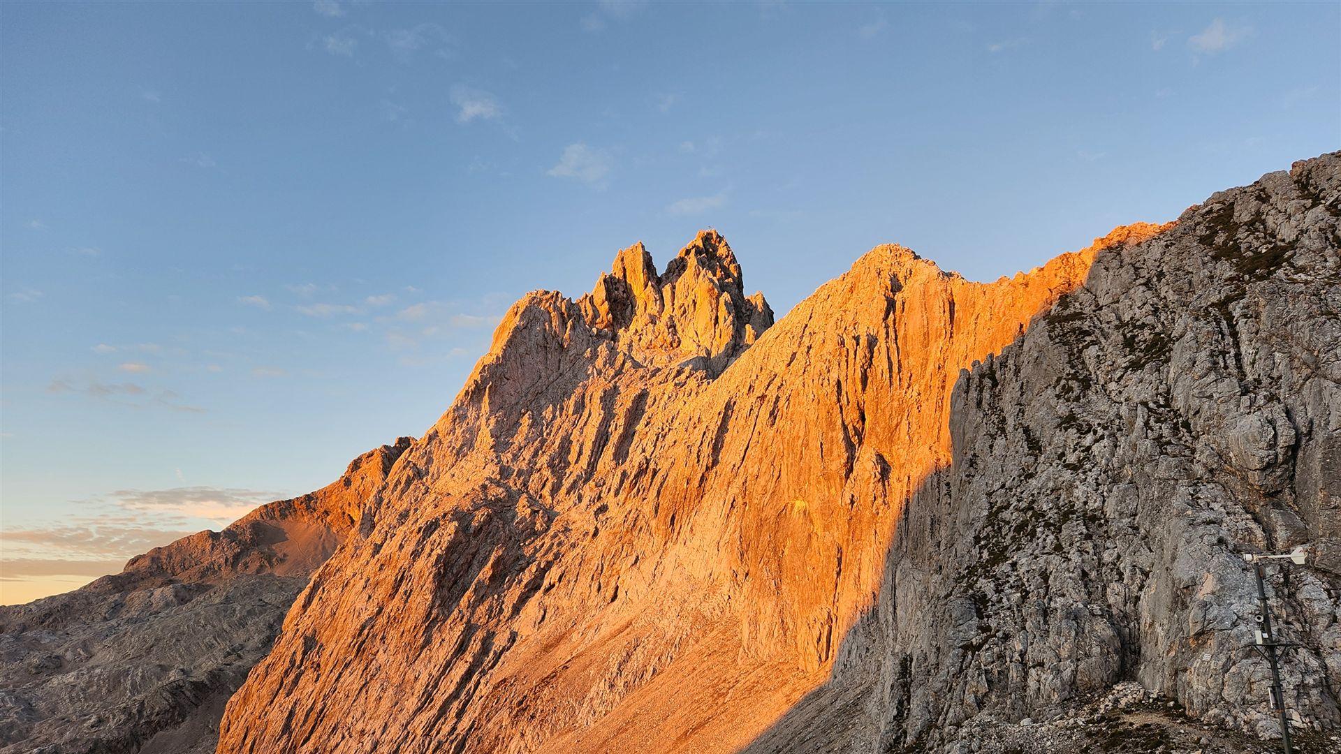 Die Hütte ist ein Erlebnis. Nicht nur, weil sie sich faszinierend in die Felslandschaft am Kamm zwischen Bayern und Tirol einfügt. Es gibt auch nur zwei Toiletten und zum Waschen füllt man sich im Waschhaus um die Ecke einen Eimer mit kaltem Wasser. Das gesamte Wasser ist aufgefangenes Regen- und Schmelzwasser und über Monate gelagert. Frischwasser gibt es nicht. Trinkwasser muss mit der Materialbahn heraufgeschafft werden. Entsprechend kostete der Liter Wasser für die Tour am nächsten Tag auch 4 Euro. Passt scho.