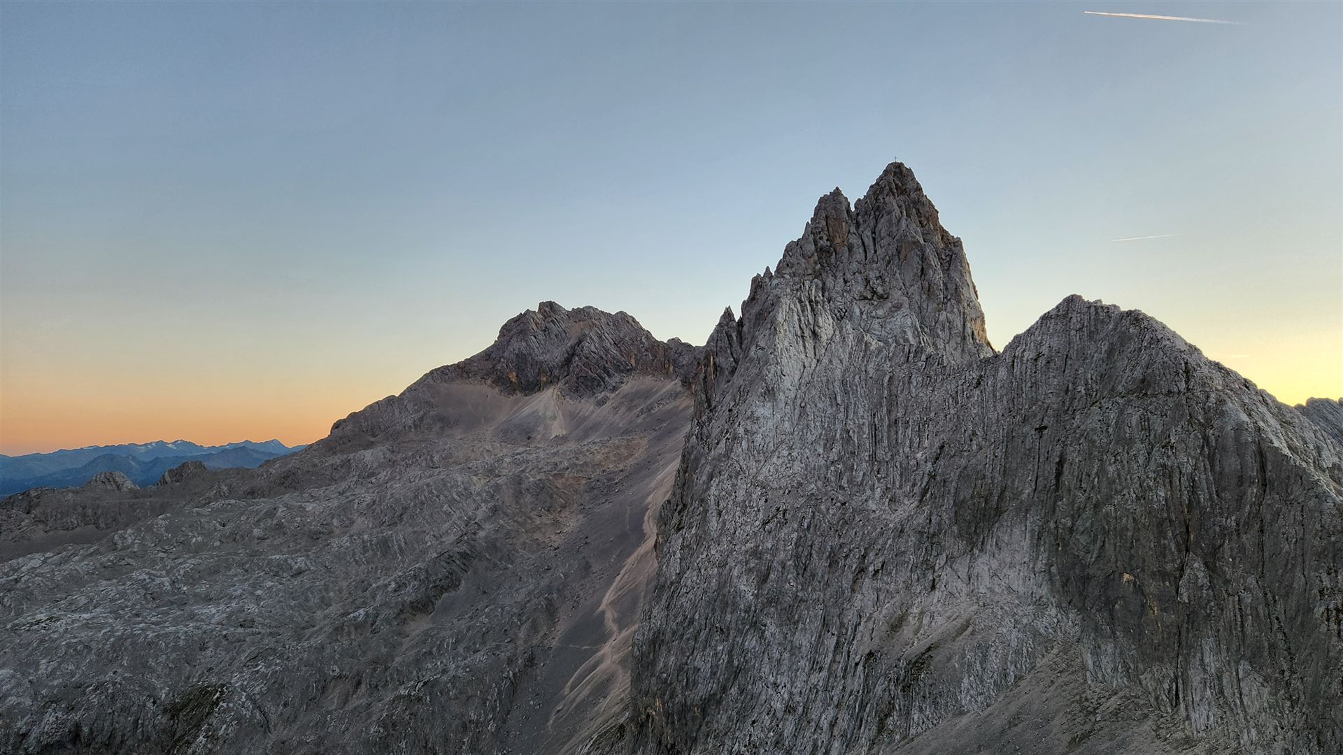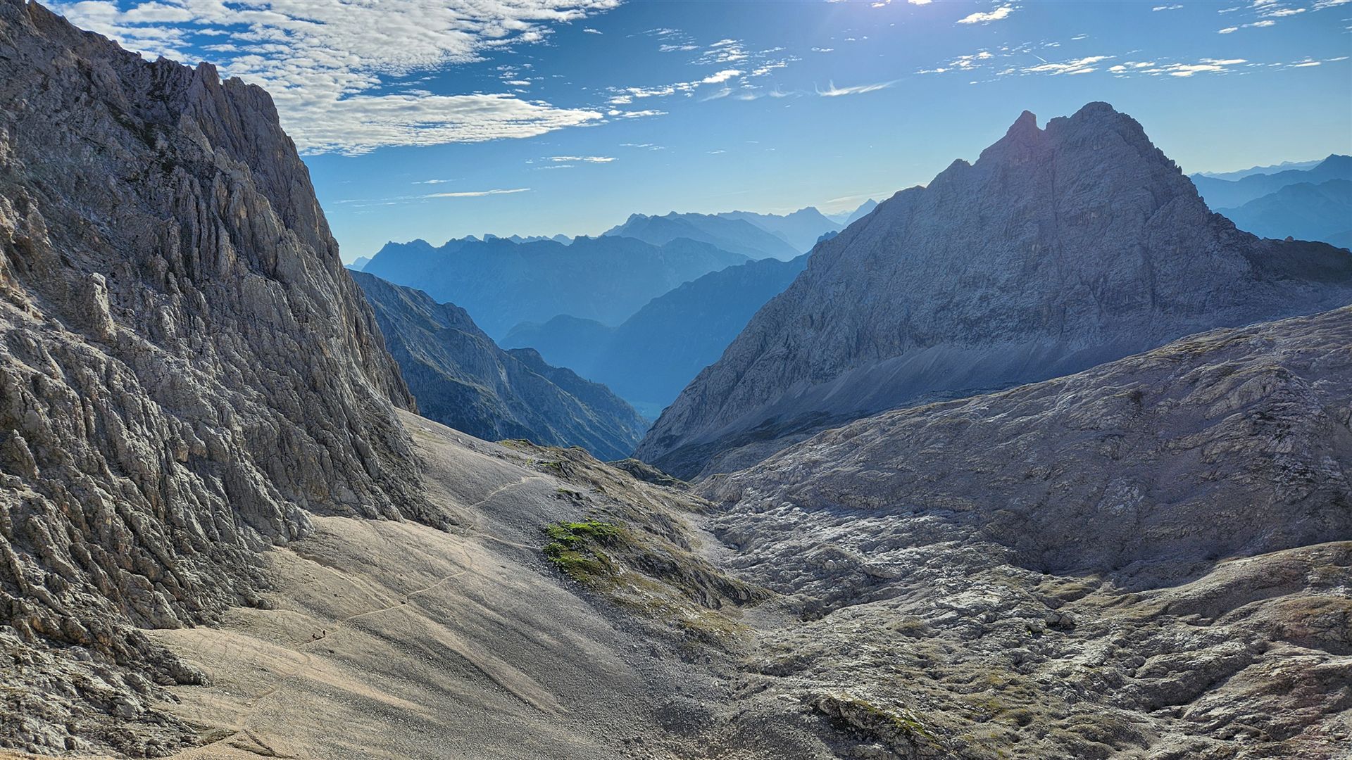 Der Grat zu den beiden anderen Gipfeln der Dreitorspitze grenzt schon an den Schwierigkeitsgrad des Jubiläumsgrats, denke ich zumindest. Aufs Weitergehen hatte ich somit keine Lust. Denn da darf man sich keinen Fehler erlauben. Einige Bergsteiger machten die Überschreitung von der Meilerhütte über Signalkopf, vorbei am Bayerländerturm (2507 m) und über die beiden anderen Gipfel der Partenkirchener Dreitorspitze. Das erschien mir zu schwierig. Es soll auch eine kurze Abseilstelle geben. Nein, danke. Wenn ich mir beim Klettern den Weg selbst suchen muss und keine roten Punkte habe, macht es mir keinen Spaß. Das Risiko, dass ich mich versteige, ist mir zu groß. Wenn, dann würde ich so etwas mit Bergführer machen. Denn es geht nichts über Ortskenntnis. Aber ich habe von der Westlichen Dreitorspitze einen guten Eindruck von der gesamten Landschaft bekommen. Das reicht mir.