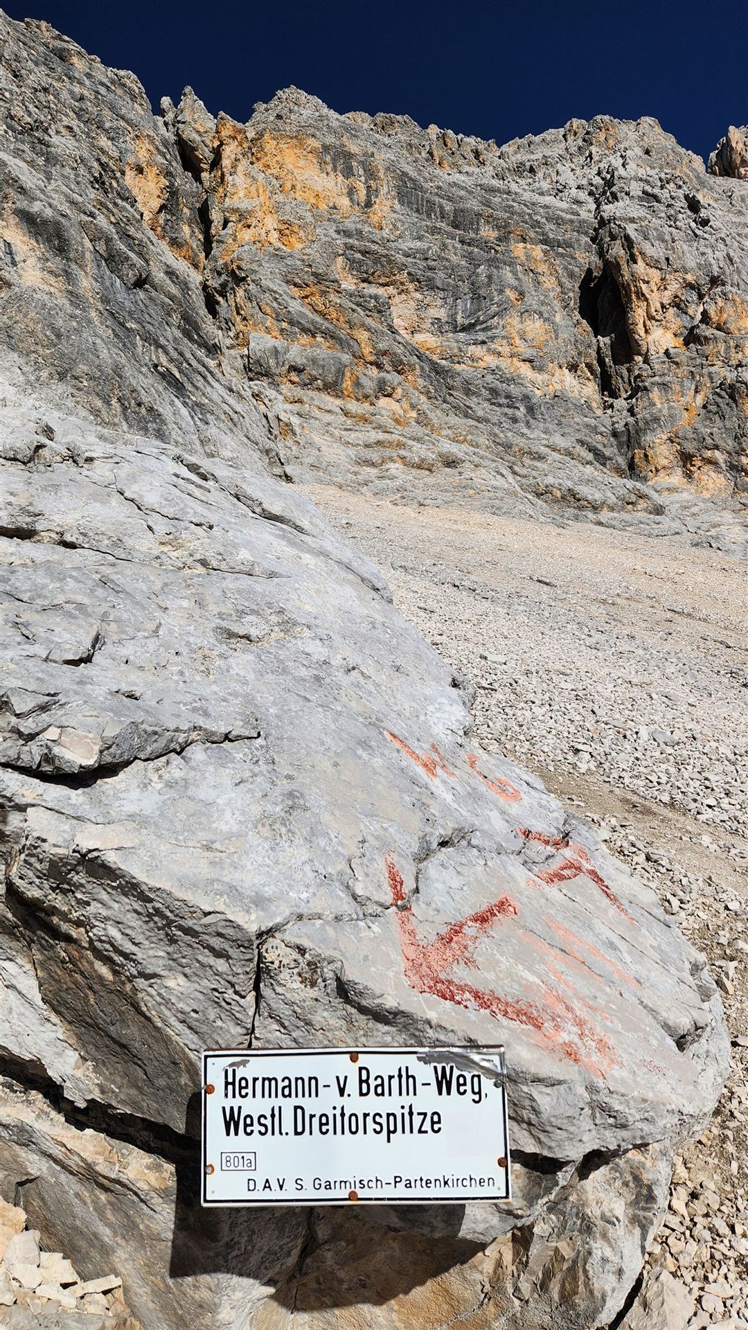 Zum Frühstück wählte ich Birchermüsli. Danach machte ich mich auf den Weg zur Westlichen Partenkirchener Dreitorspitze. Den Rucksack deponierte ich in der Hütte. Das Wetter war so stabil, da konnte ich auf viele Ausrüstungsgegenstände verzichten. Nach einer Querung unterhalb der Signalkuppe ging es ein längeres Stück über Schotter, wie man es von der Zugspitze kennt. Im Blickfeld immer die Leutascher Dreitorspitze (2682 m). Die Abzweigung zum Söllerpass lässt man links liegen. Dann folgt der Hermann-von-Barth-Weg auf den Gipfel. Zwar ist die Westliche Spitze mit 2633 m die Höchste der drei Spitzen, aber ein Gipfelkreuz gibt es dort nicht, lediglich einen Grenzstein Tirol/Bayern und ein Steinmanderl. Auch auf der mittleren Partenkirchener Dreitorspitze (2622 m) steht kein Gipfelkreuz. Das Gipfelkreuz befindet sich vielmehr auf der nordöstlichen Partenkirchener Dreitorspitze (2626 m). Wenn man von Garmisch-Partenkirchen hinauf zu den Dreitorspitzen schaut, ist man der Meinung, die mittlere Spitze sei die höchste. Das liegt daran, dass die westliche Spitze etwas nach hinten versetzt ist. Aber es sind ja auch nur wenige Meter Unterschied. Die Westliche Dreitorspitze ist über einen einfachen A/B-Klettersteig zu erreichen. Ein Helm ist aber unverzichtbar, denn das Gestein ist sehr brüchig und es bröselt immer mal wieder herab, insbesondere durch vorausgehende Kletterer.