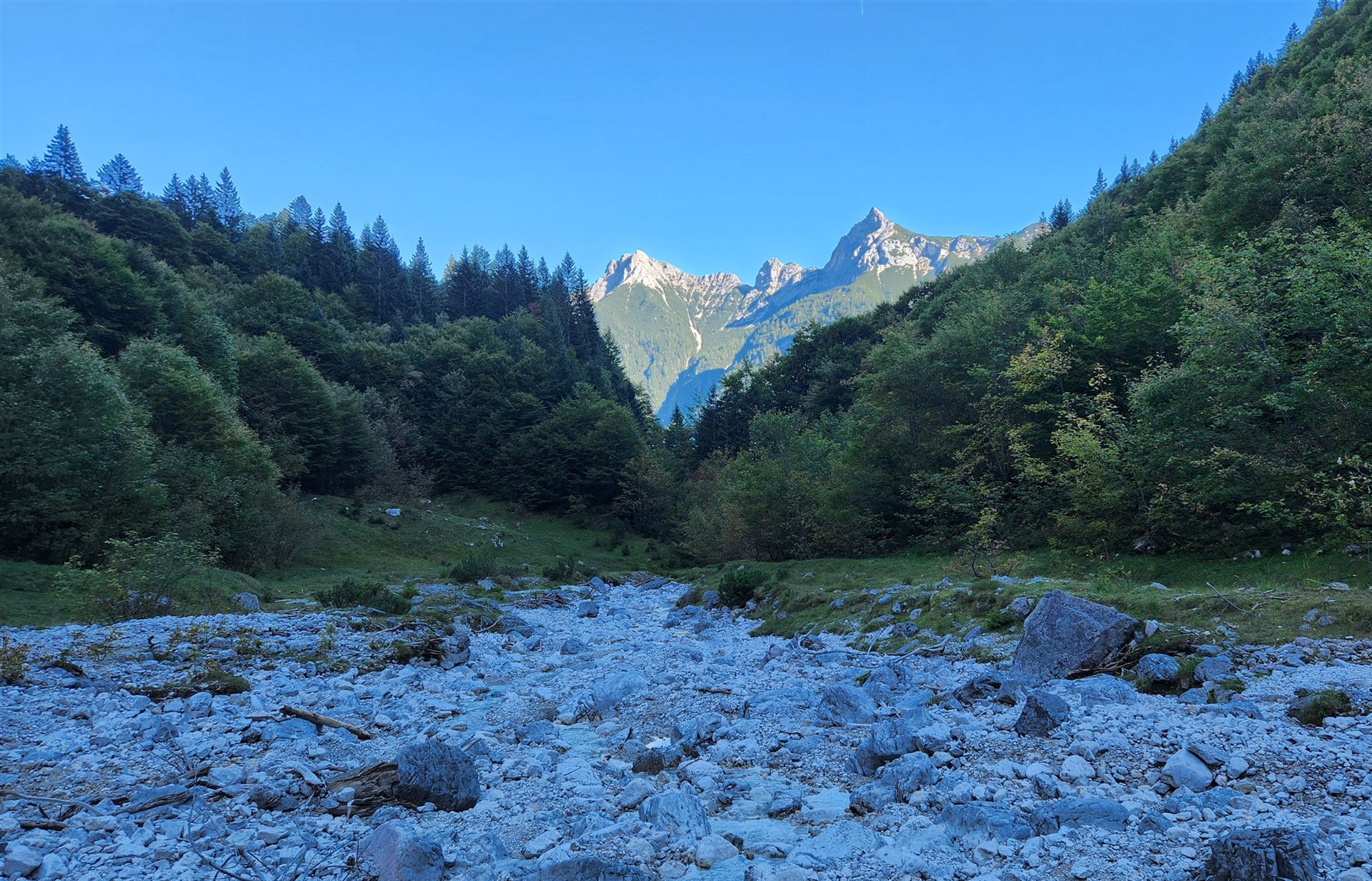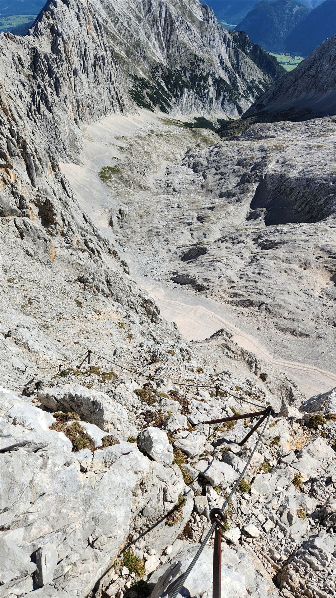 Nachdem ich mich wie immer fast eine Stunde auf dem Gipfel aufgehalten habe, ging es den gleichen Weg zurück zur Meilerhütte. Nach dem Klettersteig musste man im Geröll höllisch aufpassen. Auf der Meilerhütte gönnte ich mir noch eine Speckknödelsuppe, bevor ich durchs Bergleintal nach Leutasch abstieg, denn es sollte ja eine Überschreitung werden. Zu beiden Seiten ragten die Wände steil auf, zum einen der Musterstein (2478 m), zum anderen der Öfelekopf. Der Abstieg durchs Leutascher Platt war mit 4 Stunden angegeben. Trotz Pausen, denn der Abstieg ging in die Knochen, benötigte ich aber nur gut 3 Stunden. Der Schotterteil zog sich bis weit ins Tal. Aus dem Schotterbett des Bergleinbachs heraus fiel der Blick wunderbar auf die Arnspitzen. Unterwegs lernte ich Martin aus München kennen, der mich netterweise zurück mit nach Garmisch nahm. Irgendwie kommt man immer nach Hause, so musste ich mich nicht mit dem Bus beschäftigen. Und jetzt kenne ich auch den Abstieg nach Leutasch.
