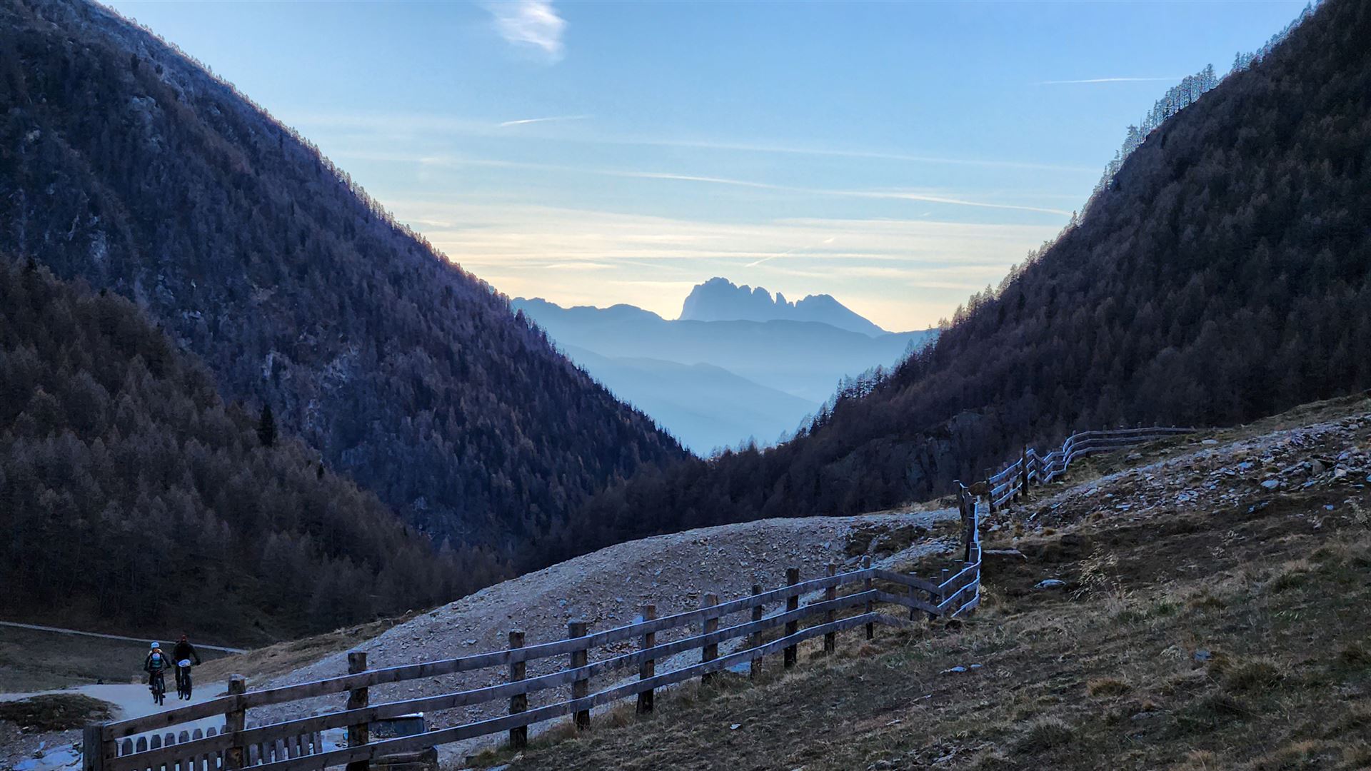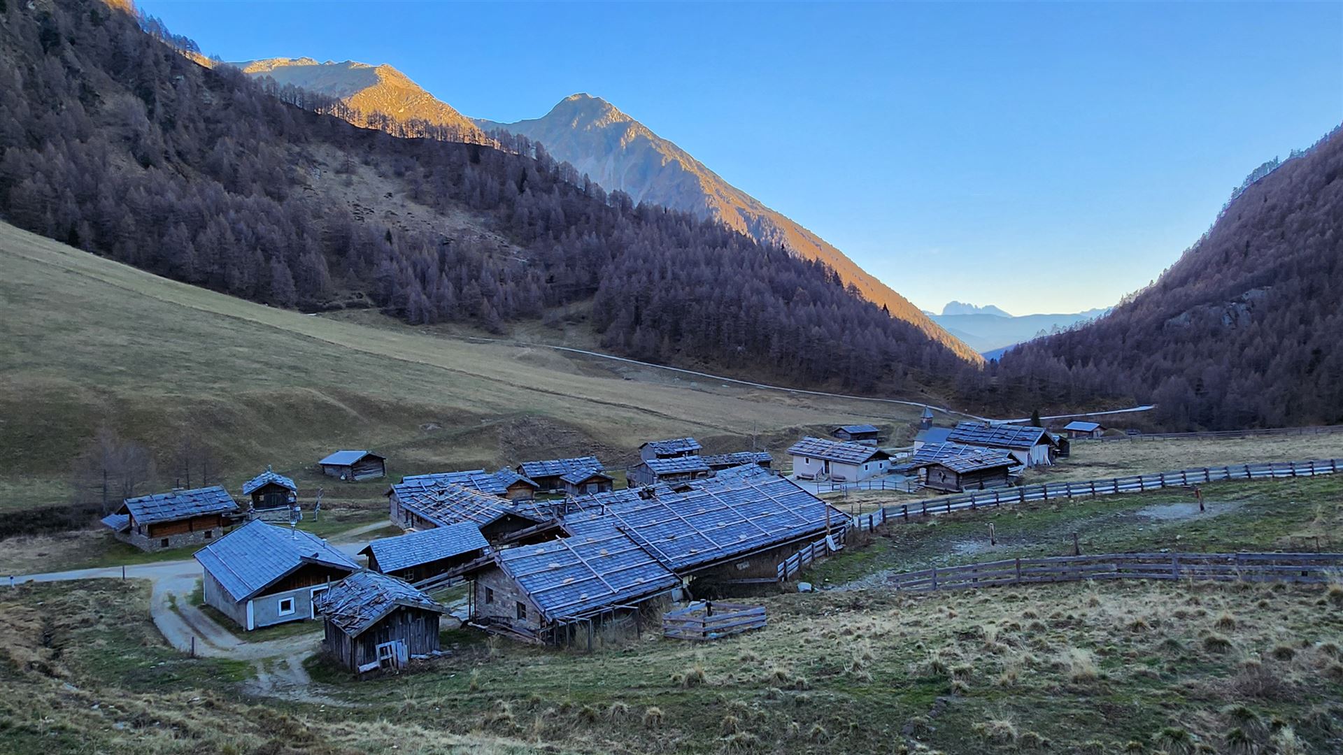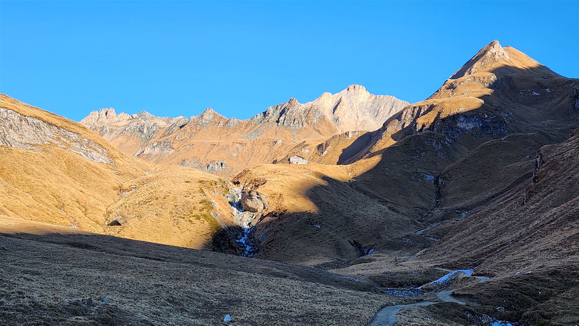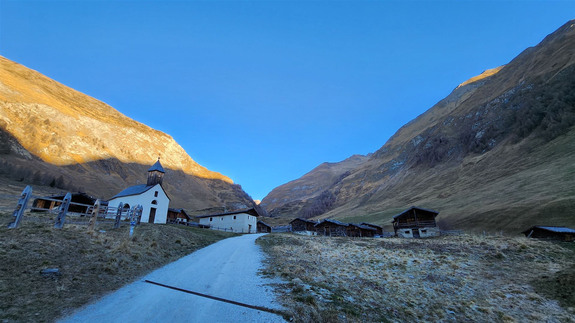 Die Fane Alm, ein wunderschönes Almdorf, vergleichbar mit der Eng Alm im Karwendel, liegt nur 5 Minuten nach dem letzten Parkplatz. Schon hier befindet sich die Baumgrenze. Im November war die Fane Alm natürlich bereits geschlossen. Von der Alm führt ein breiter Weg entlang des Valler Bachs und durch eine Klamm mit Wasserfall, die Valler Schramme, bis zur Brixner Hütte auf 2300 m. Beim Blick zurück erscheinen in der Ferne die Dolomiten, mit Langkofel, Kesselkogel, Latemar-Gruppe und Diamantiditurm. Die Gipfel am Tal-Ende heißen Rübespitz und Pfannespitz.