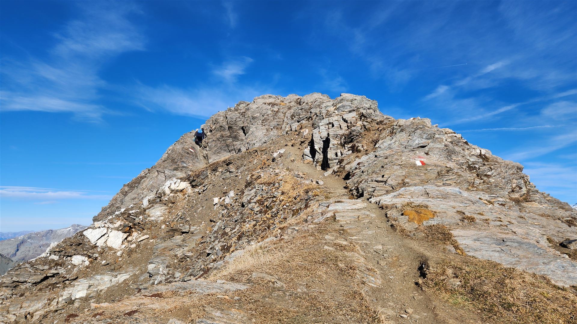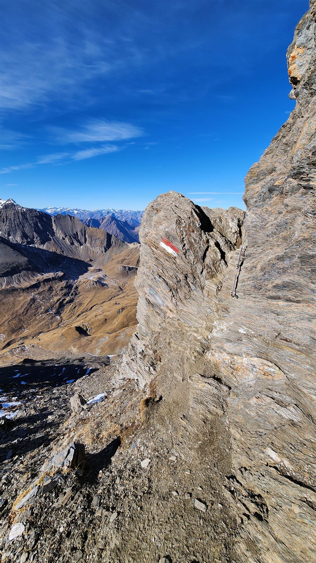 Der komplette Aufstieg verläuft über Gehgelände. Nur zwei leichte Stellen sind seilversichert und es muss ein wenig gekraxelt werden. Absturzgefahr besteht allenfalls am Gipfel, wenn man von der Aussicht fasziniert dem Abgrund zu nahe kommt.