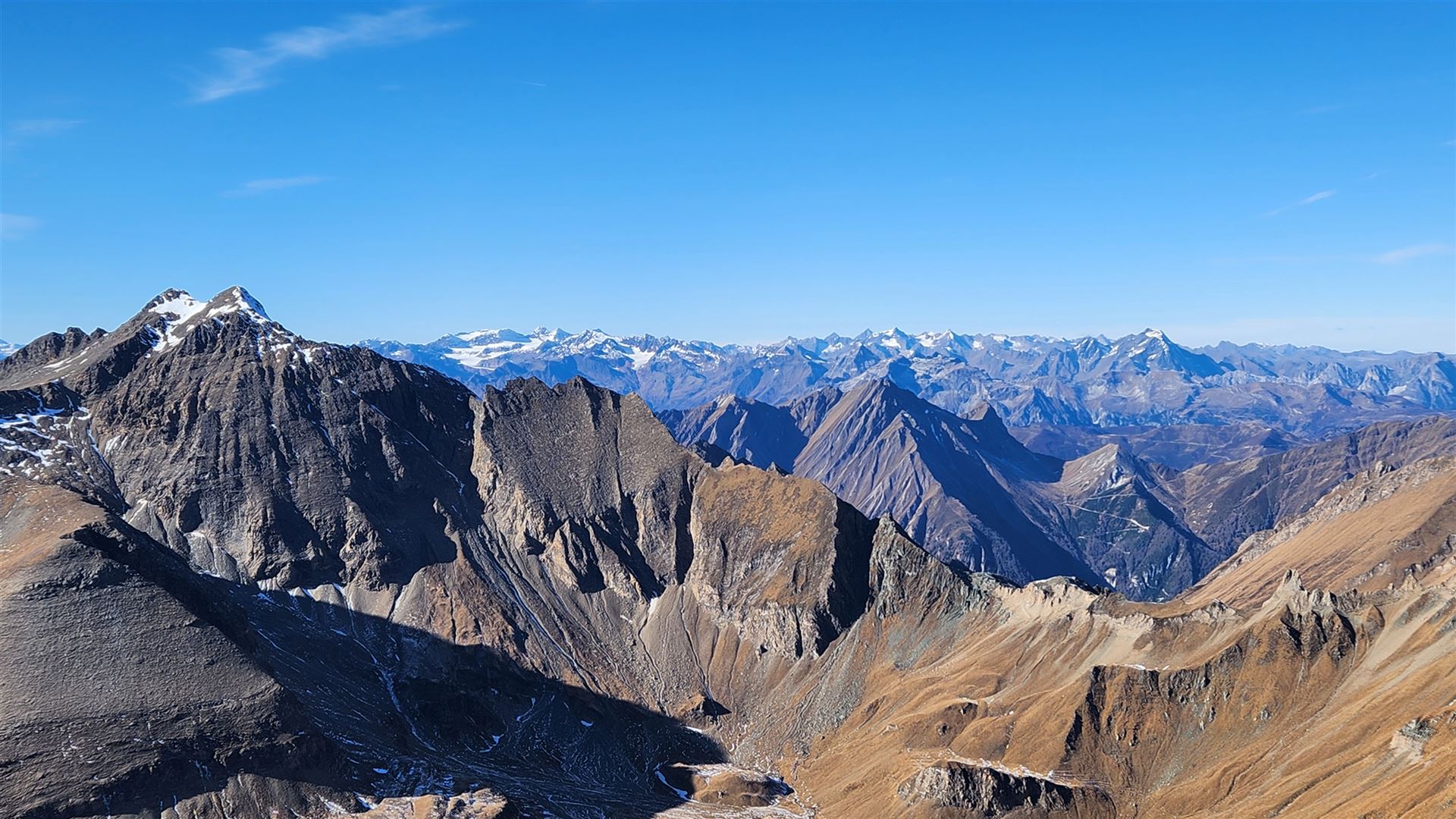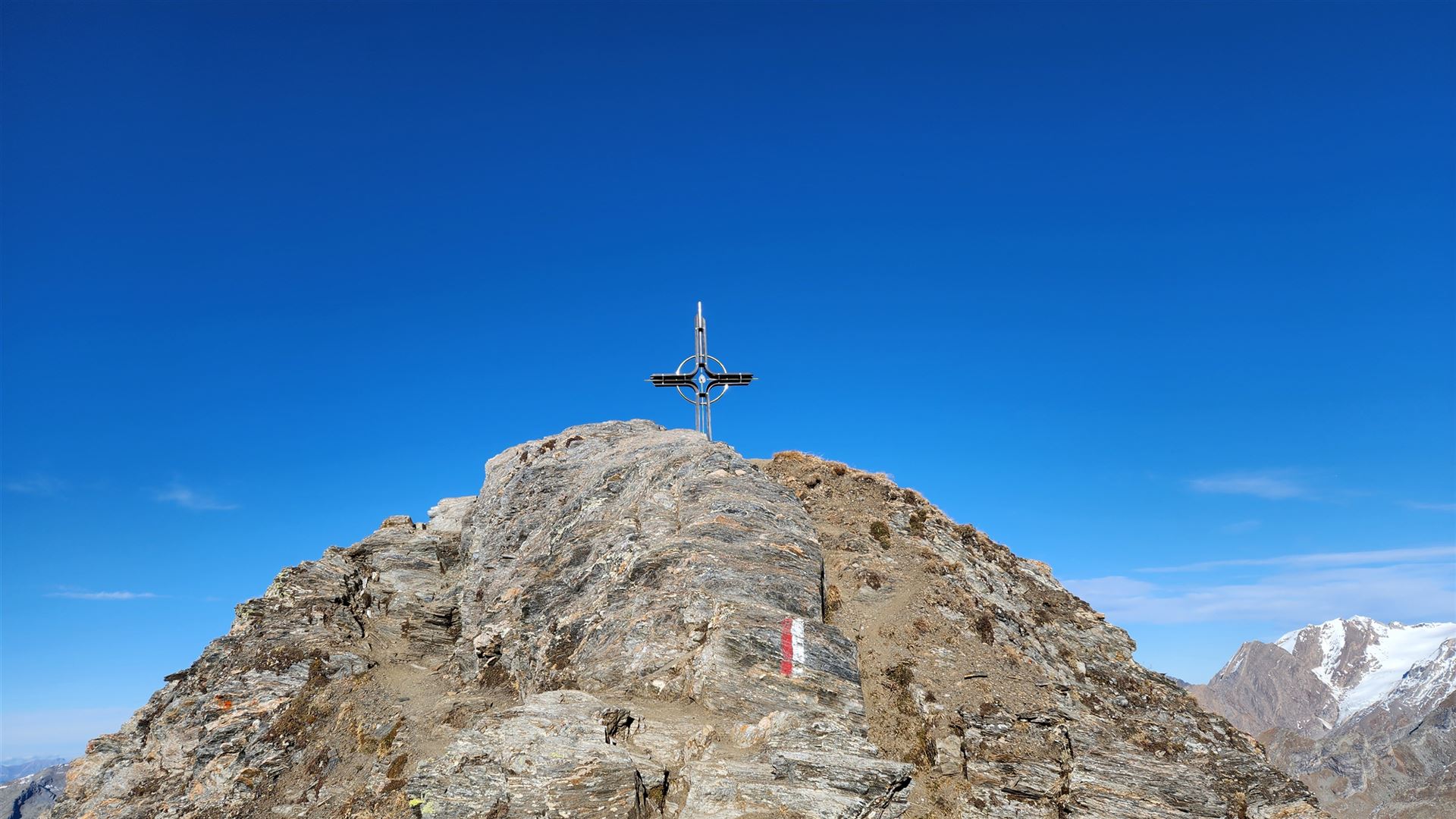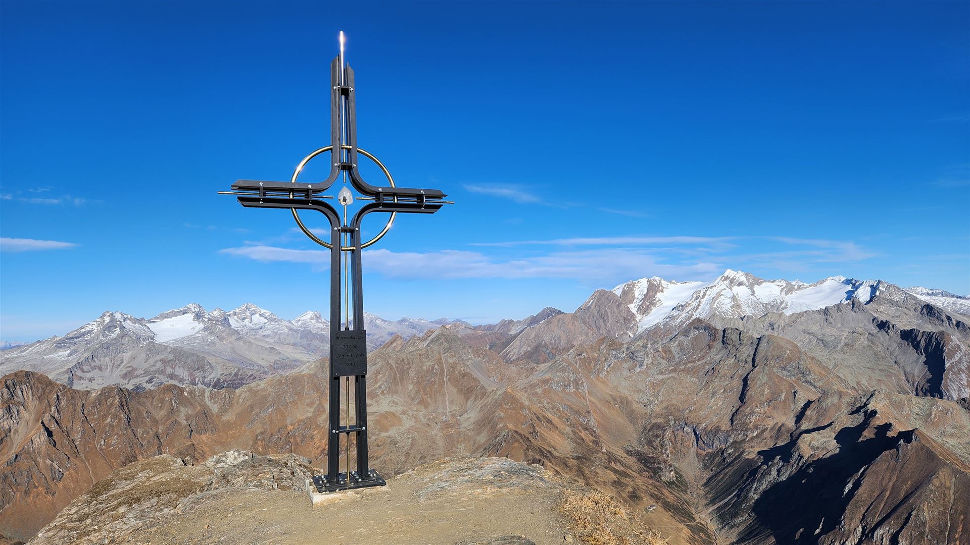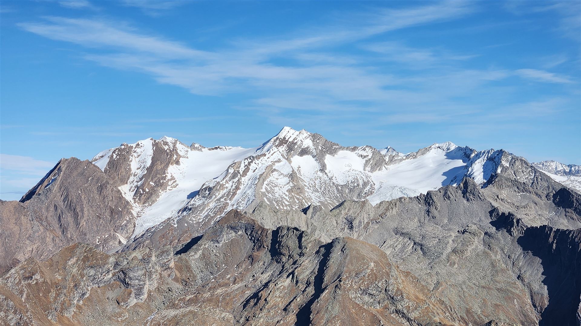 Im Westen liegt die Wilde Kreuzspitze, die ich mir fürs nächste Jahr vorgenommen habe. Dahinter sind Ortler, Hintere Schwärze, Weißkugel und Hirzer, vor allem aber die Stubaier Gletscher mit Wilder Freiger und Zuckerhütl gut zu sehen. Es folgen der Habicht mit der Ilmspitze. Auch die Serles muss zu sehen sein, diese zu identifizieren ist mir aber schwergefallen, trotz Fernglas.