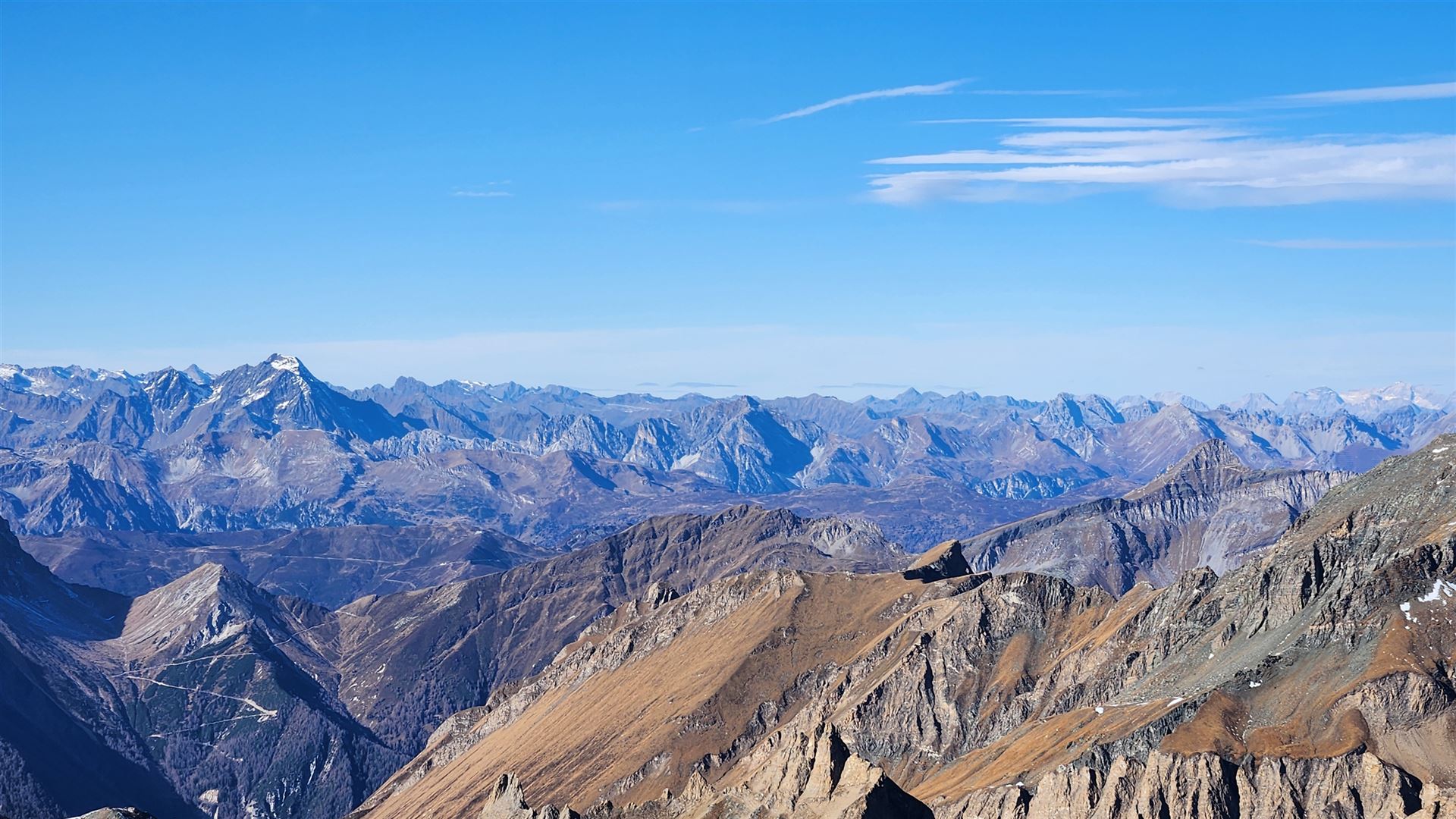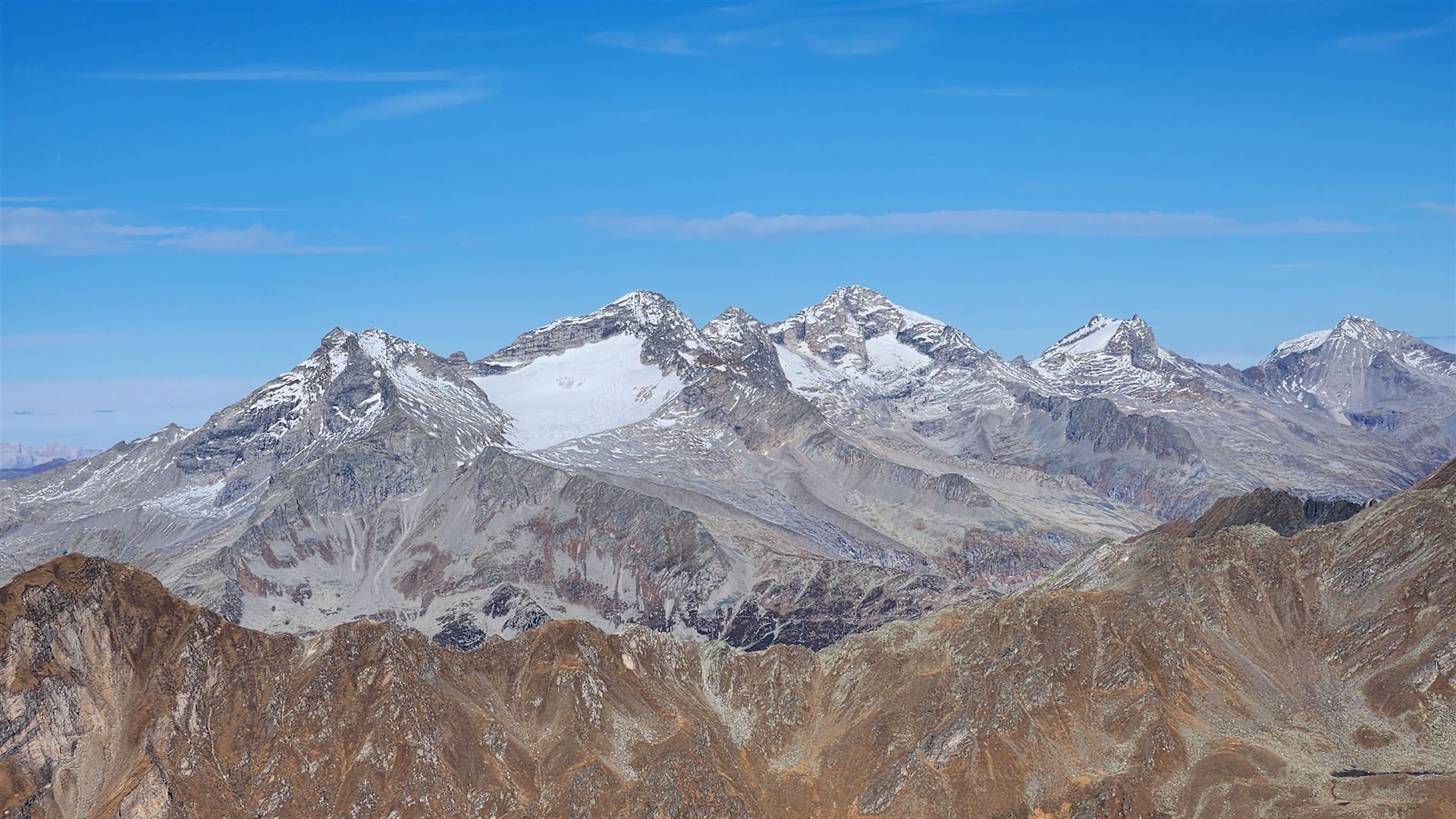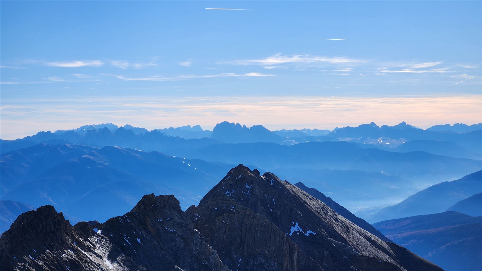Im Süden reicht das Panorama über die Sextener Sonnenuhr, die Dreischusterspitze und die Drei Zinnen hinter dem Dürrenstein zum Monte Cristallo. Der Langkofel liegt direkt hinter der vorgelagerten Rotwand. Die Geislerspitzen gehen im Vordergrund des Langkofels etwas unter. Es folgen der Antelao, die Tofana di Mezzo und der Monte Pelmo bei Cortina d’Ampezzo, weiter die Civetta und die Marmolada. Nicht zu vergessen die Schneeriesen im Osten, vom Großvenediger über den Großglockner bis zum Hochgall.