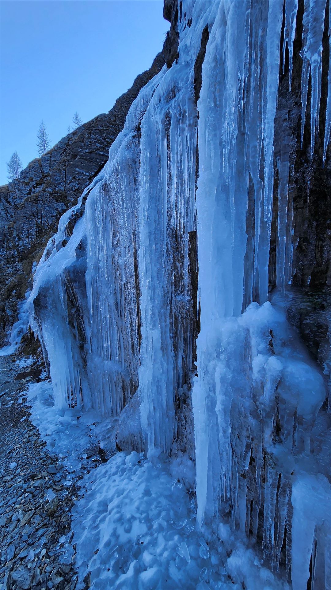 Die größten Gefahren beim Auf- und Abstieg stellten an diesem Tag die zugefrorenen Bachläufe und Eisbruch dar. Die Überquerung der Eisplatten war nicht ohne. Natürlich war ich zu bequem, die Grödel auszupacken. Dreimal habe ich es erlebt, dass Eisbrocken herabrieselten. Das erinnerte an Steinschläge.