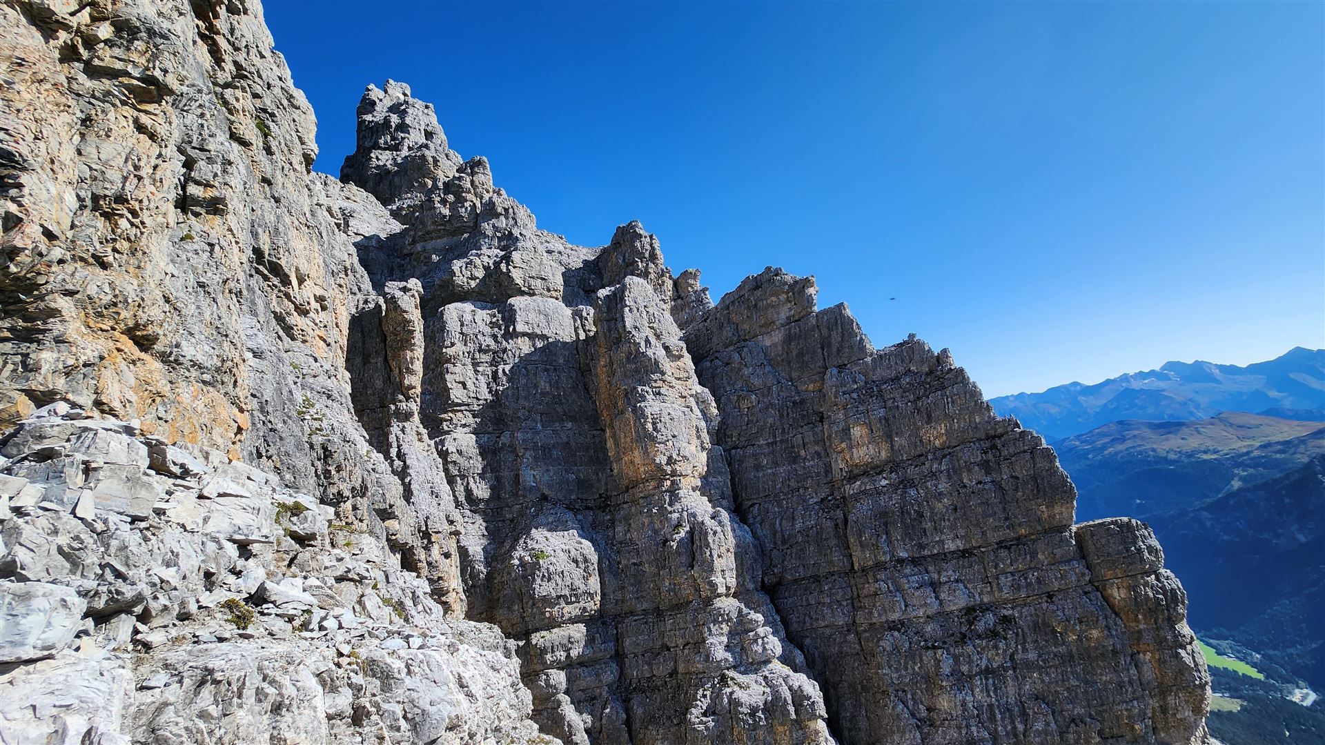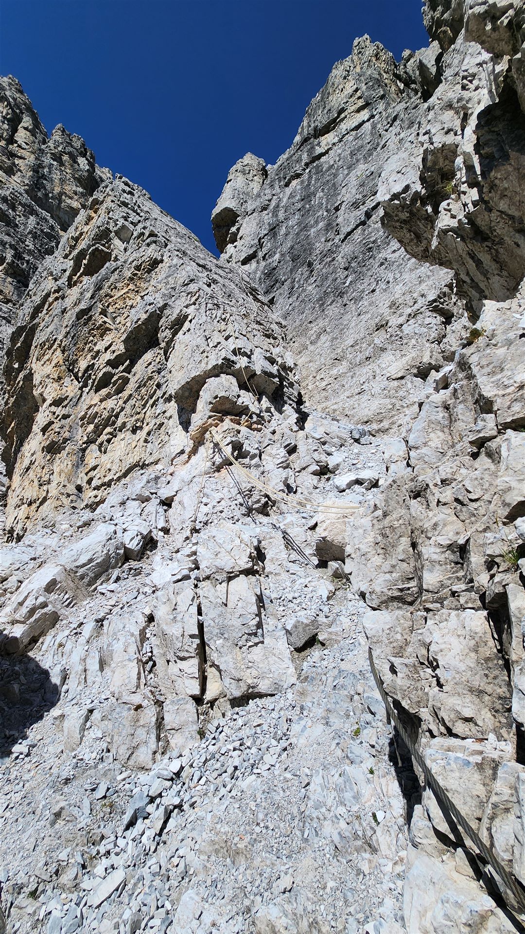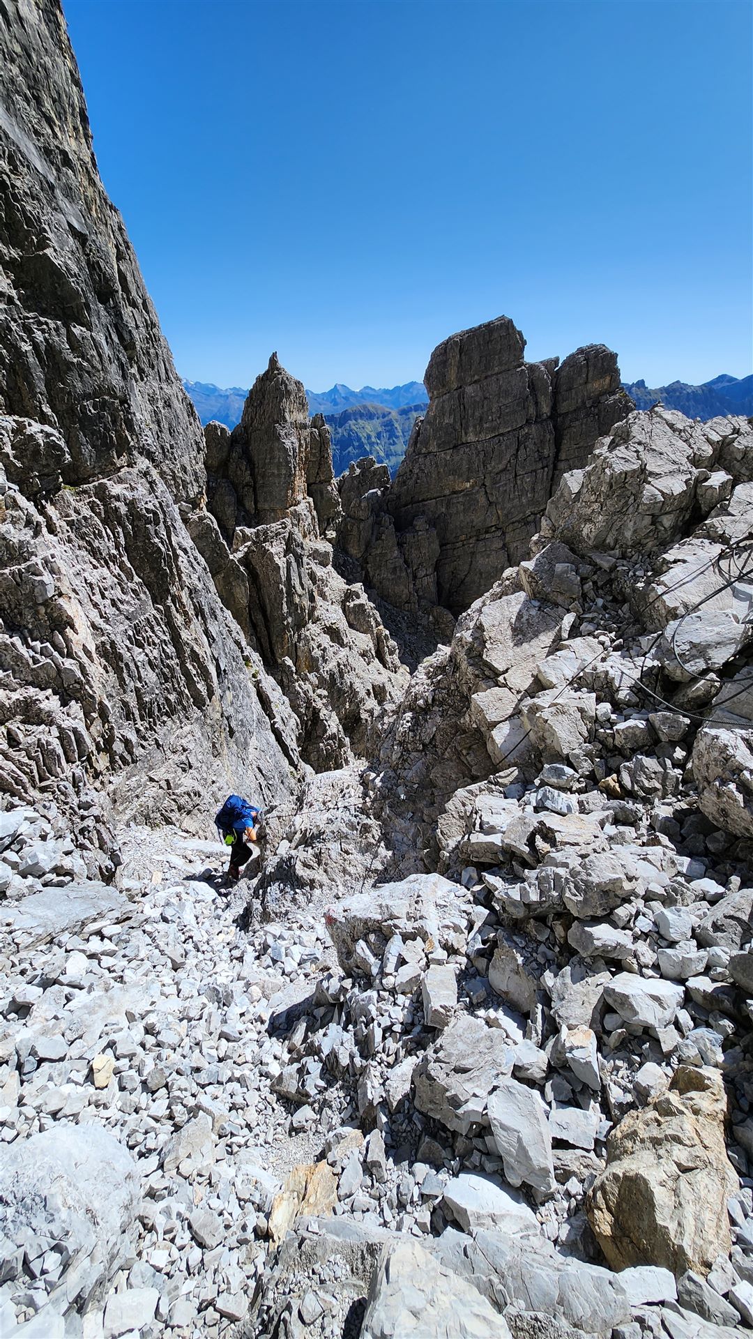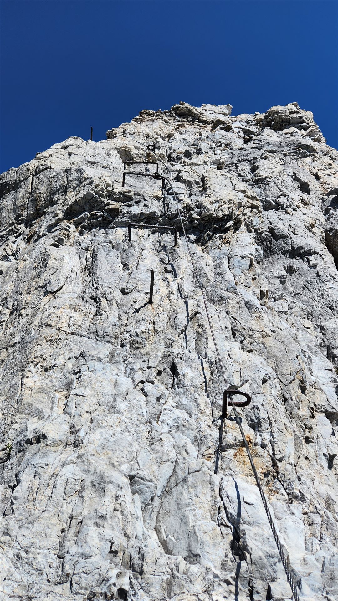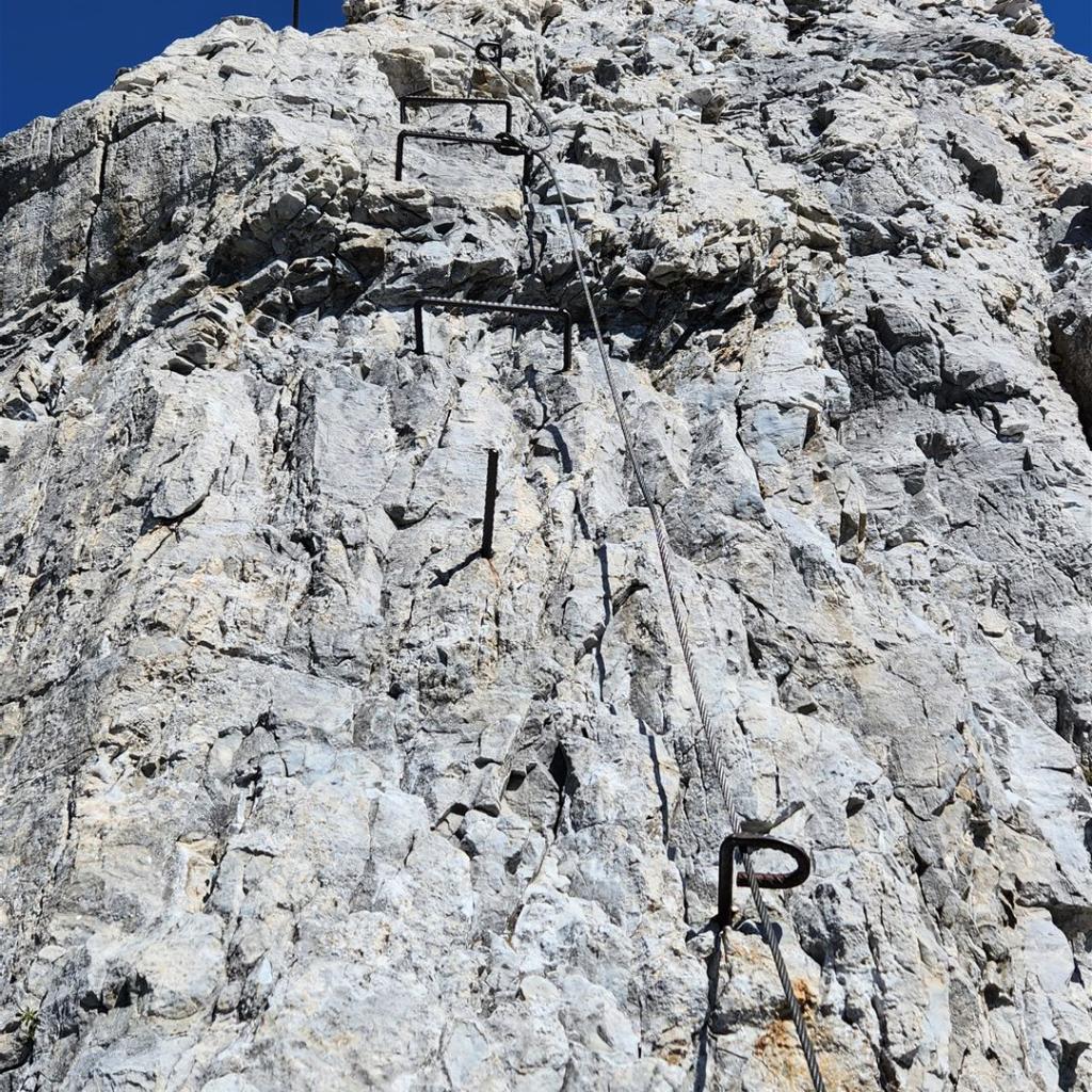 Der Klettersteig erfordert ca. 3,5 Stunden, mit Anmarsch und Gipfelpause ca. 6 Stunden. Der Klettersteig ist nichts für Anfänger, für geübte Klettersteiger jedoch problemlos machbar und sehr abwechslungsreich. Ich würde sagen Schwierigkeitsgrad C mit leichtem D. Am interessantesten fand ich den Spreizschritt über einen tiefen Felsspalt. Beim Abstieg (Rundtour) geht es über versicherte Schuttabhänge.