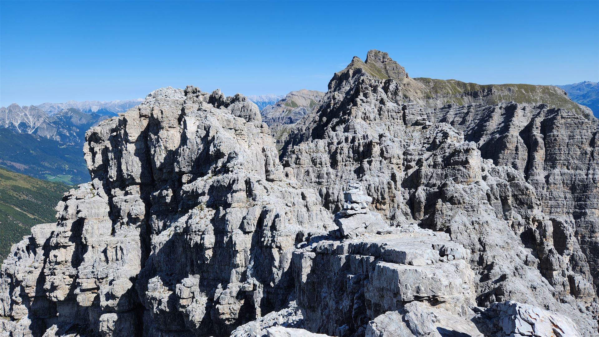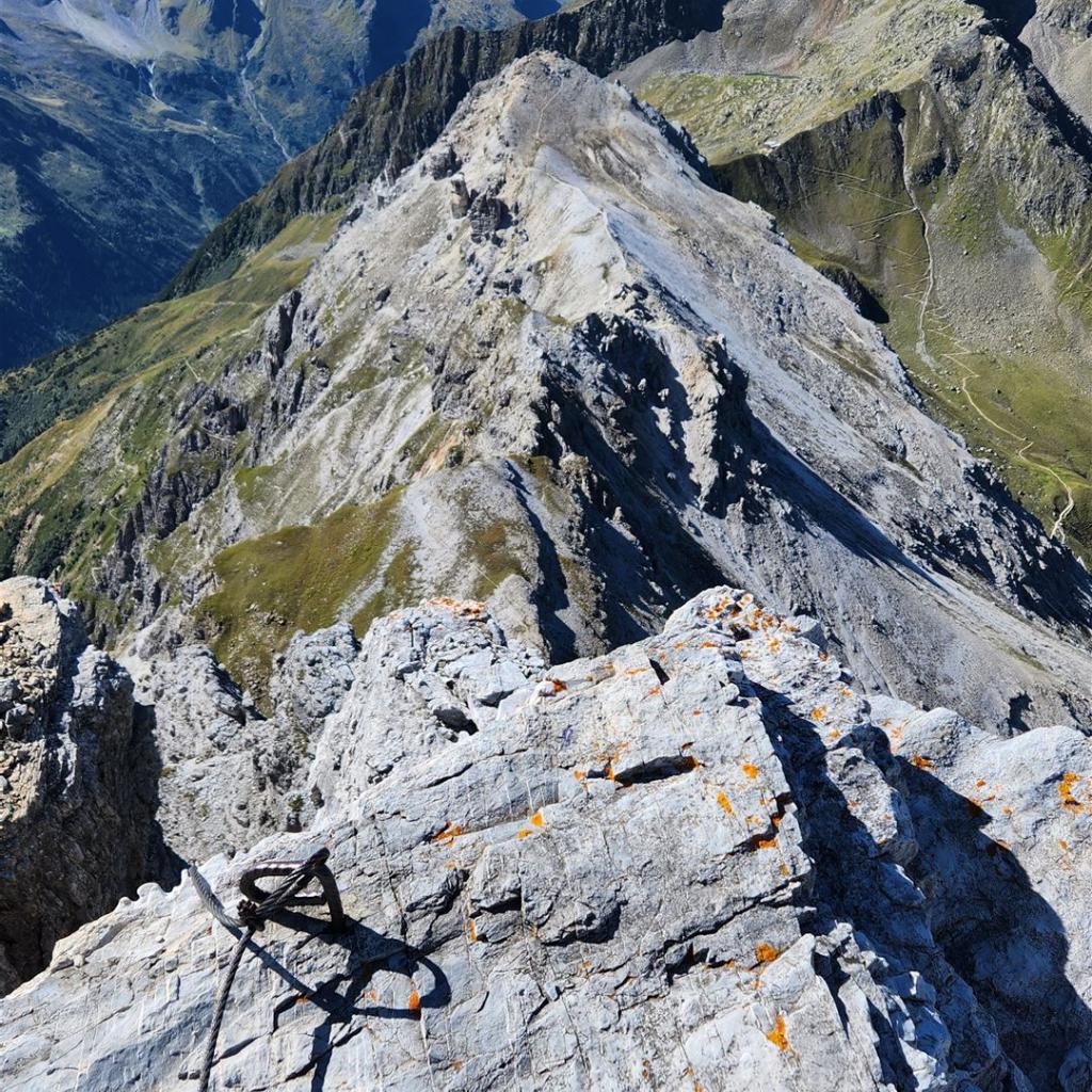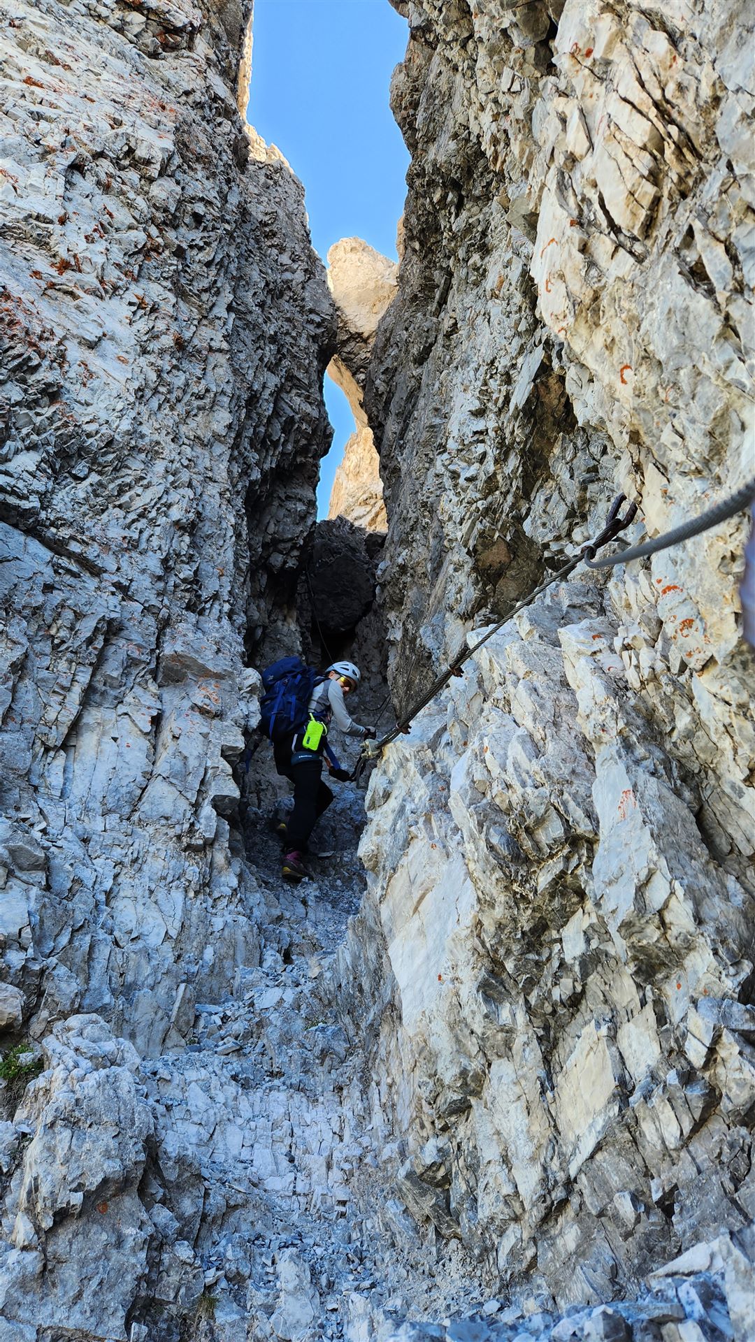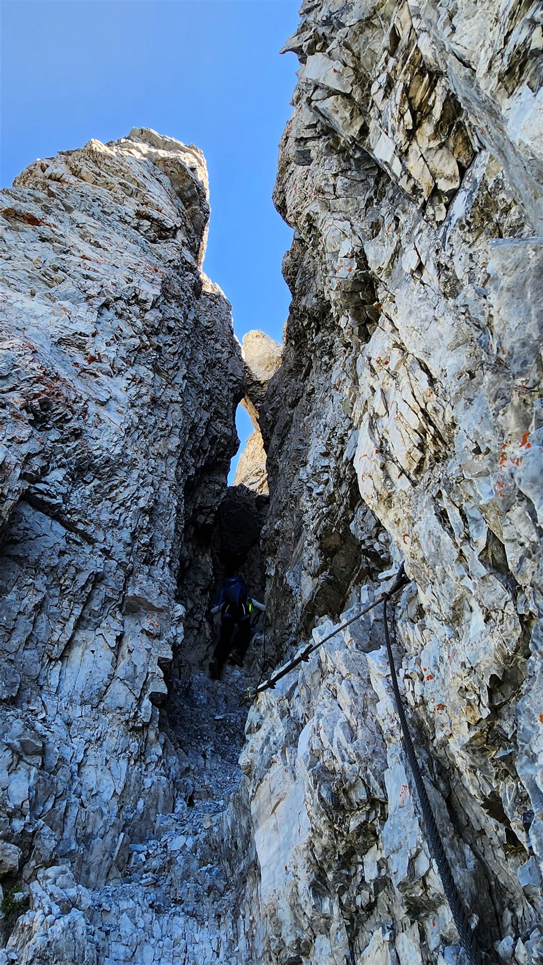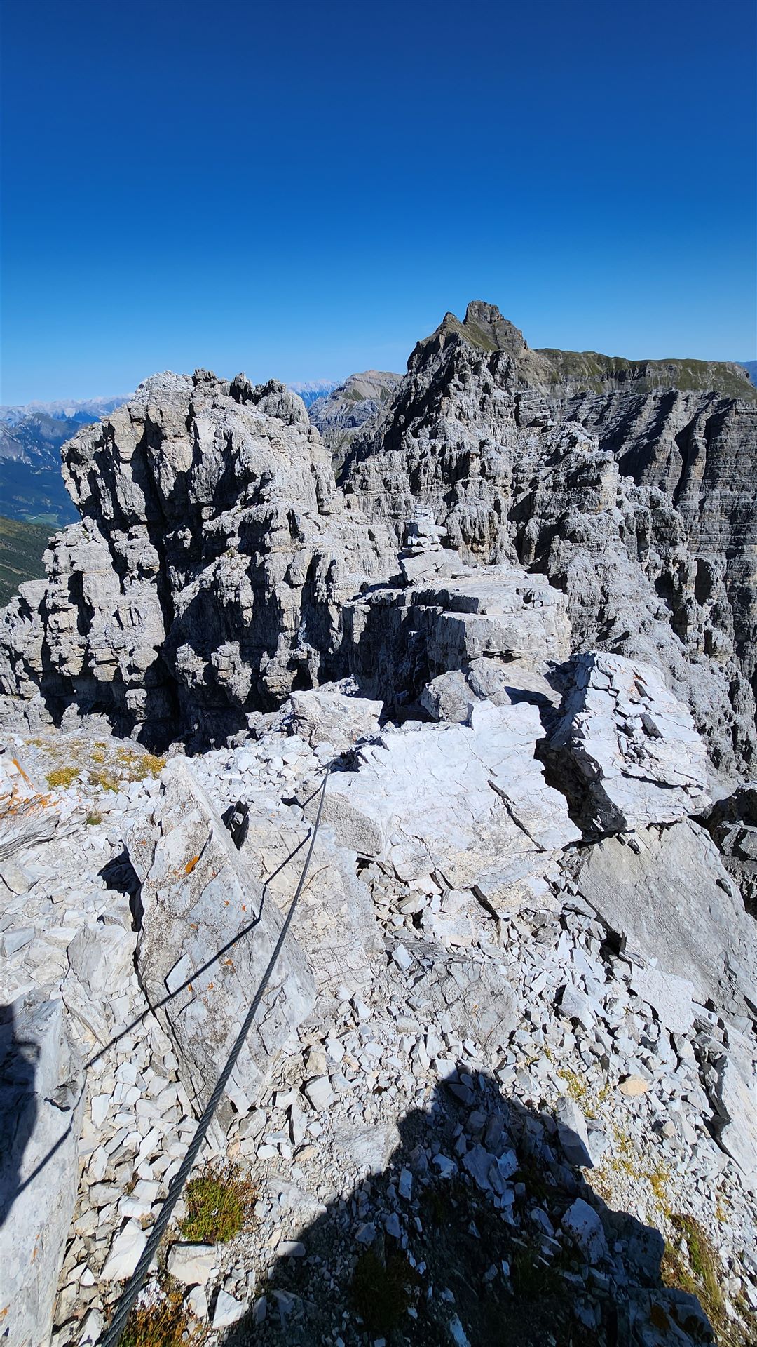 Der Klettersteig erfordert ca. 3,5 Stunden, mit Anmarsch und Gipfelpause ca. 6 Stunden. Der Klettersteig ist nichts für Anfänger, für geübte Klettersteiger jedoch problemlos machbar und sehr abwechslungsreich. Ich würde sagen Schwierigkeitsgrad C mit leichtem D. Am interessantesten fand ich den Spreizschritt über einen tiefen Felsspalt. Beim Abstieg (Rundtour) geht es über versicherte Schuttabhänge.