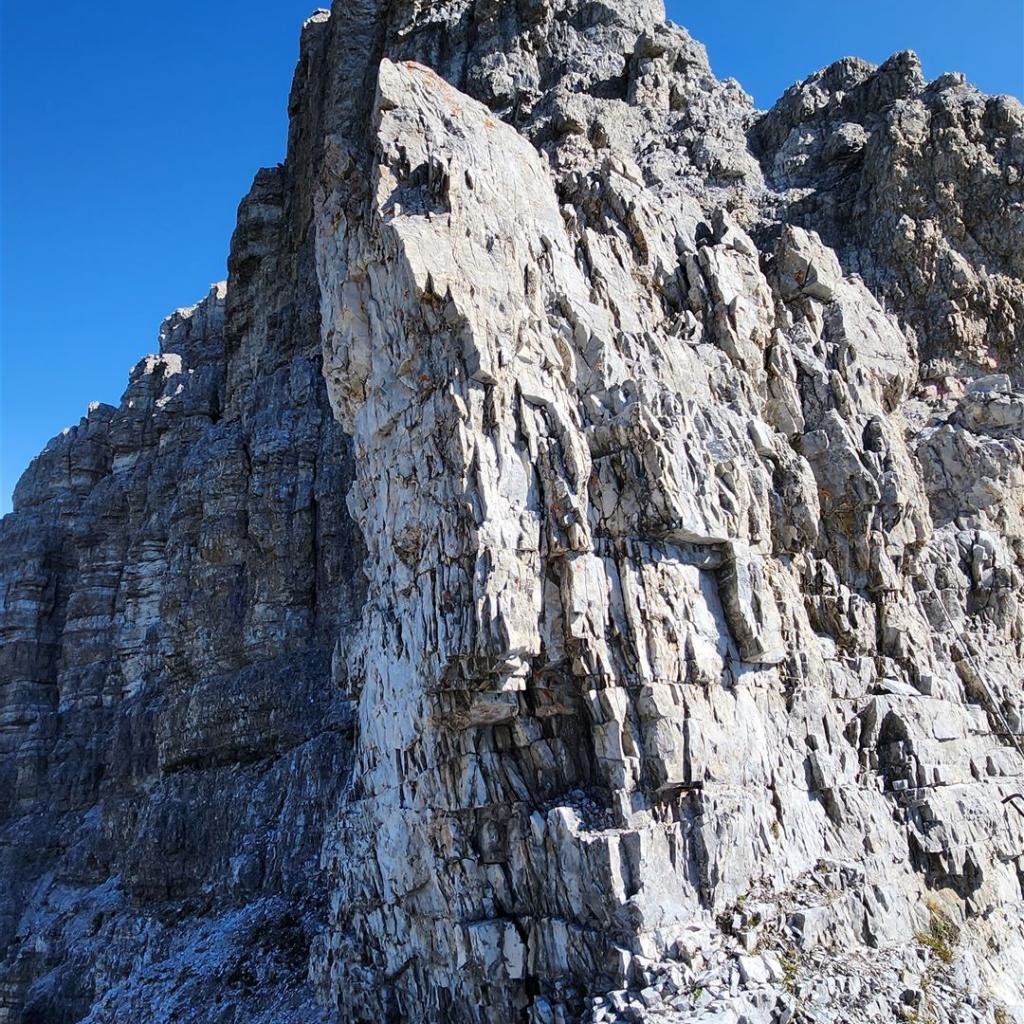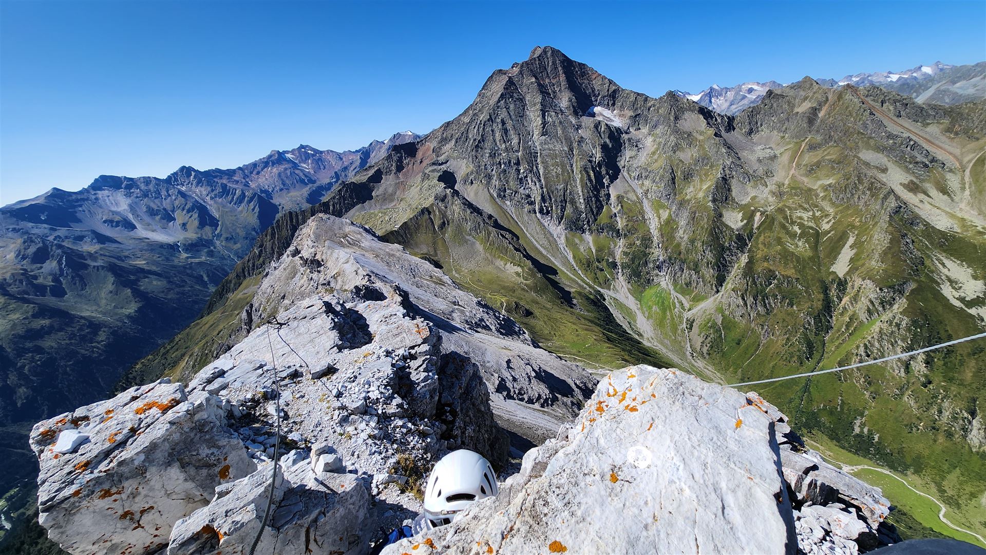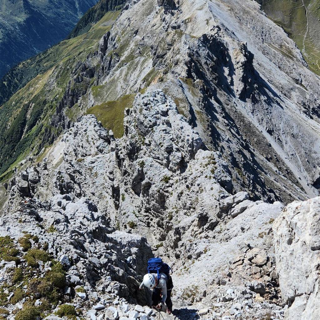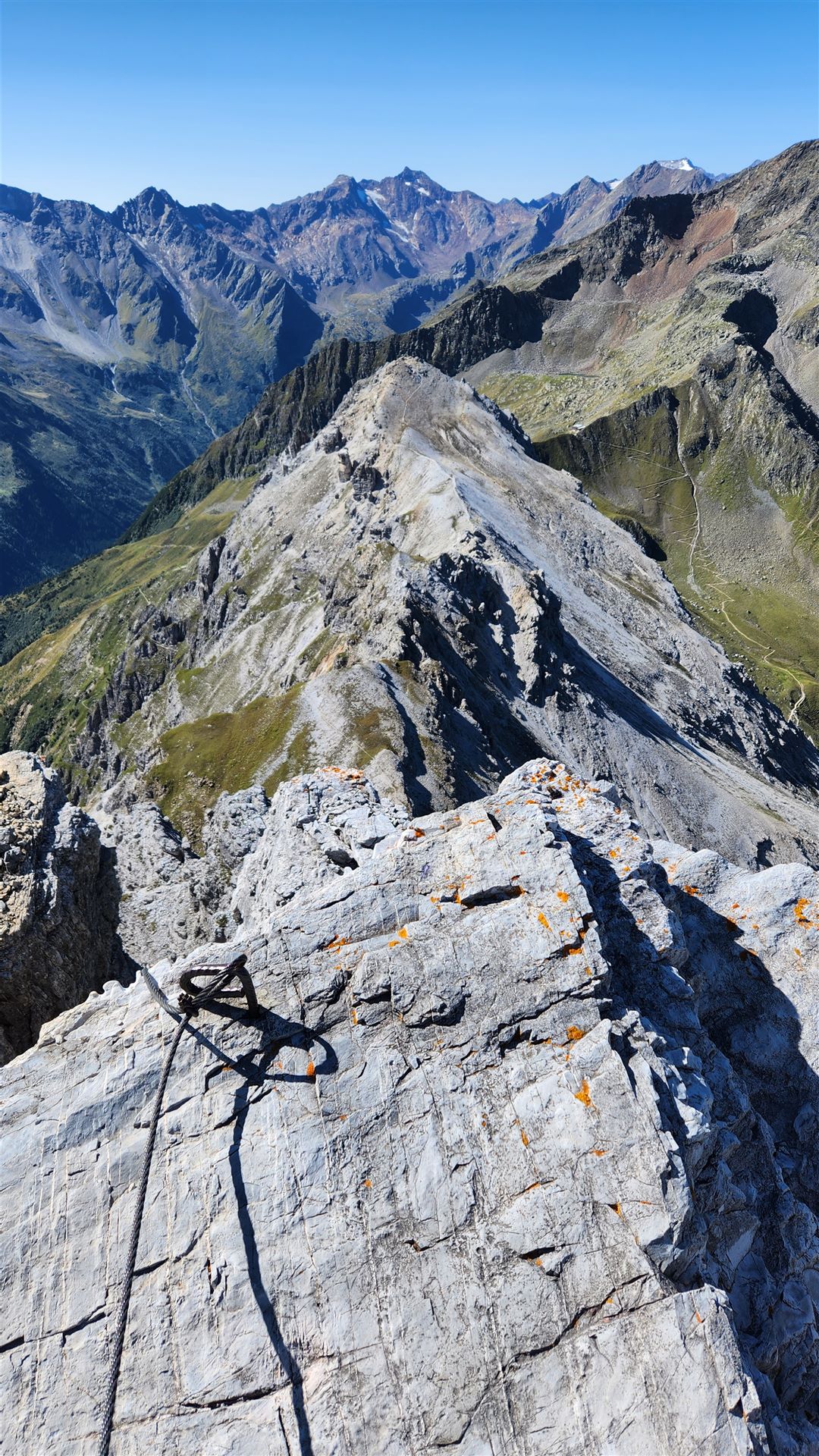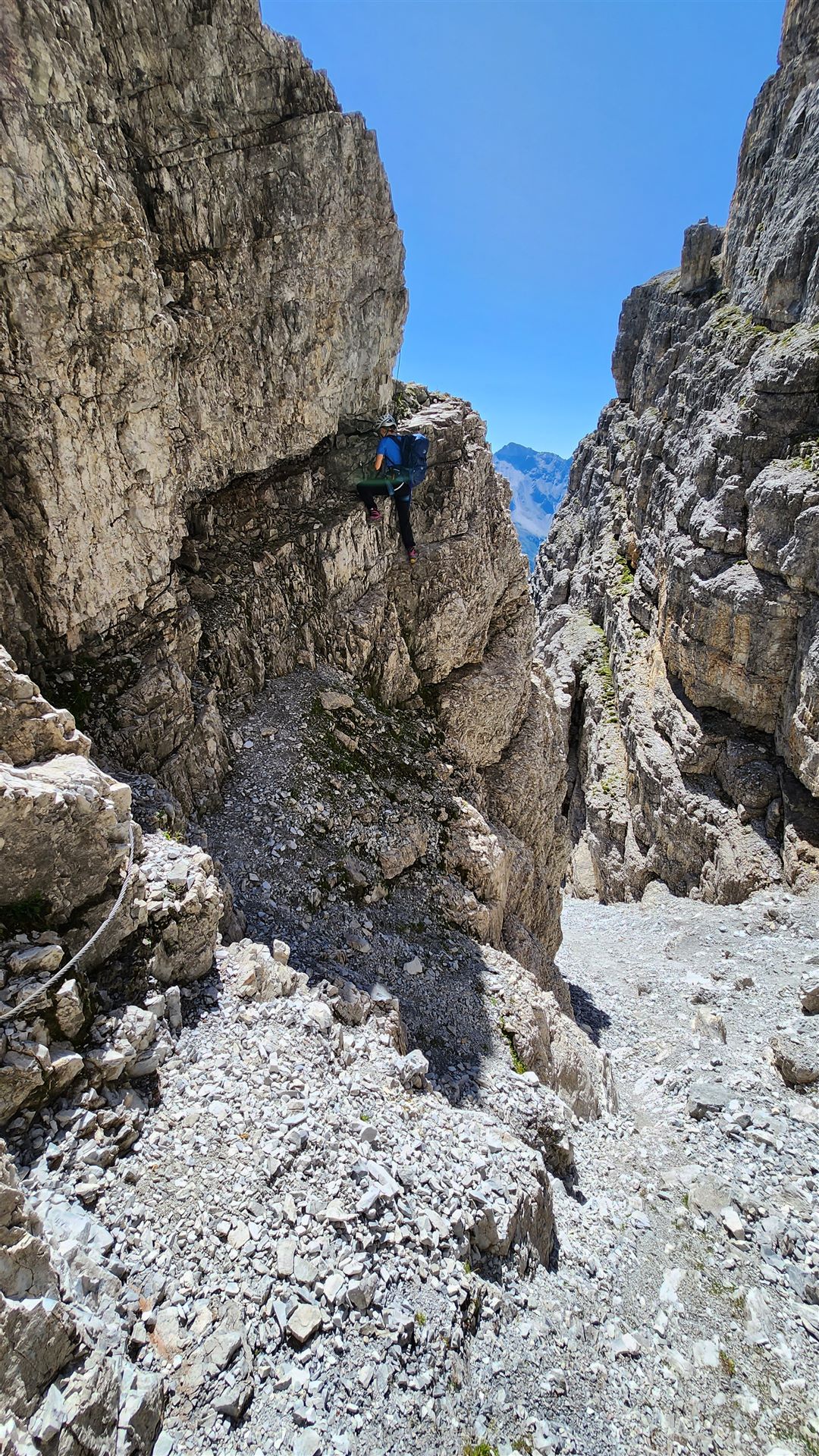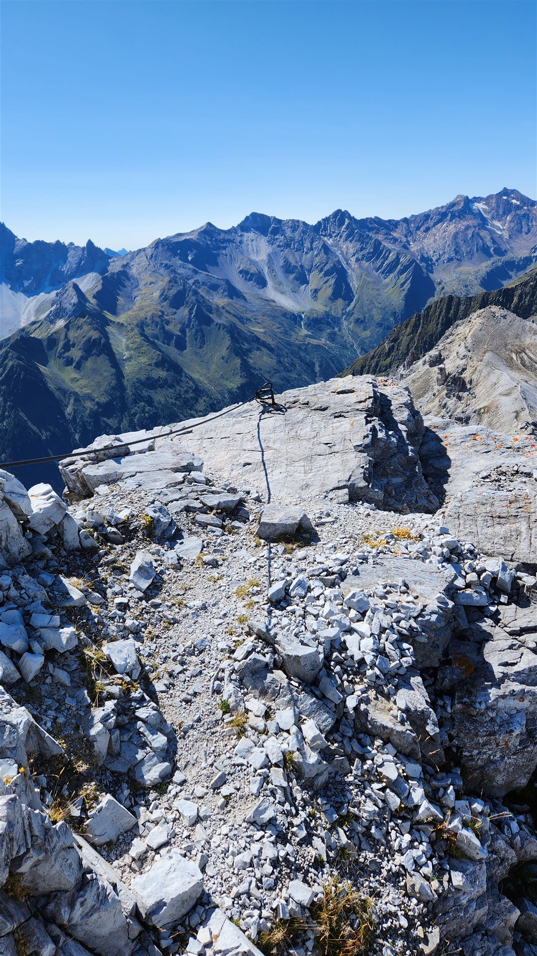 Der Klettersteig erfordert ca. 3,5 Stunden, mit Anmarsch und Gipfelpause ca. 6 Stunden. Der Klettersteig ist nichts für Anfänger, für geübte Klettersteiger jedoch problemlos machbar und sehr abwechslungsreich. Ich würde sagen Schwierigkeitsgrad C mit leichtem D. Am interessantesten fand ich den Spreizschritt über einen tiefen Felsspalt. Beim Abstieg (Rundtour) geht es über versicherte Schuttabhänge.