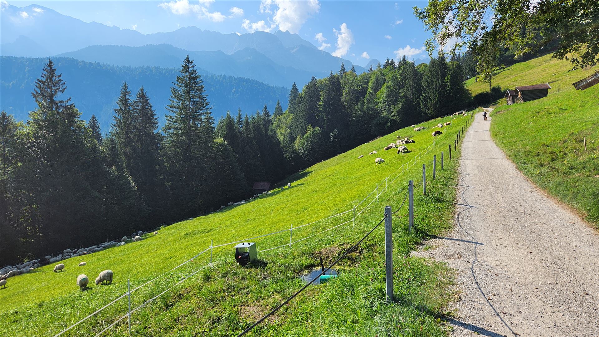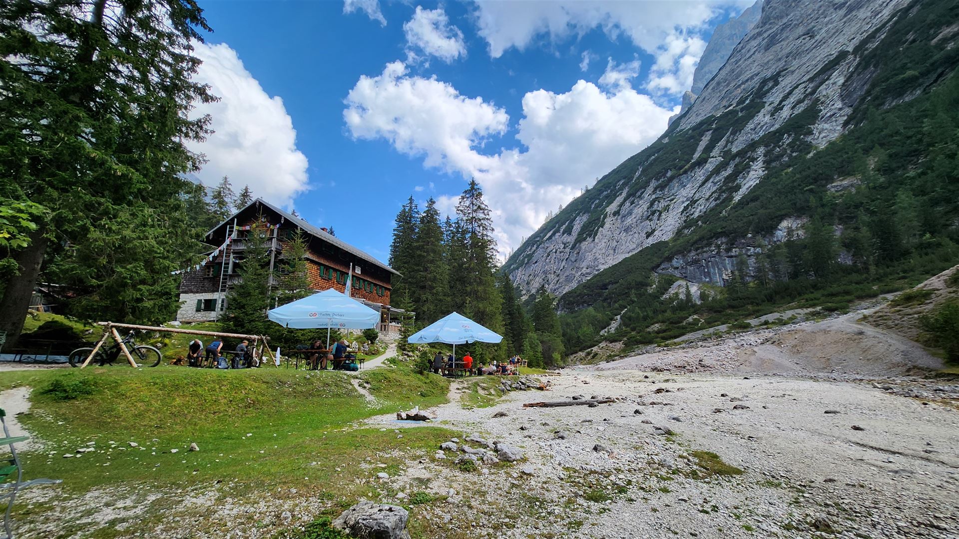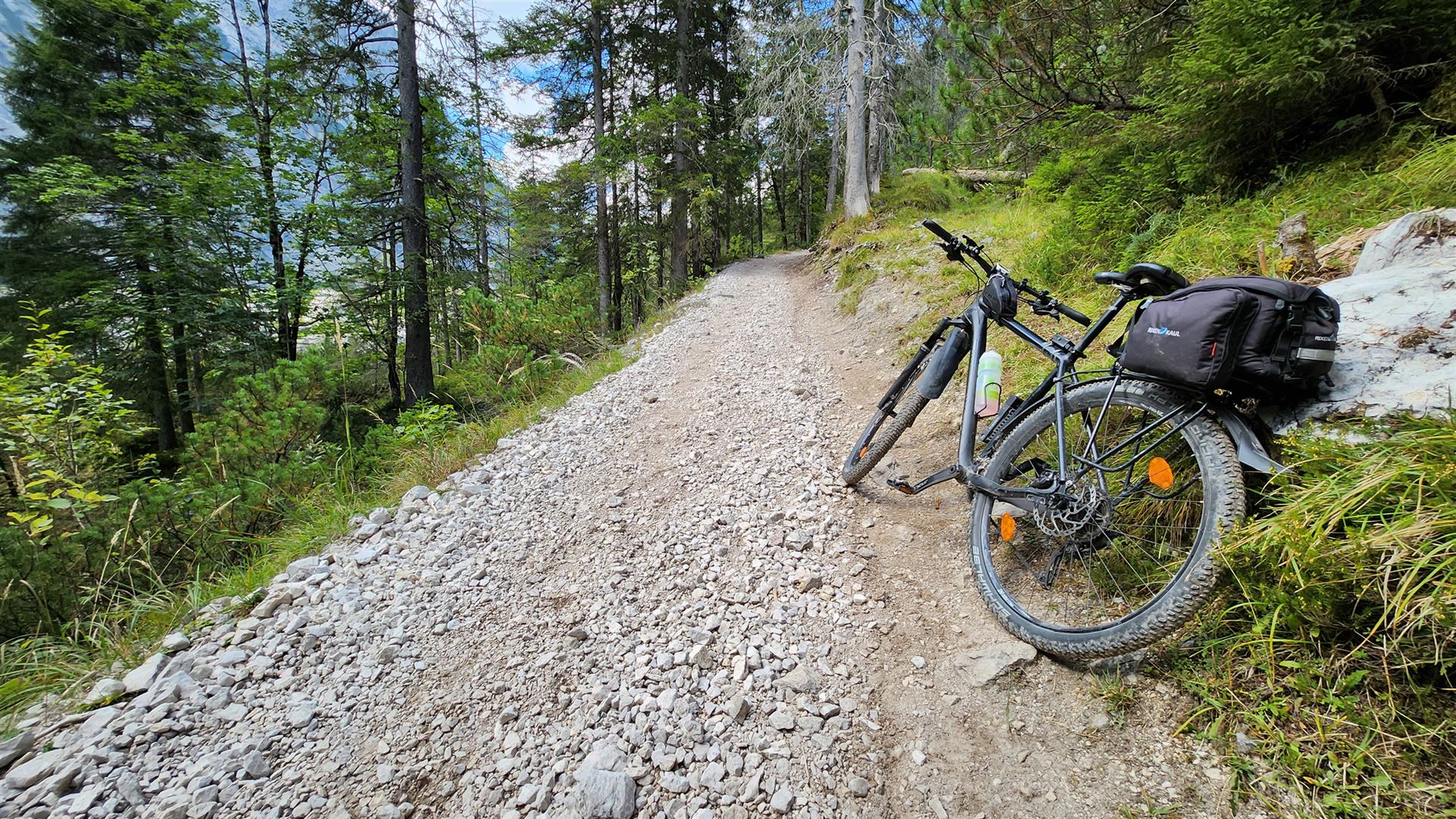 Bis zur Bockhütte (1052 m) lässt sich alles gut fahren. Auf den knapp 2 Stunden zur Reintalangerhütte (1369 m) war dann bei den Anstiegen mit großen Schottersteinen zum Teil Schieben angesagt. Der Vorteil mit dem Mountainbike ist dennoch die Zeitersparnis. Für den Rückweg zur Bockhütte benötigte ich nämlich nur 19 Minuten, denn abwärts ist der Schotter fast durchweg fahrbar.