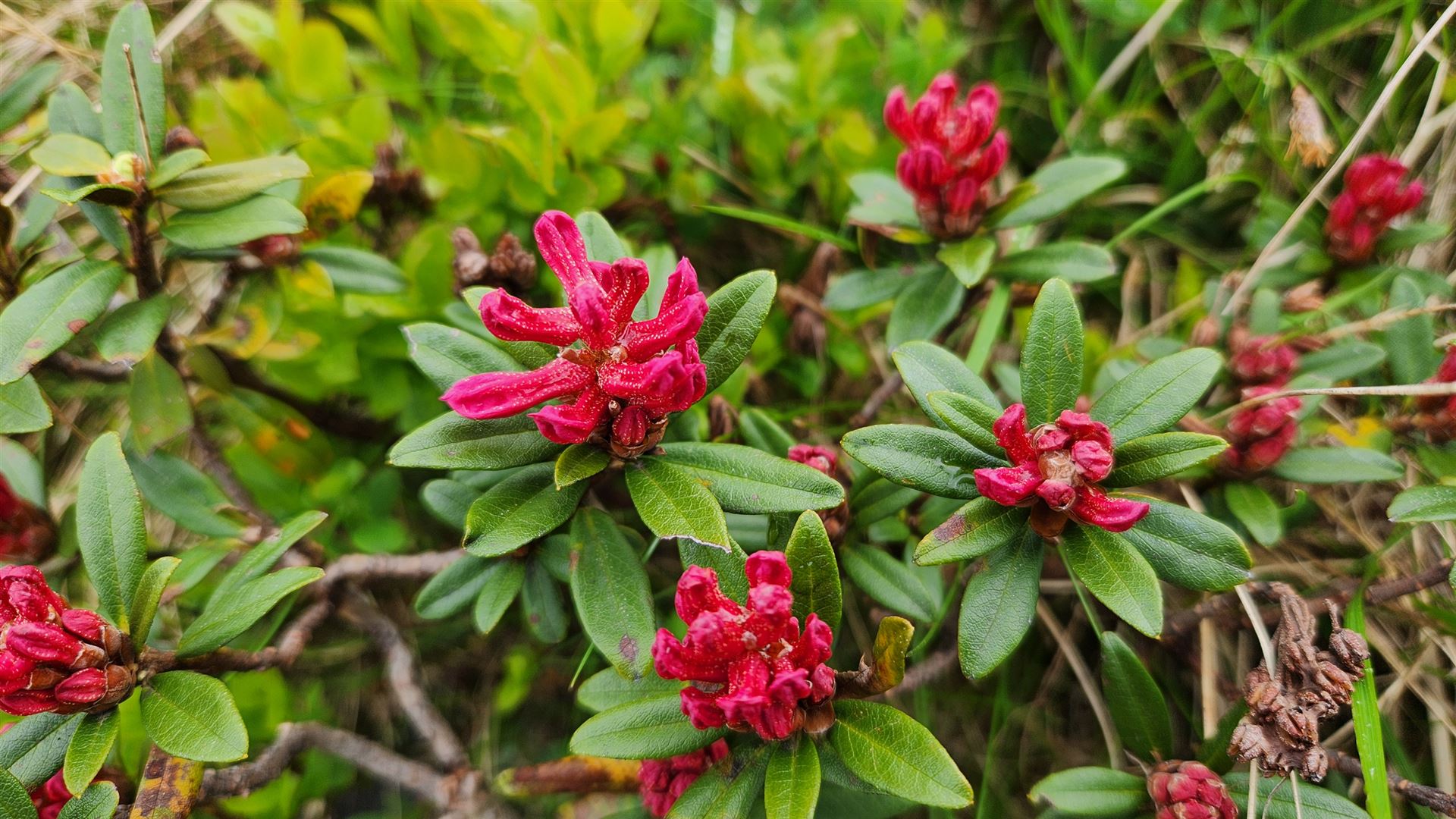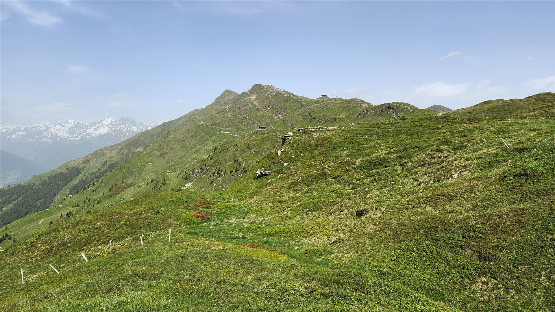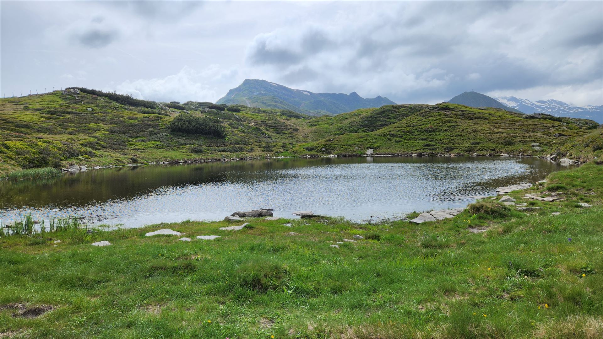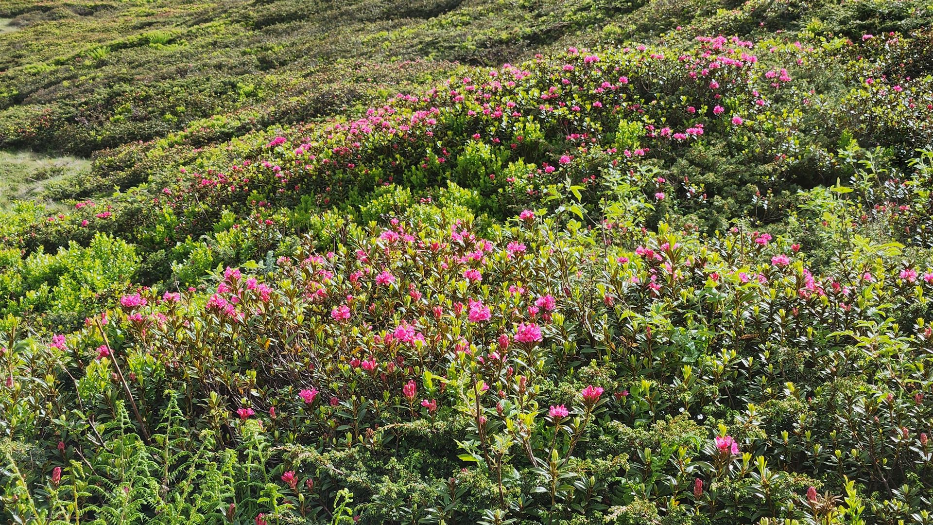 Ins Tal zurück oder rüber zur Jaufenpass-Straße wollte ich aber auch nicht fahren, denn ich hatte mir ja den Rinner Sattel vorgenommen. Zum Glück klarte das Wetter wieder auf. Und so wuchtete ich mein nicht gerade leichtes Mountainbike durch ein Meer von Almrosen hinauf zum Rinner Sattel, wo mich ein schöner Bergsee, der Wasserfaller See, erwartete. Dort muss man den Trail geradeaus weiterfahren, nicht nach rechts. Die Beschilderung „Fleckner“ steht für den Berg und nicht für die „Fleckner-Hütte“!