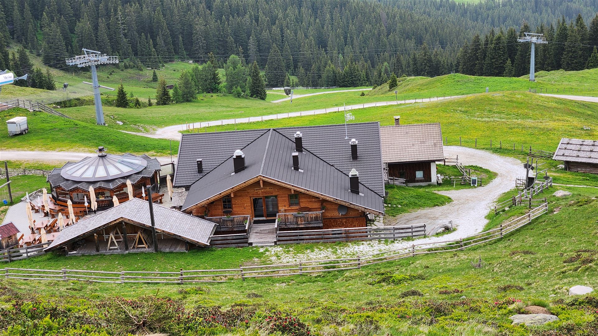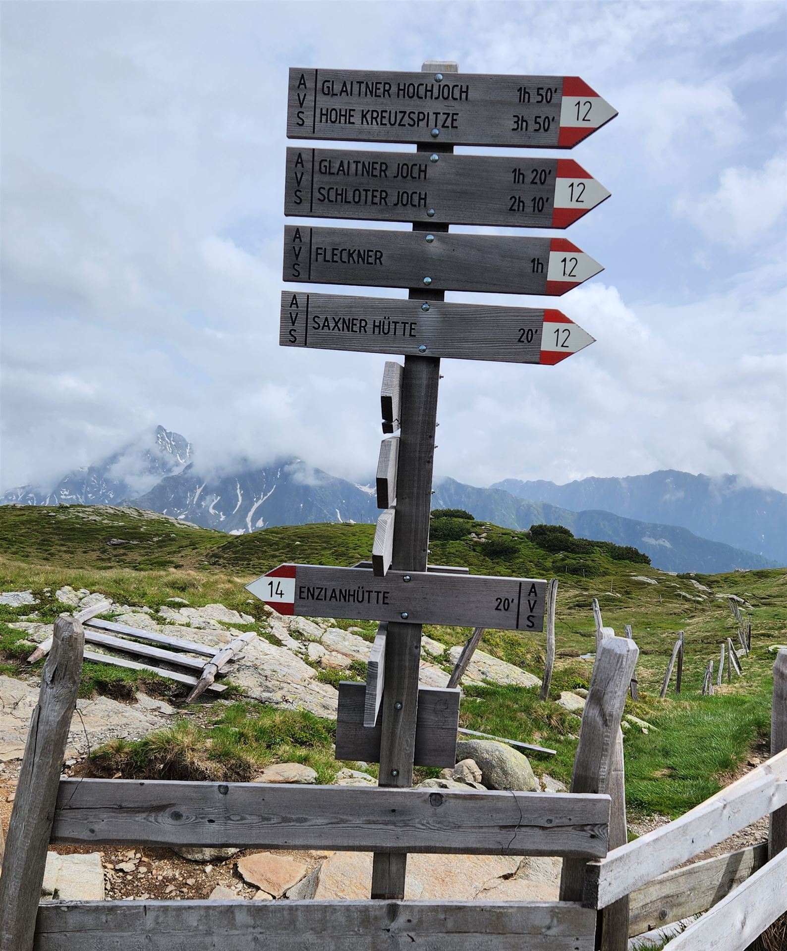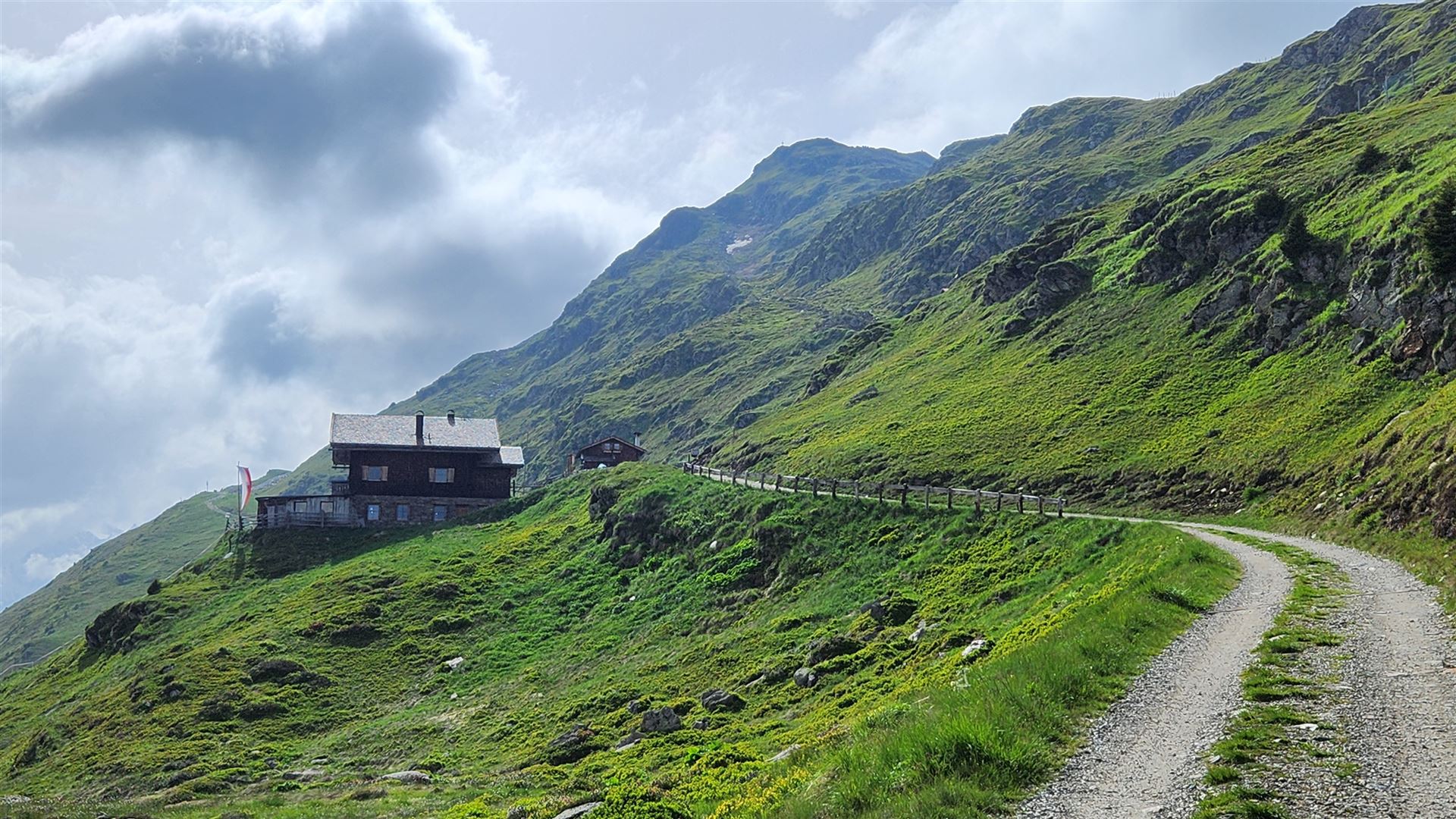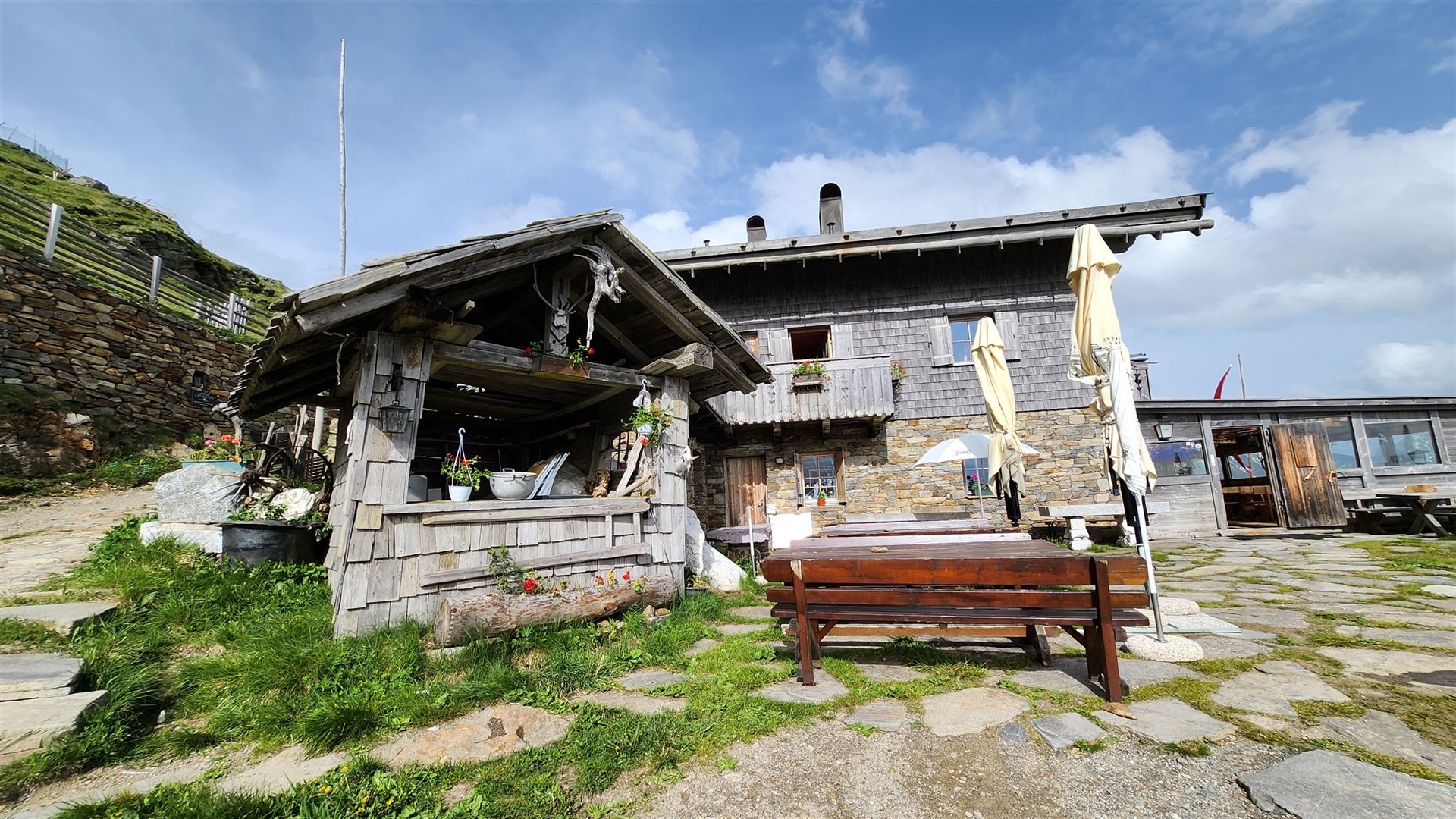 Kurz unterhalb des Sattels befindet sich ein geschotterter Parkplatz, der von der Jaufenpass-Straße (Römerkehre) zu erreichen ist. Ich fuhr noch das kleine Stück den Forstweg hinauf zur Fleckner-Hütte auf 2100 m. Inzwischen war es 17 Uhr und ich hoffte, dort übernachten zu können. Bei der Hütte war es jedoch sehr ruhig und auf einem Schild stand „Freitag Ruhetag“ – das wäre morgen gewesen. Ich befürchtete deshalb, dass die Hütte geschlossen ist und ich ins Passeiertal abfahren muss.