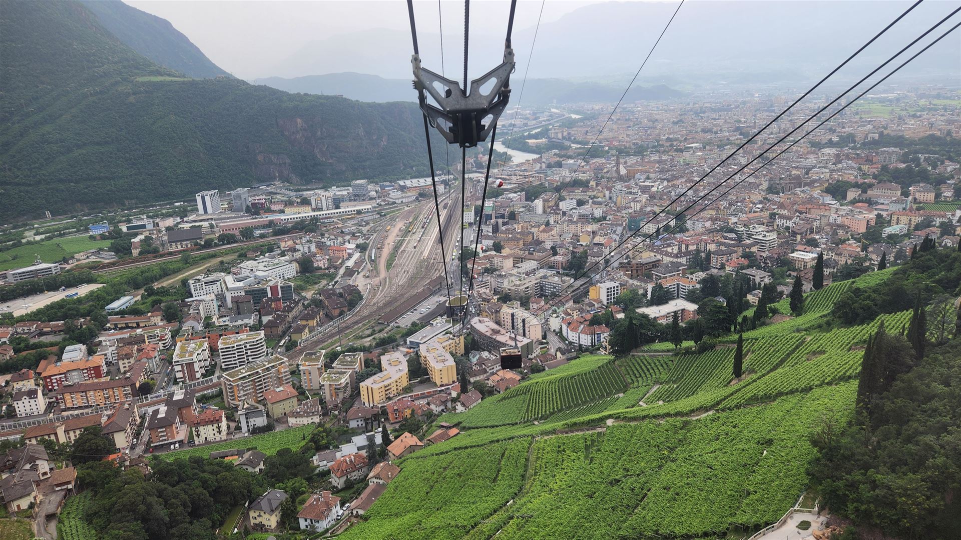 Nach fünfeinhalb Stunden und 73 Kilometern hatte ich zudem keine Lust mehr, die 1000 Höhenmeter hinauf nach Oberbozen zu fahren. Deshalb entschied ich mich für die Rittner Seilbahn (Bergfahrt 6 Euro + 7 Euro für das Fahrrad). Lieber wollte ich mir einen guten Eindruck von Oberbozen, dem Ritten und den Erdpyramiden verschaffen. Interessant ist die Schmalspurbahn, die 8,5 km von Oberbozen bis Klobenstein verläuft. Dabei habe ich nach Möglichkeit die schöneren Wege abseits der allerdings wenig befahrenen Straße gewählt und eine Runde um den Wolfsgrubner See gedreht (leichter Trail). Bei der Arena Ritten war ich überrascht, dass „Ritten Sport“ in den letzten Jahren mehrmals den italienischen Eishockey-Meister stellte. Zwischen Klobenstein und Lengmoos fuhr ich noch die Fenn-Promenade ab, eine kleine Mountainbike-Runde. Der Blick fiel hinüber zum Schlern, dem Südtiroler Symbolberg. Der Langkofel dahinter war jedoch kaum zu erkennen, dafür war es zu diesig.