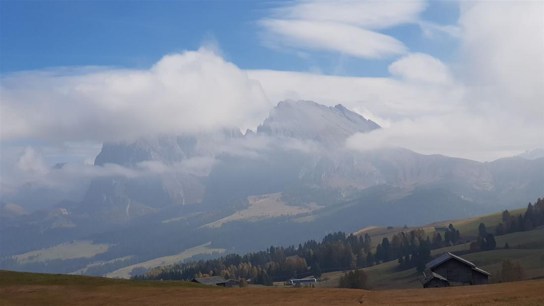 Von Kastelruth fuhr ich zunächst die geteerte Straße nach Compatsch, wo sich die Bergstation der Seiser Alm Bahn befindet. Die Straße darf von 9 bis 17 Uhr nur von Anwohnern und Hotel-Gästen befahren werden. Der Verkehr hielt sich so in Grenzen. Von Compatsch folgte ich der Panorama-Runde über das Hotel Goldknopf und die Almrosenhütte zur Mahlknechthütte. Wolken und Nebel ließen keinen freien Blick auf den Langkofel zu, nur auf den daneben befindlichen Plattkofel. Von der Mahlknechthütte ging es erst noch einmal bergab, bevor der lange Anstieg zur Tierser Alpl Hütte folgte. Die letzte Stunde habe ich nur noch geschoben. Aber je länger der Tag dauerte, desto mehr verzogen sich die Wolken.