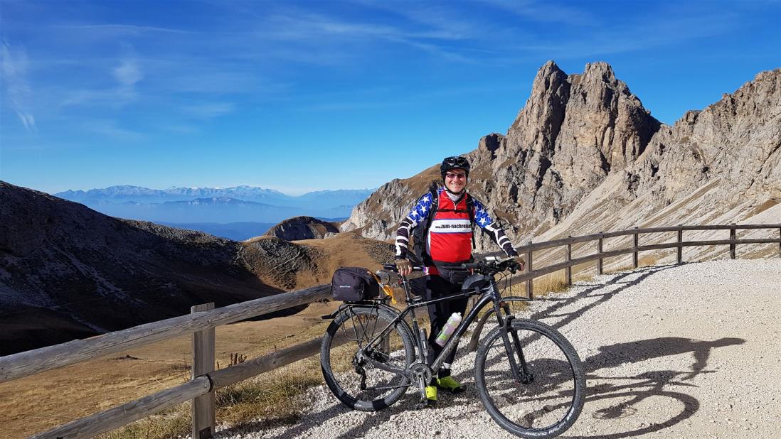 Ich habe lange überlegt, welchen Weg ich heute einschlagen soll. Noch eine große Wanderung oder Weiterfahren? Ich habe mich für Letzteres entschieden, zum Glück aber meine eigene Tour geplant. Wäre ich von der Tierser Alpl Hütte direkt durchs Val Duron ins Fassatal abgefahren, wie verschiedentlich empfohlen, hätte ich einiges verpasst. Stattdessen bin ich rund um den Langkofel gefahren und entlang der Sella Gruppe über das Sellajoch ins Fassatal. Das war gut fahrbar. Nur kurze Schiebepassagen. Es war sensationell. In der Ferne strahlte der Marmolada-Gletscher.