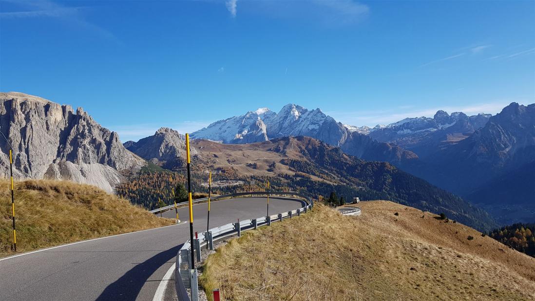 Vom Sellajoch bin ich nicht den Nebenweg ins Tal gefahren, sondern auf der Straße. Das ist durchaus interessanter und eröffnete noch einmal andere Blicke auf die Sella-Gruppe und die Marmolada. Bergab stören die Autos weniger. War eh fast nichts los. Im Sommer sieht das anders aus!