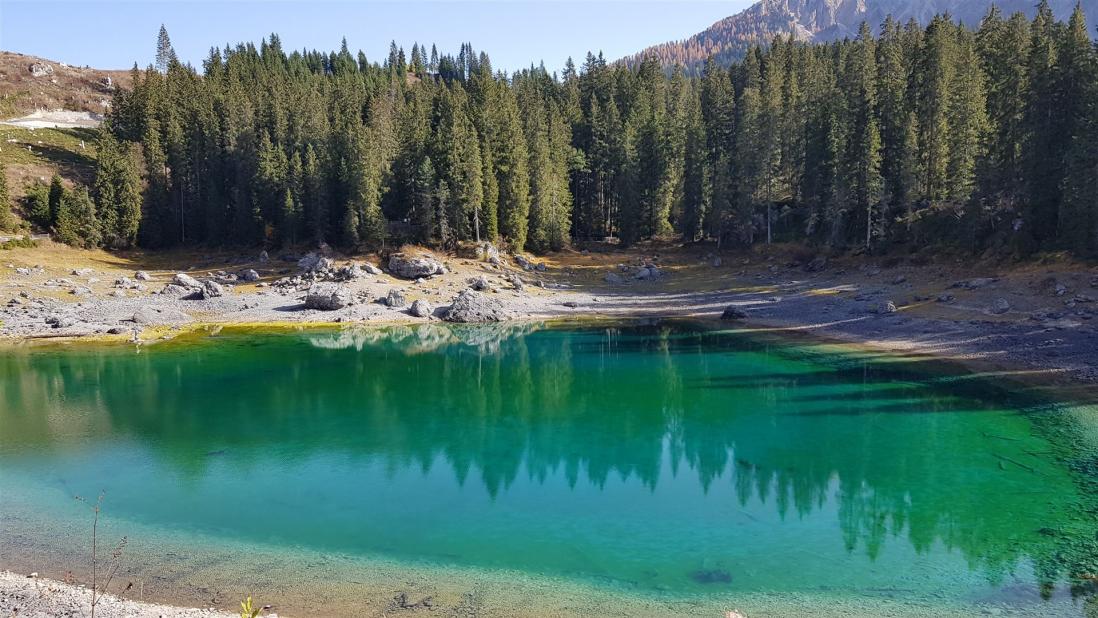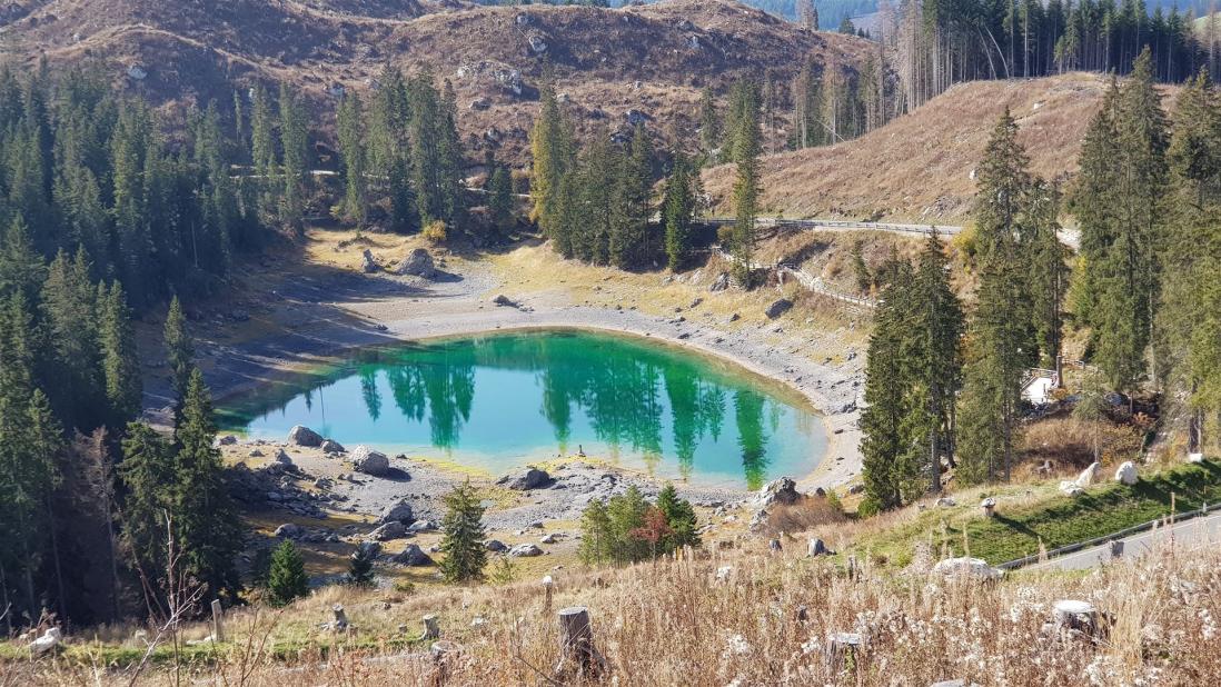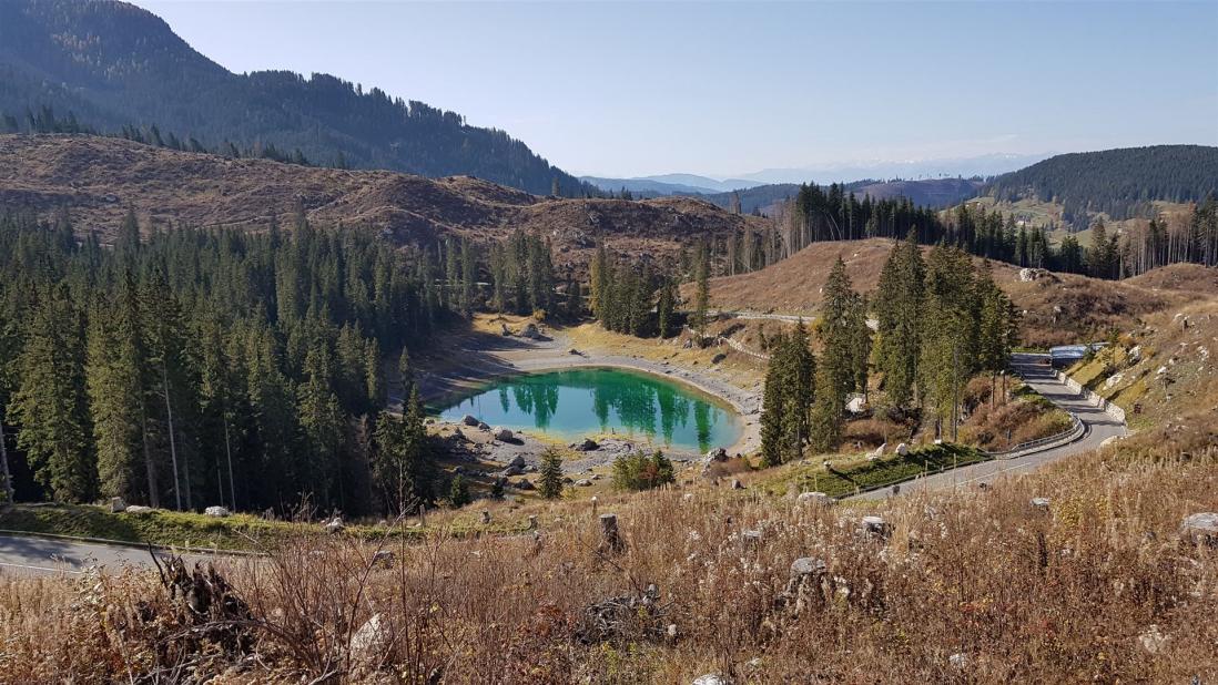 Der Karer See hatte im Herbst Niedrigwasser. Wenn man diese Pfütze sieht, kann man über den Hype nur den Kopf schütteln. Da lobe ich mir doch meinen Eibsee bei Grainau unterhalb der Zugspitze.