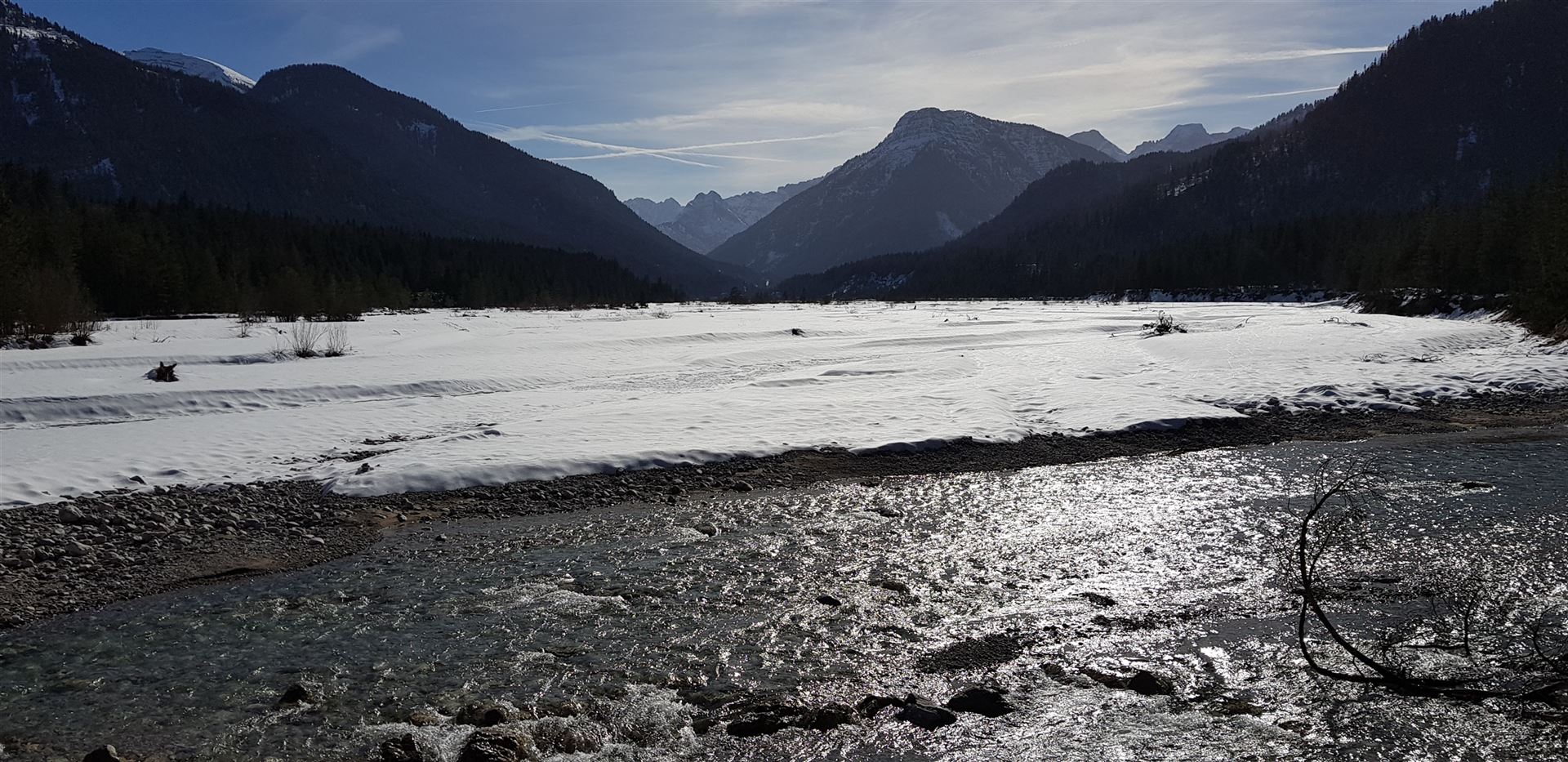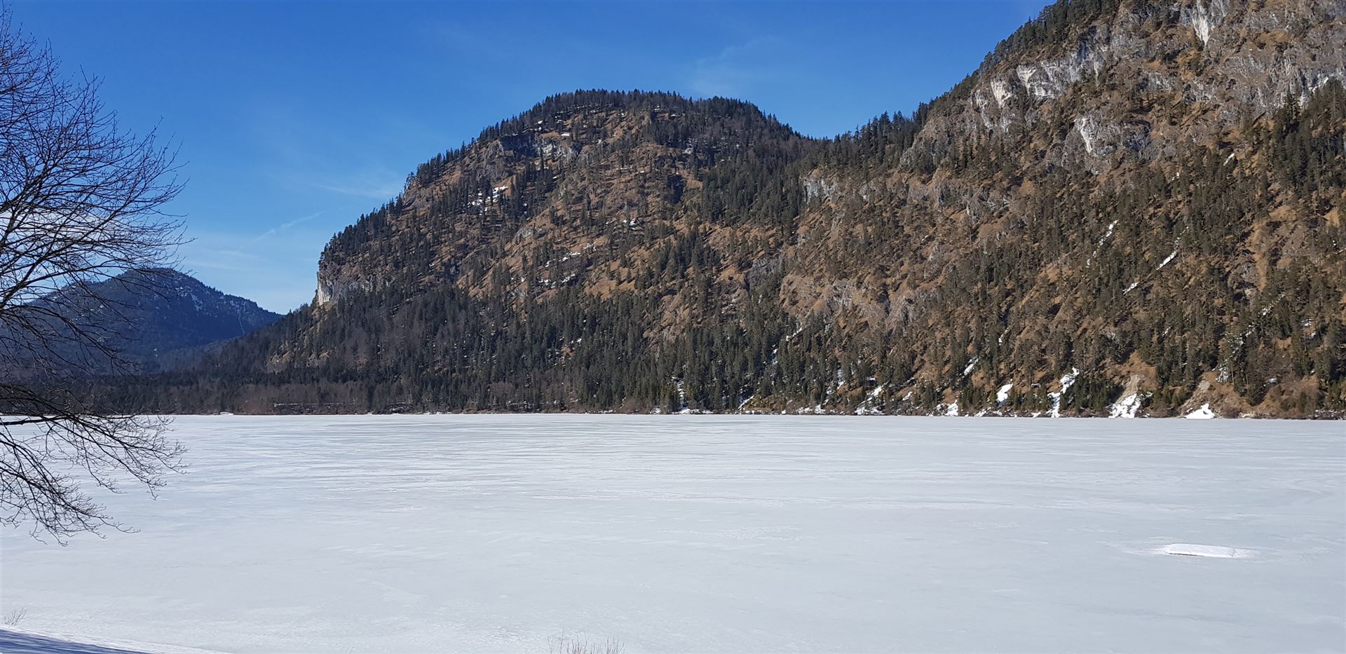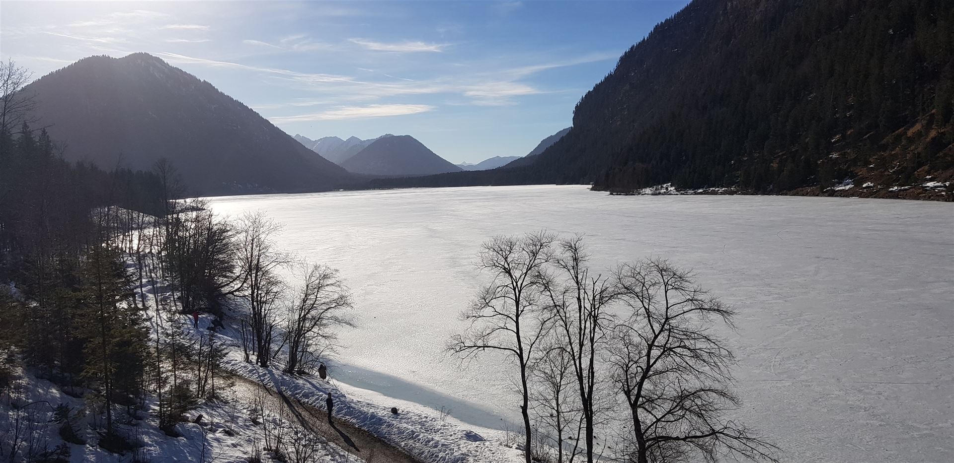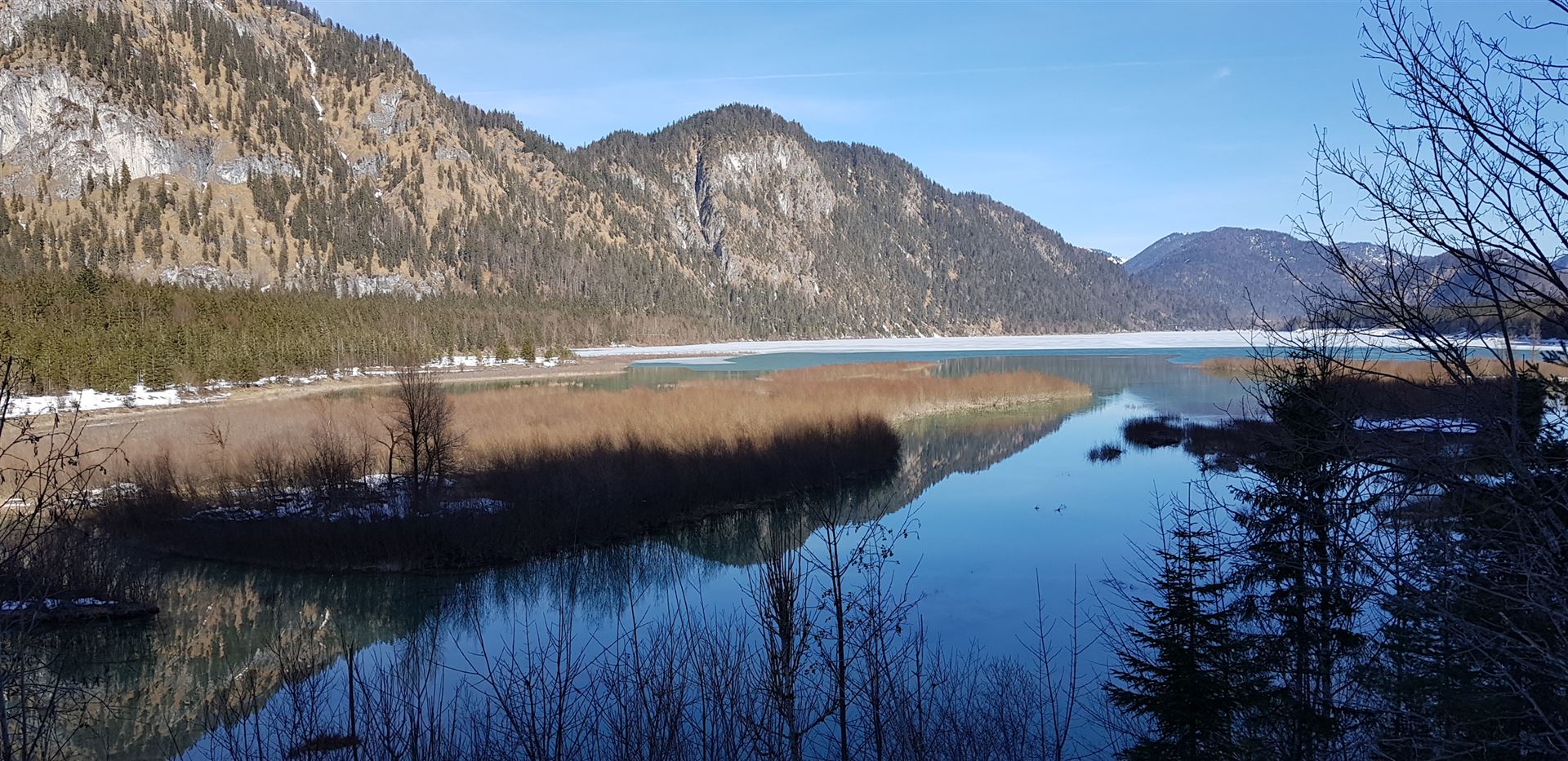 Am Sylvensteinspeicher habe ich versucht, bei Fall rechts um den See herum zu fahren. Kurz bevor ich die B307 erreichen konnte, blieb ich jedoch im hohen Schnee stecken und musste komplett um den See herum zurück zur Faller-Klamm-Brücke fahren, um dann auf der Nordseite des Sees die wenigen Kilometer bis zur Staumauer und weiter nach Lenggries zu fahren. Das hat viel Zeit gekostet. Im Video 1 ist der anstrengende Abstecher sehr schön nachvollziehbar. Aber es war auch sehenswert.