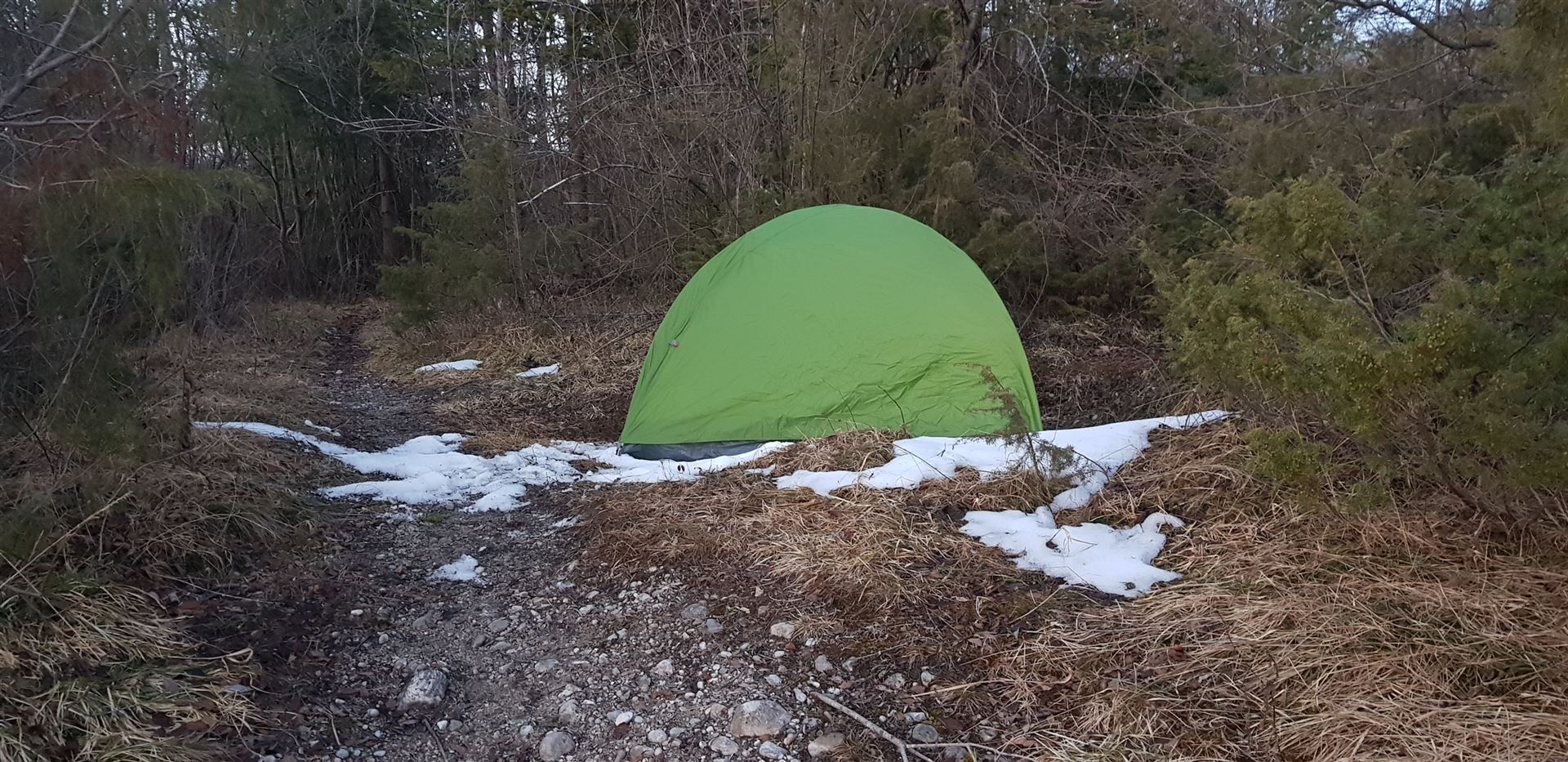 Die Nacht war lang und bei null Grad war der leichte Schlafsack grenzwertig. In Zukunft muss ich mir etwas zum Lesen mitnehmen. Denn im Zelt kann es schon einmal langweilig werden. Nervig ist es auch, wenn man bei dieser Kälte nachts zum Pinkeln raus muss. Die Kälte trägt natürlich dazu bei, dass man die Nacht nicht durchhält.