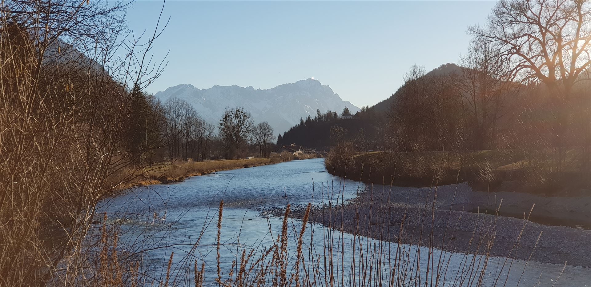 Bei Königsdorf: Blick über die Loisach zur Zugspitze