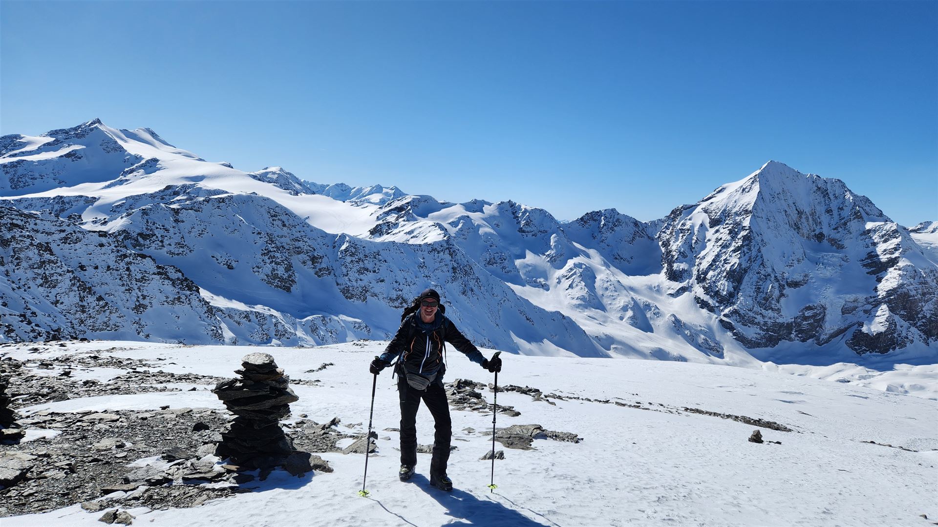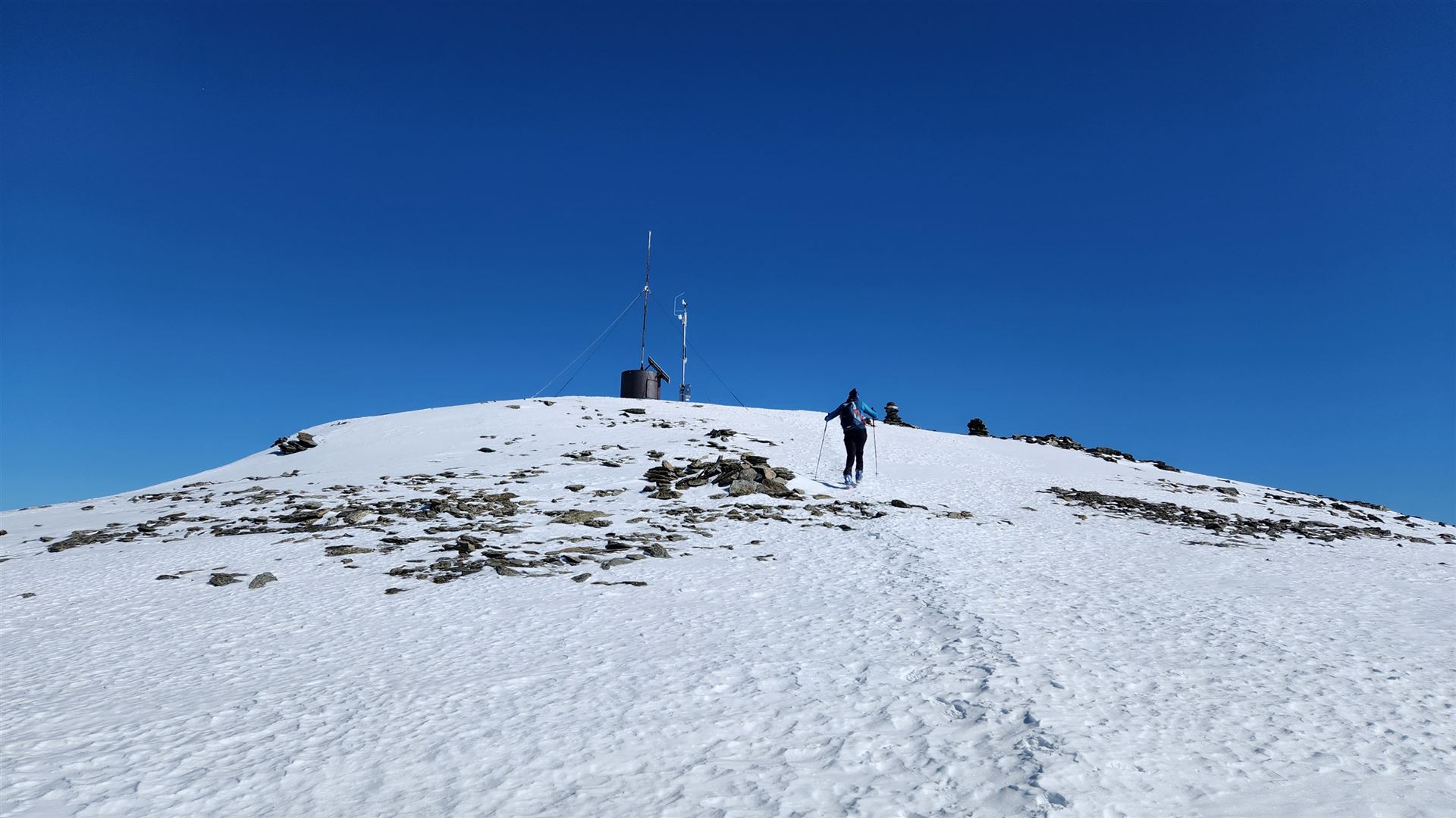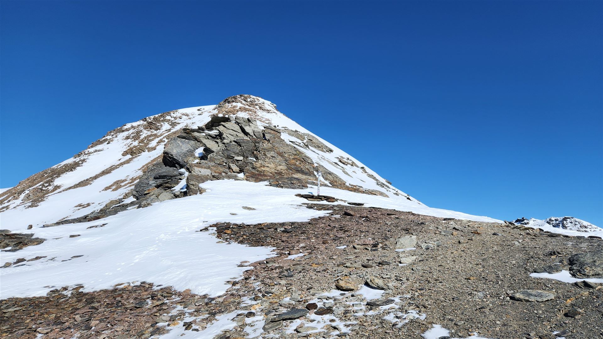 Vom Madritschjoch sind es dann nur noch wenige Meter bis zur Gipfelstation der Schöntaufbahn gewesen. Kurz hinter der Gipfelstation ließ ich die Ski stehen und stieg zu Fuß die letzten gut 100 Höhenmeter auf den höchsten Punkt. Dabei musste etwas gekraxelt werden, nicht schwierig, aber etwas aufpassen musste man schon. Der Gipfel selbst ist dann wieder relativ flach. Ein Gipfelkreuz gibt es nicht, nur Steinmandl und eine Wetterstation.