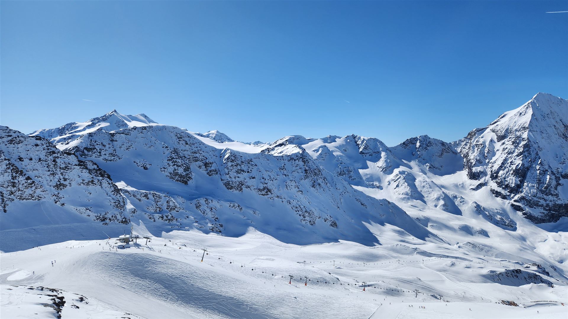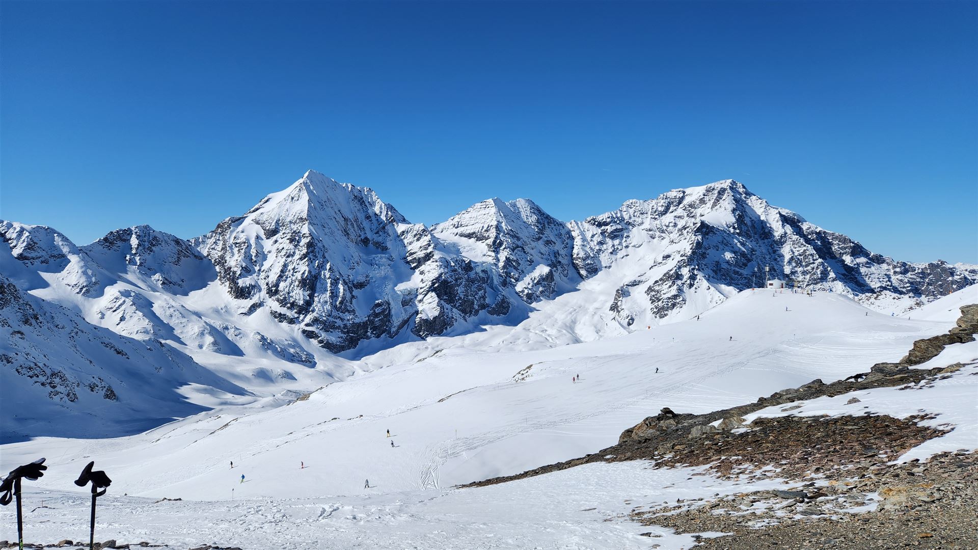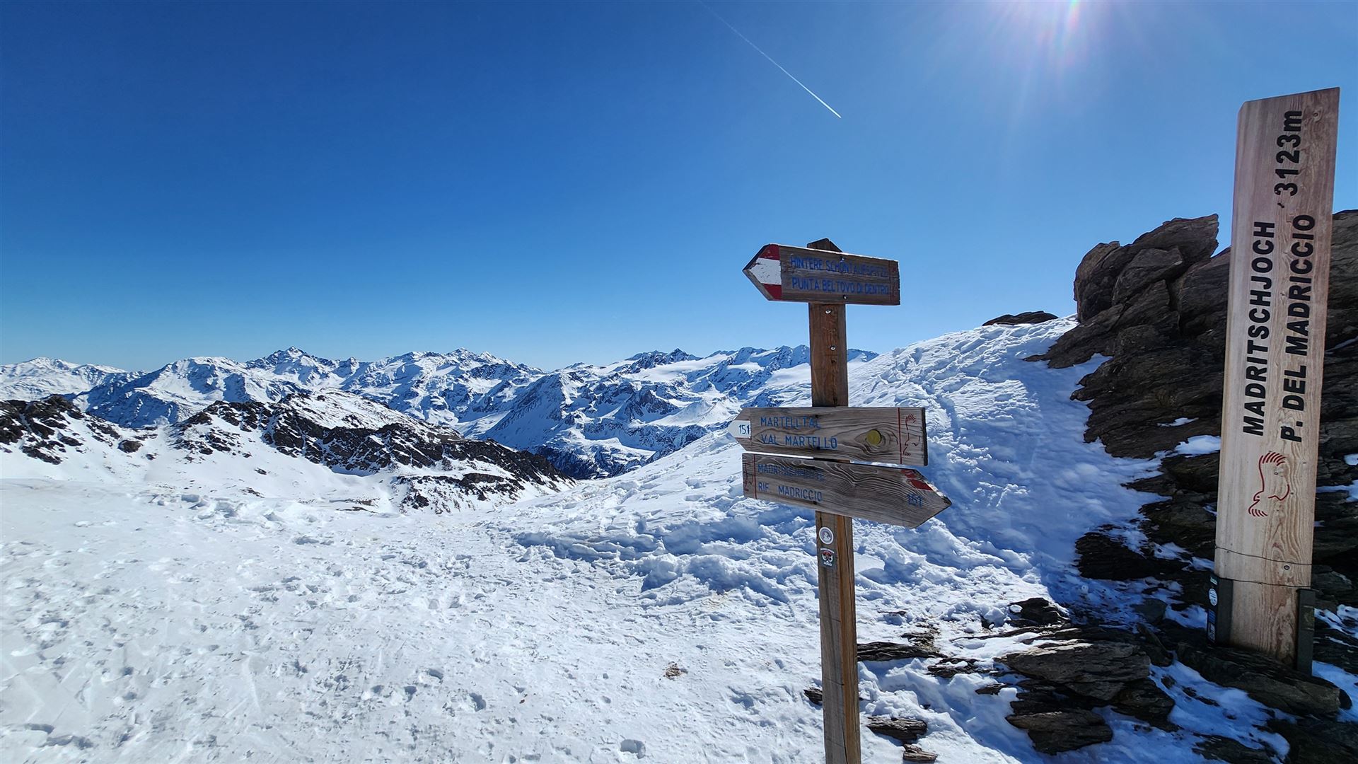 Nachdem ich gestern die spannende Skitour über den Suldenferner auf die Suldenspitze unternommen habe, ließ ich es heute mit einer Pistentour ohne Gletscherberührung auf die Hintere Schöntaufspitze ausklingen. Ausgangspunkt war wieder die Bergstation der Gondelbahn von Sulden. Die Tour führte nur wenige Meter am Madritschjoch vorbei. Das ließ ich mir nicht entgehen, die paar Meter aufzusteigen, um über das Joch blicken zu können. Denn das Madritschjoch ist einer der bekanntesten Übergänge für Alpenüberquerungen mit dem Mountainbike. Zwar bin ich selbst dort noch nicht mit dem Mountainbike gewesen, aber jetzt kenne ich das Madritschjoch eben auf andere Weise. Der höchste Pass, den ich bisher mit dem Mountainbike überquert habe, war der Fimberpass von Ischgl über die Heidelberger Hütte ins Engadin (Tag 3 der Alpenüberquerung).