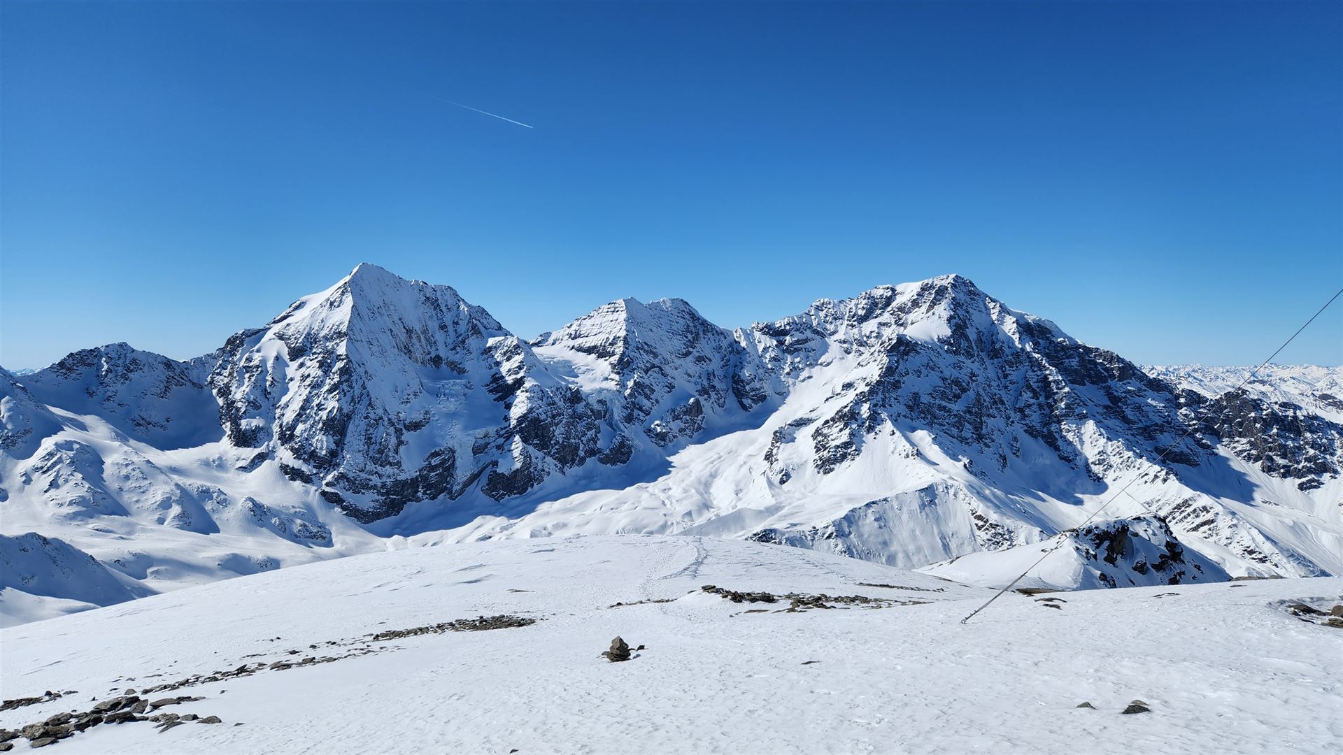 Vom Gipfel reichte der Blick natürlich hinüber zur Suldenspitze und auf das Dreigestirn aus Königsspitze, Zebru und Ortler. In der Ferne waren auszumachen Peitlerkofel, Großglockner, Marmolada, Olperer, Hochfeiler, Hohe Gaisl und die Tofana die Mezzo.