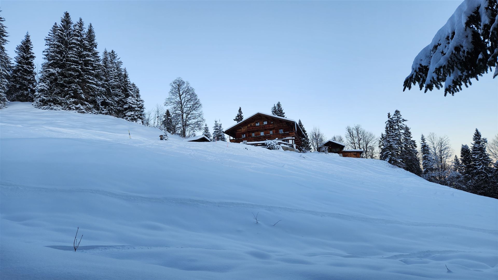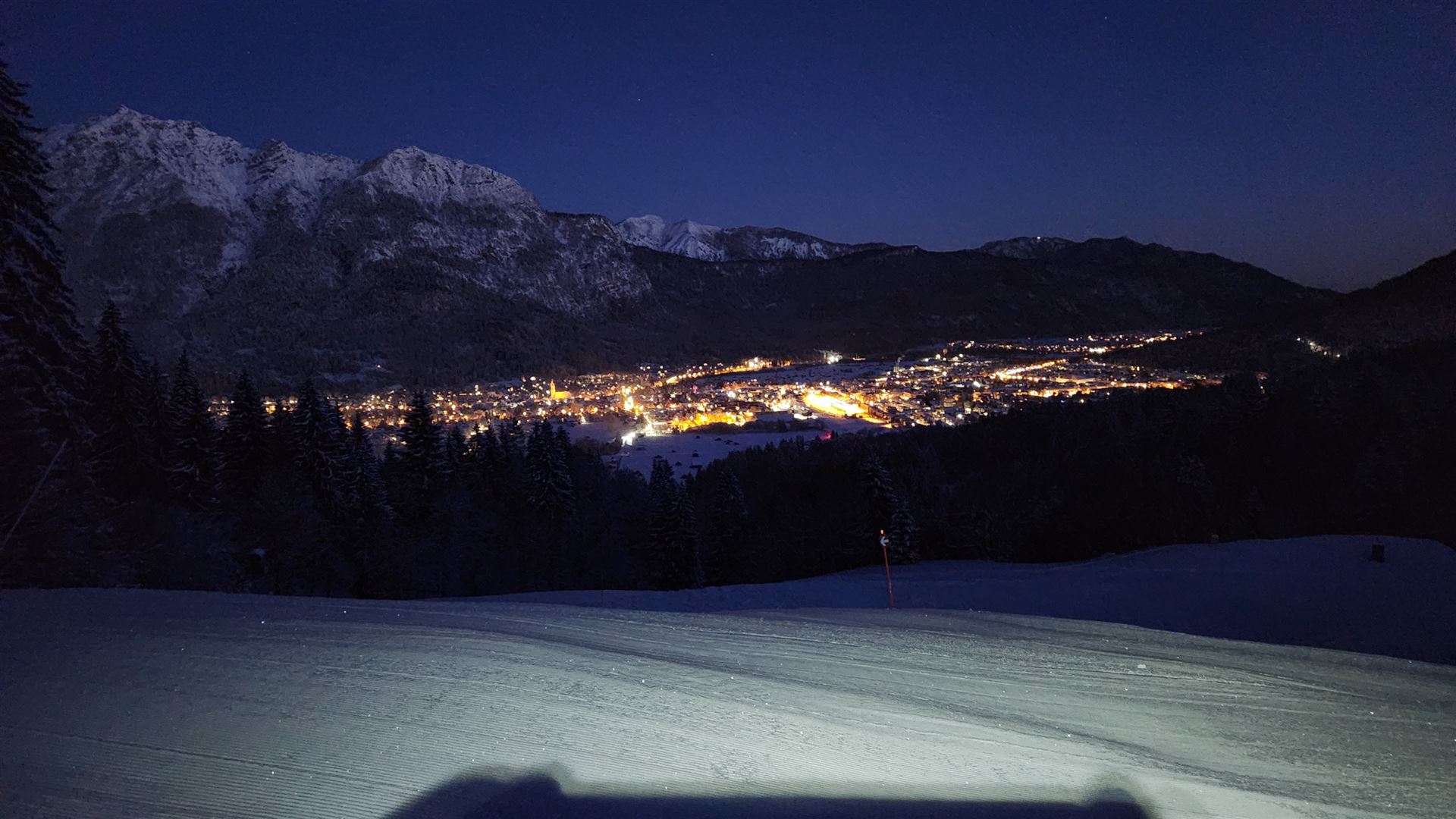Als ich startete, war es noch stockdunkel. Üblicherweise führt diese Skitour am Garmischer Hausberg von der Hausberg-Talstation (Parkgebühr 5 Euro) ein Stück über die schwarze Horn-Abfahrt hinauf und dann nach rechts zur Tonihütte. An diesem Morgen liefen allerdings an der Horn-Abfahrt noch die Schneekanonen und die Piste war gesperrt. Nach links entlang der Kochelberg-Abfahrt war es dagegen ruhig und so wählte ich zunächst diesen Weg entlang der Piste. Irgendwann wird der Kochelberg aber auch richtig steil und so wechselte ich nach links auf den Weg zum Bayernhaus. Dabei handelt es sich auch um die Rodelabfahrt. Es lag jedoch so viel Schnee auf dem Weg, dass man mit einem Schlitten steckengeblieben wäre. Für den Aufstieg mit den Tourenski war es dagegen optimal. Natürlich kannte ich den Weg aus dem Sommer, bin ich doch schon zigmal zum Bayernhaus gelaufen.