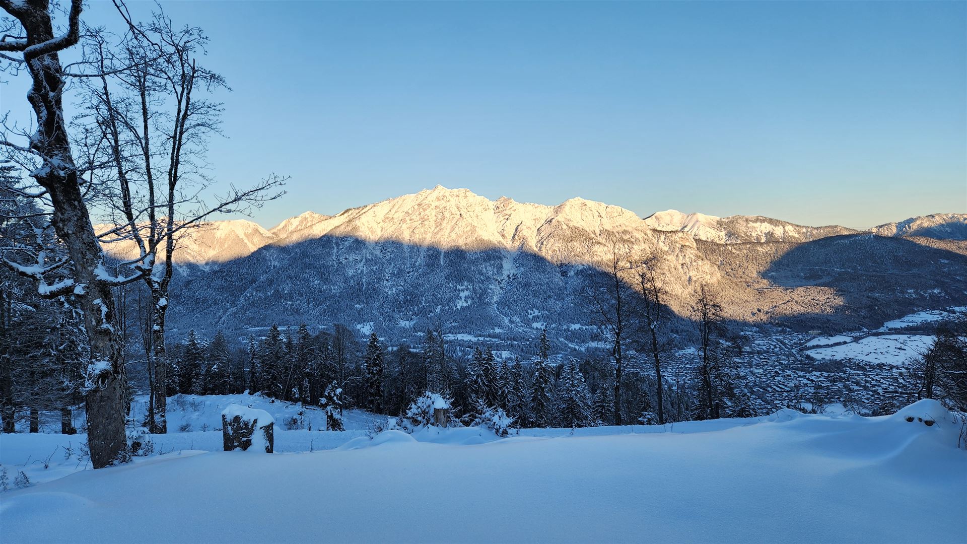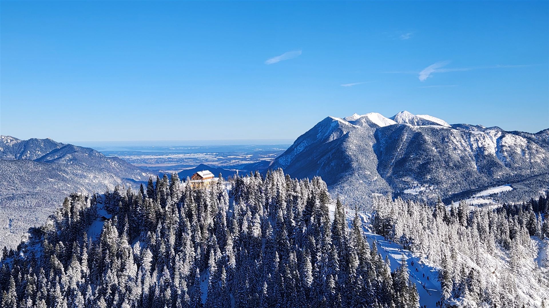 Nach Norden schweift der Blick über die Ammergauer Alpen, insbesondere auf die Kramerspitze und den Krottenkopf.