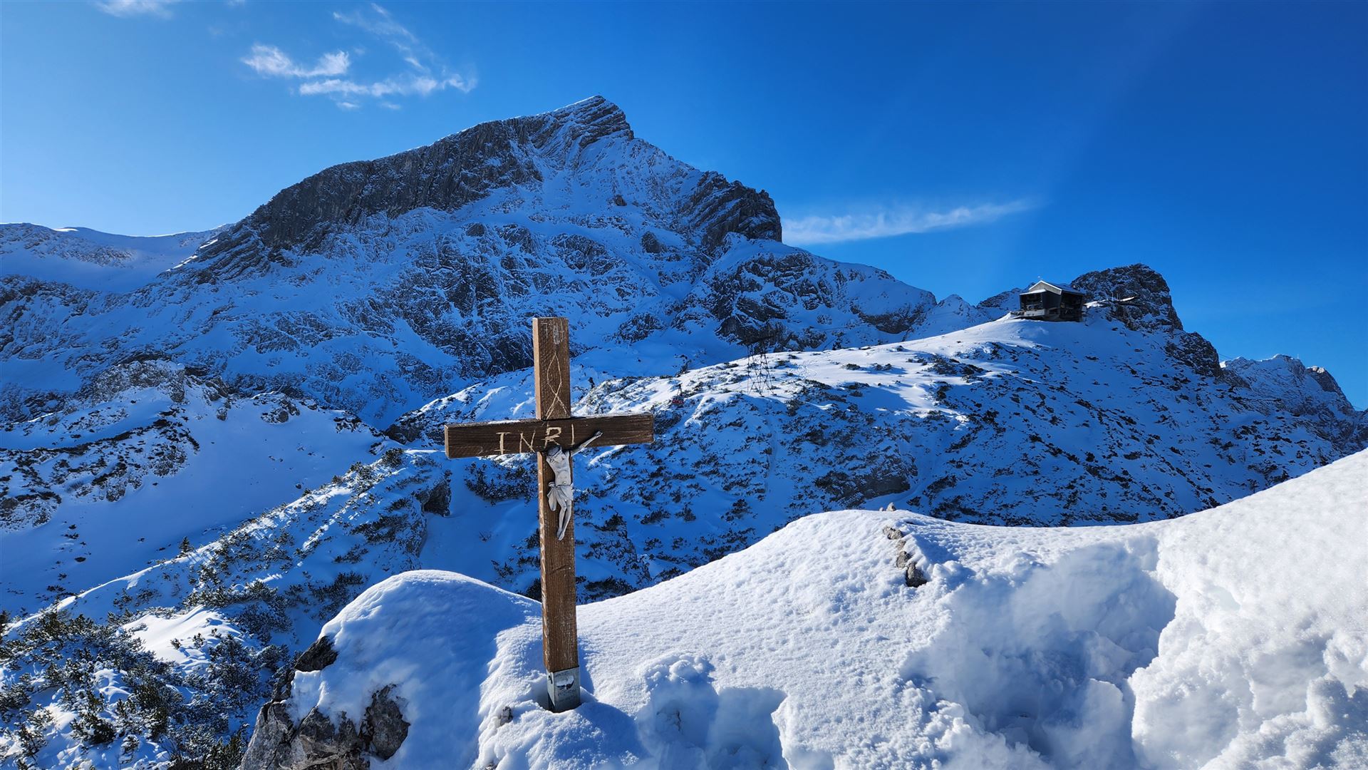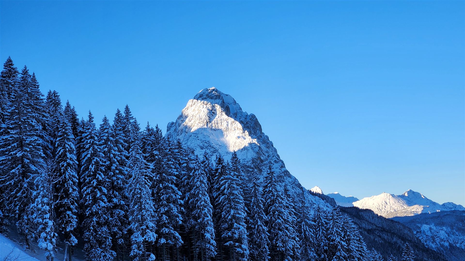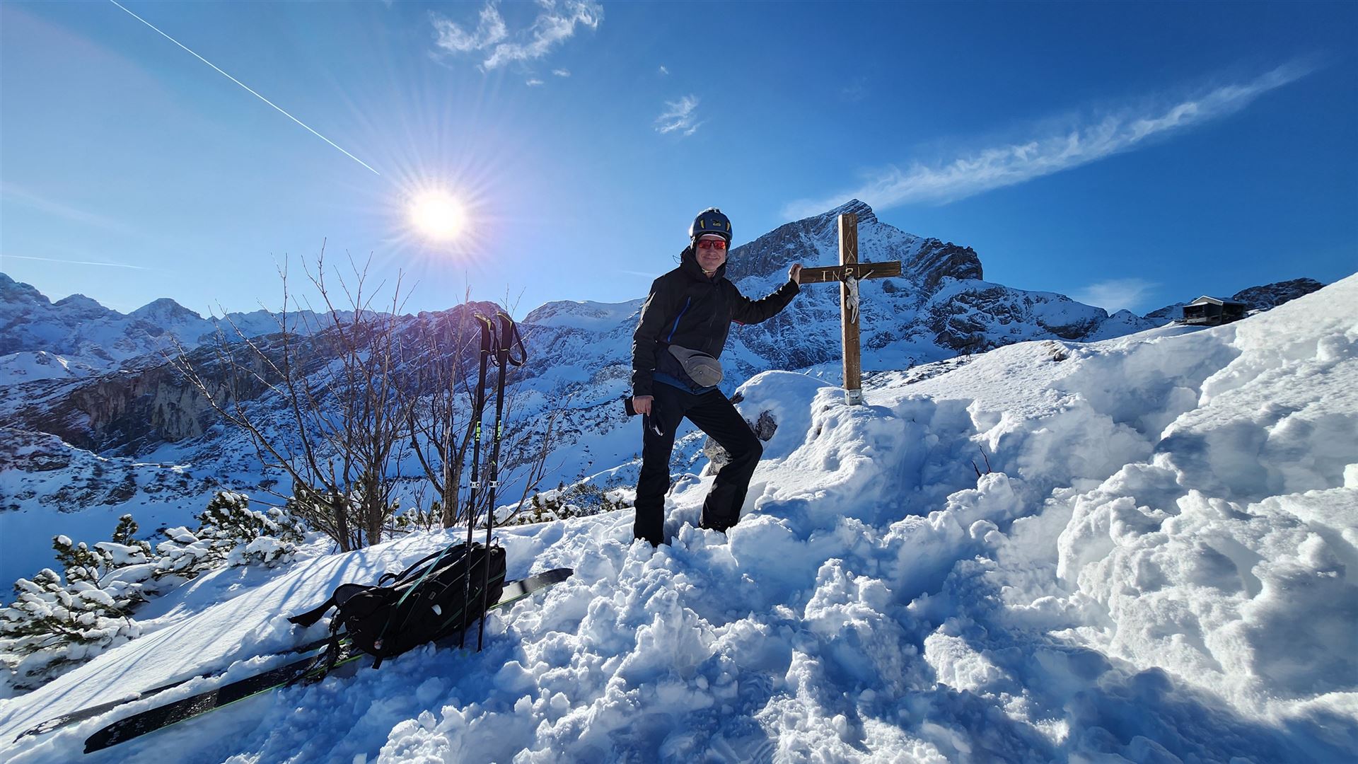 Nach dem Bayernhaus passierte ich noch die Hütte des Akademischen Gesangsvereins München (AGV). Von dort blickt man hinüber zur Partenkirchener Dreitorspitze und erreicht kurz darauf die Bergstation der Hausbergbahn bzw. die Talstation des Kreuzwankl-Lifts. Nach der Querung zum Trögllift, traf ich dort auf die übliche Aufstiegsroute von der Tonihütte. Dabei war es sogar möglich, der Piste durch den Wald auszuweichen, damit echtes Skitouren-Feeling aufkommen konnte.
