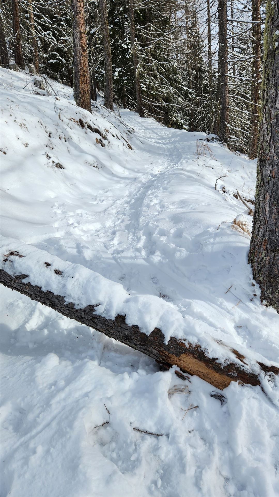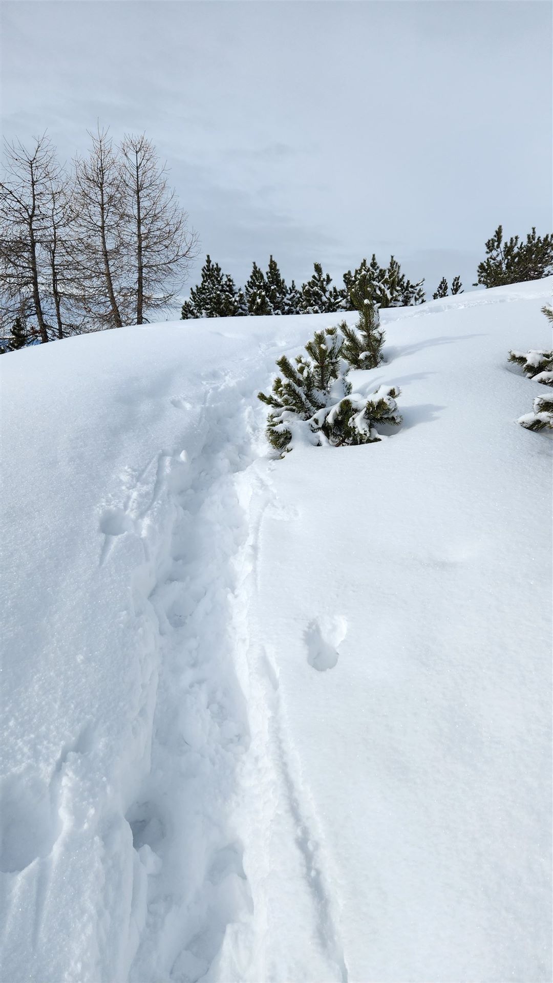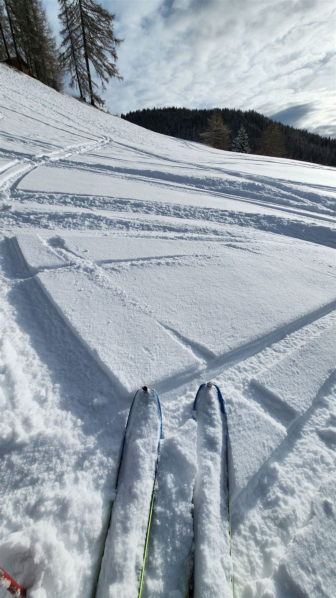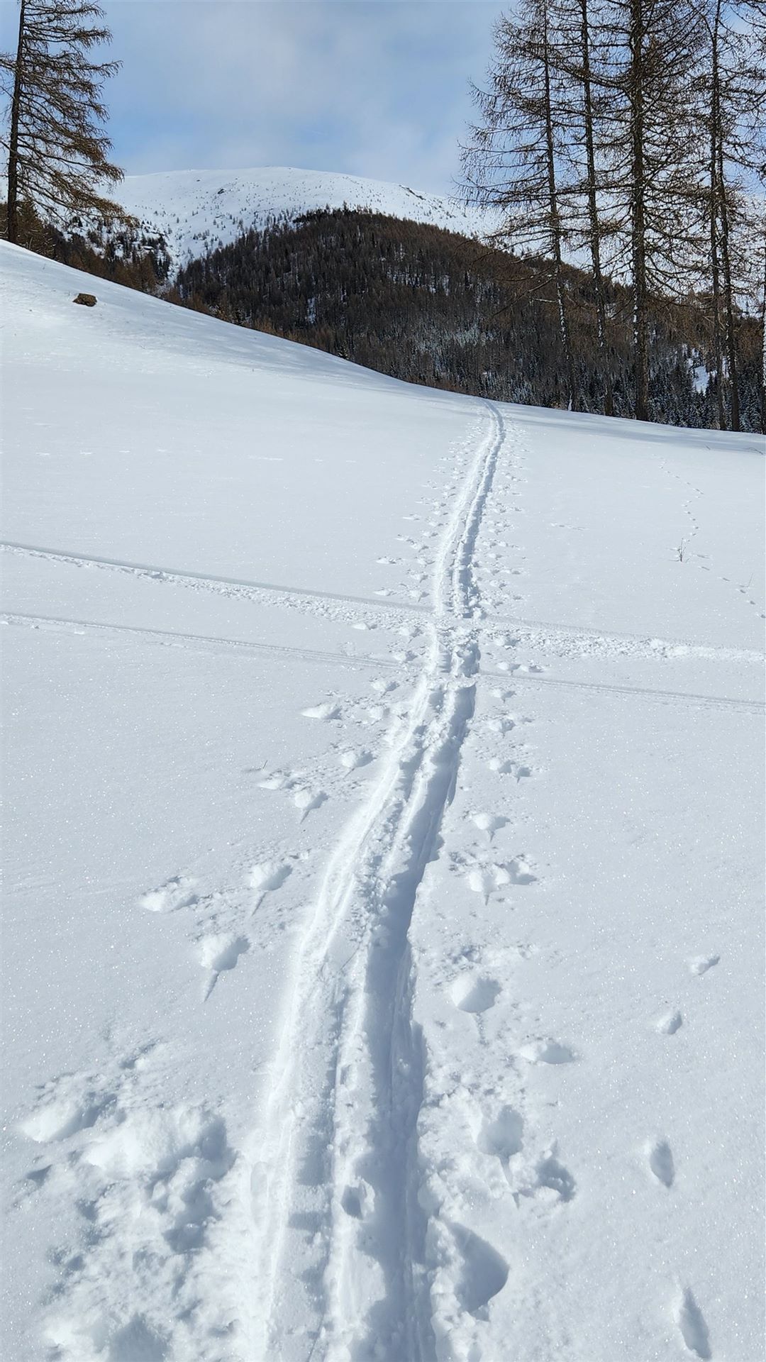 Da tauchte plötzlich doch noch ein weiterer Tourengeher am Gipfel auf und der kannte die Örtlichkeit. Er wusste, dass der unberührte Hang im Osten fahrbar war und auch auf den Ziehweg zum Skigebiet führt. Lawinengefahr herrschte keine und so kam ich unerwartet in den Genuss einer zwar kurzen, aber von den Konditionen her perfekten Tiefschneeabfahrt.
