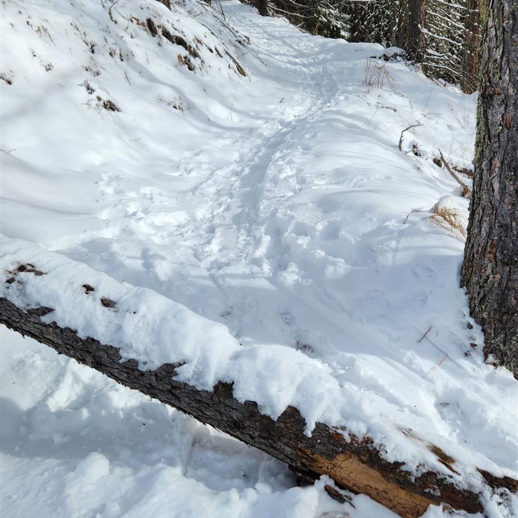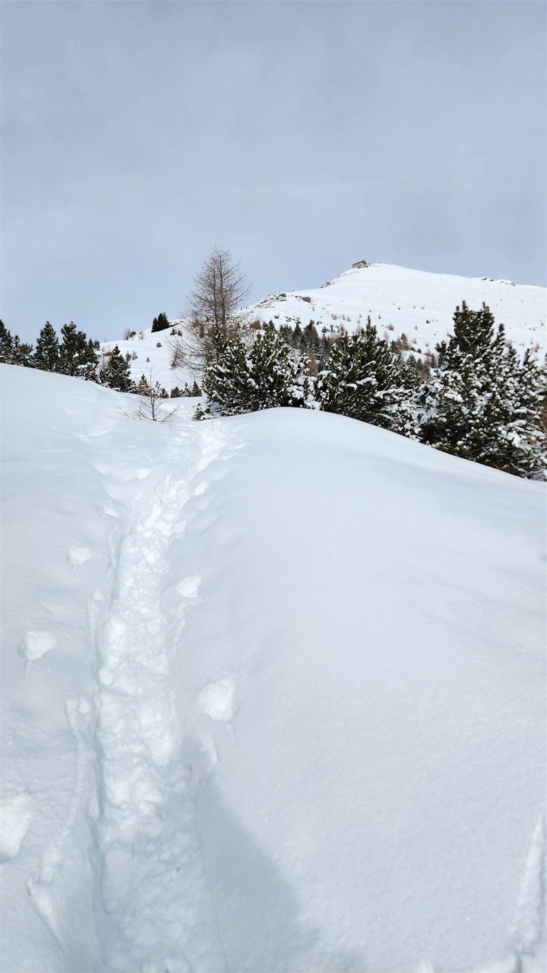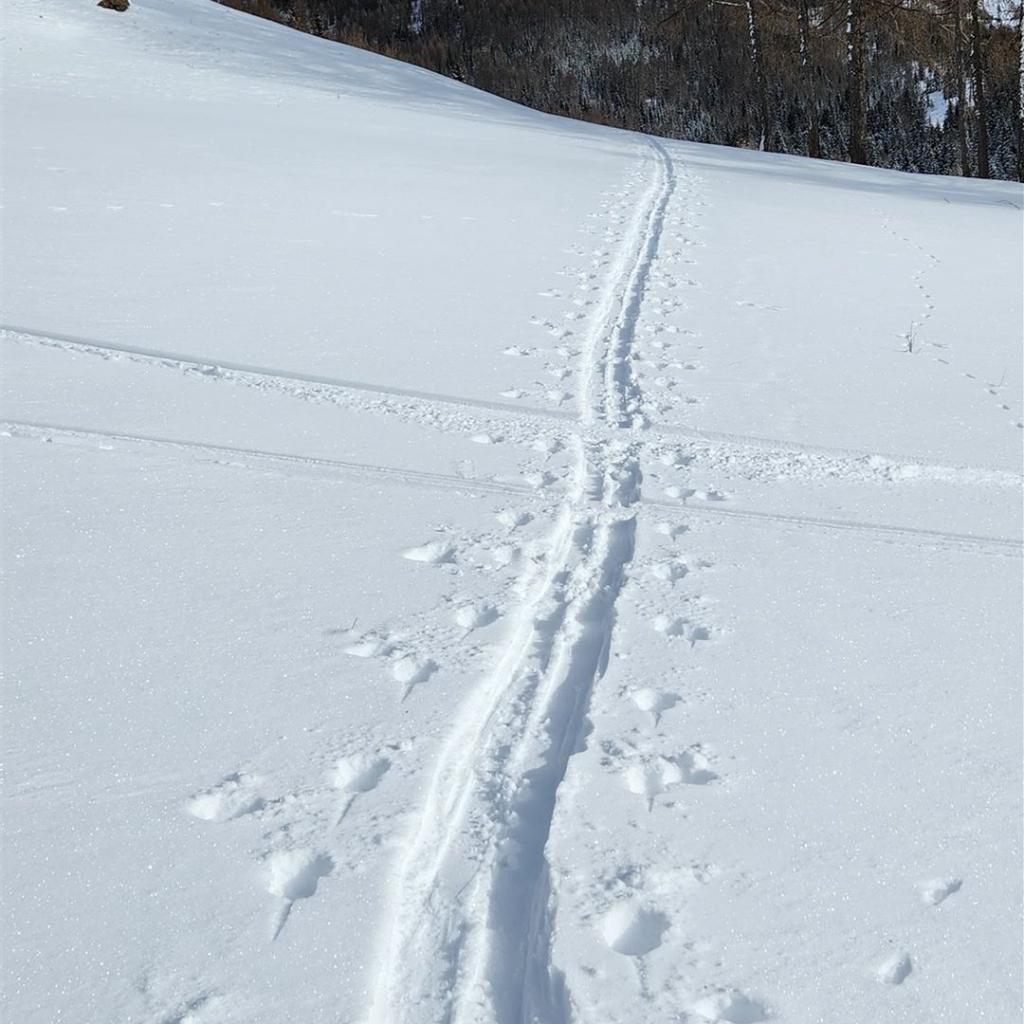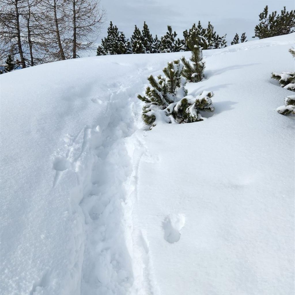 Da tauchte plötzlich doch noch ein weiterer Tourengeher am Gipfel auf und der kannte die Örtlichkeit. Er wusste, dass der unberührte Hang im Osten fahrbar war und auch auf den Ziehweg zum Skigebiet führt. Lawinengefahr herrschte keine und so kam ich unerwartet in den Genuss einer zwar kurzen, aber von den Konditionen her perfekten Tiefschneeabfahrt.